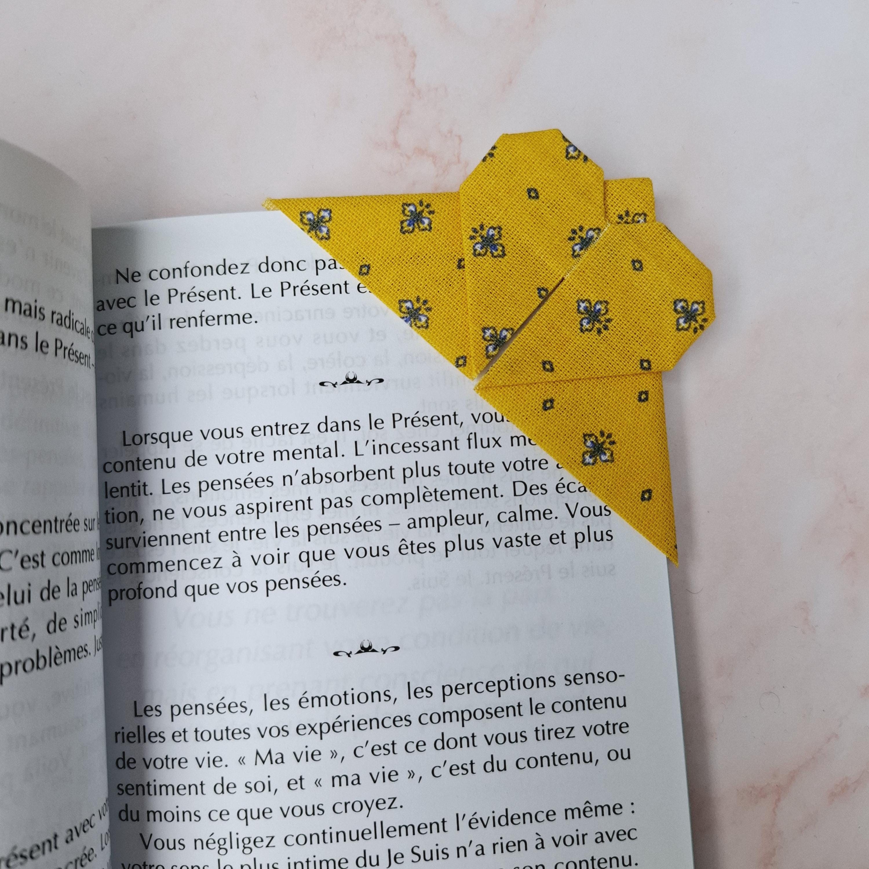 This heart-shaped origami fabric bookmark will please all book lovers and accompany them in their reading.