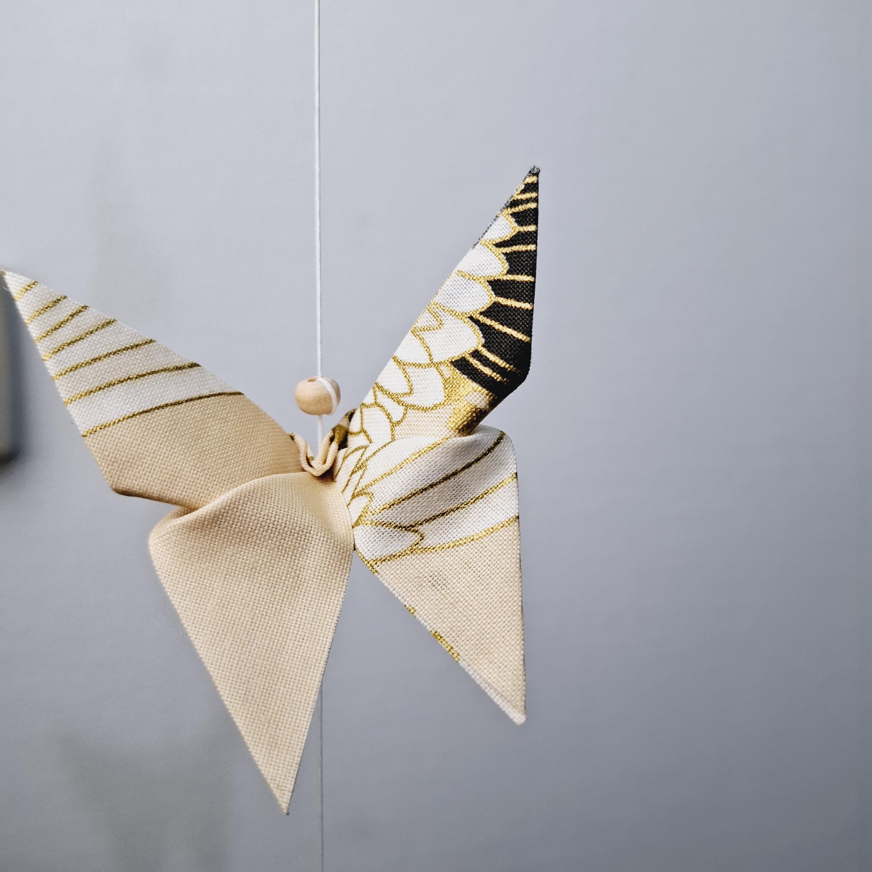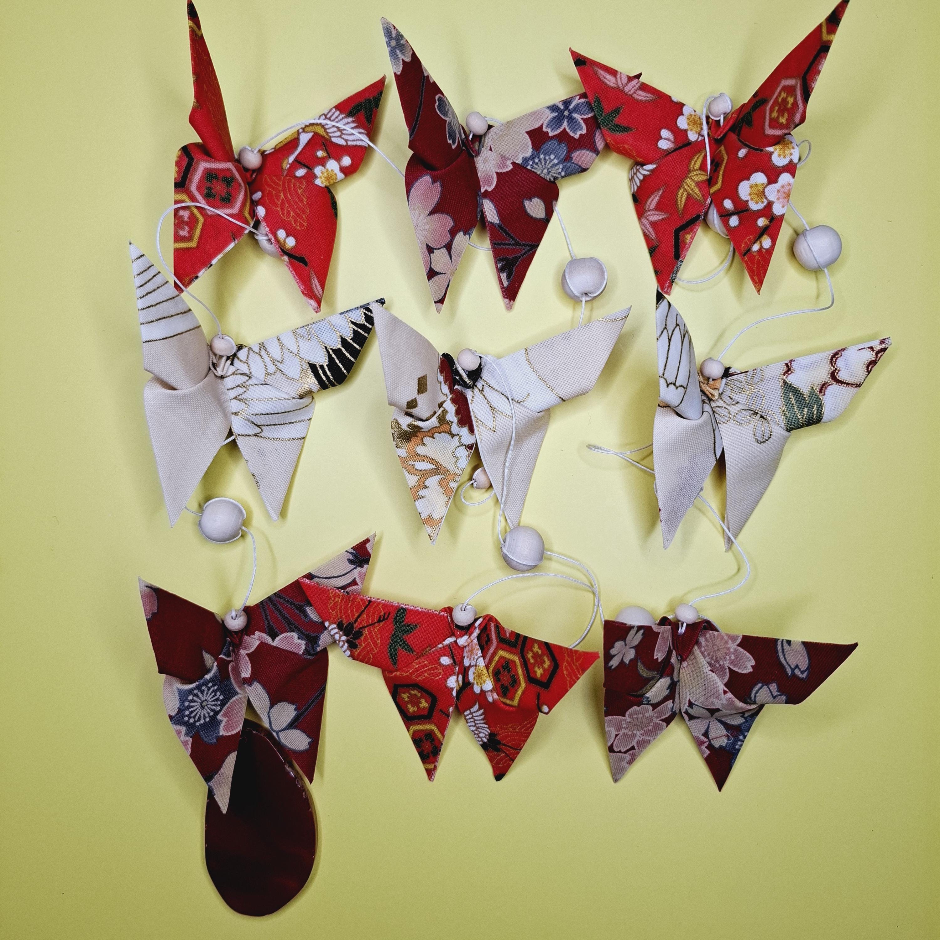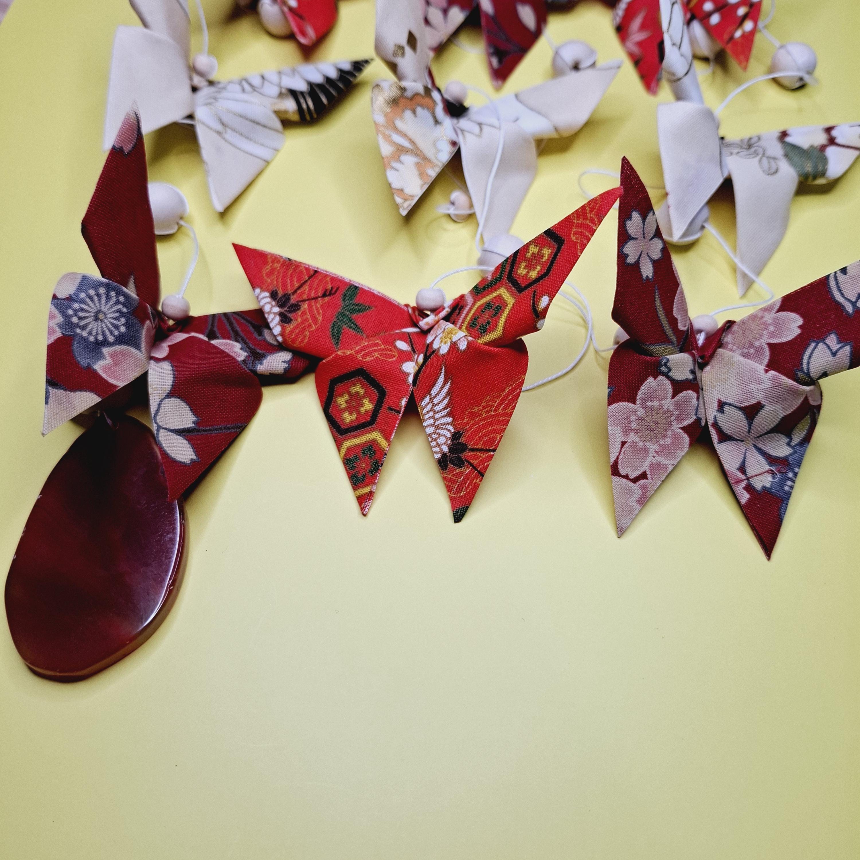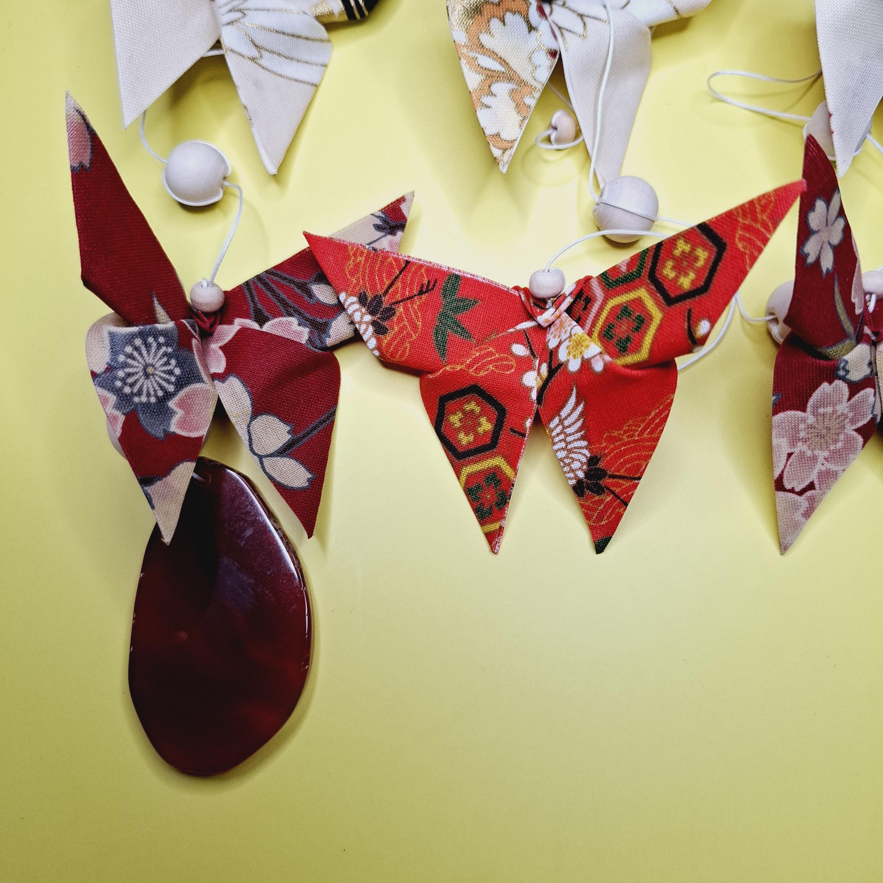 Let yourself be enchanted by this delicate origami fabric pendant, adorned with nine butterflies in shimmering colors.