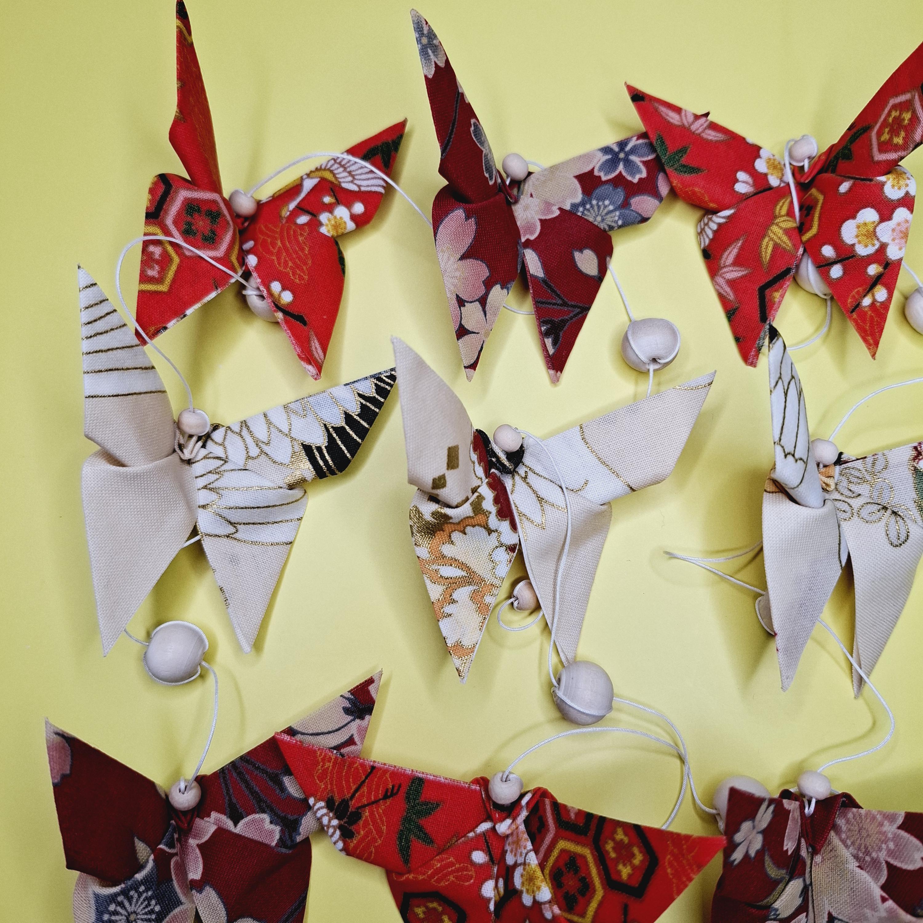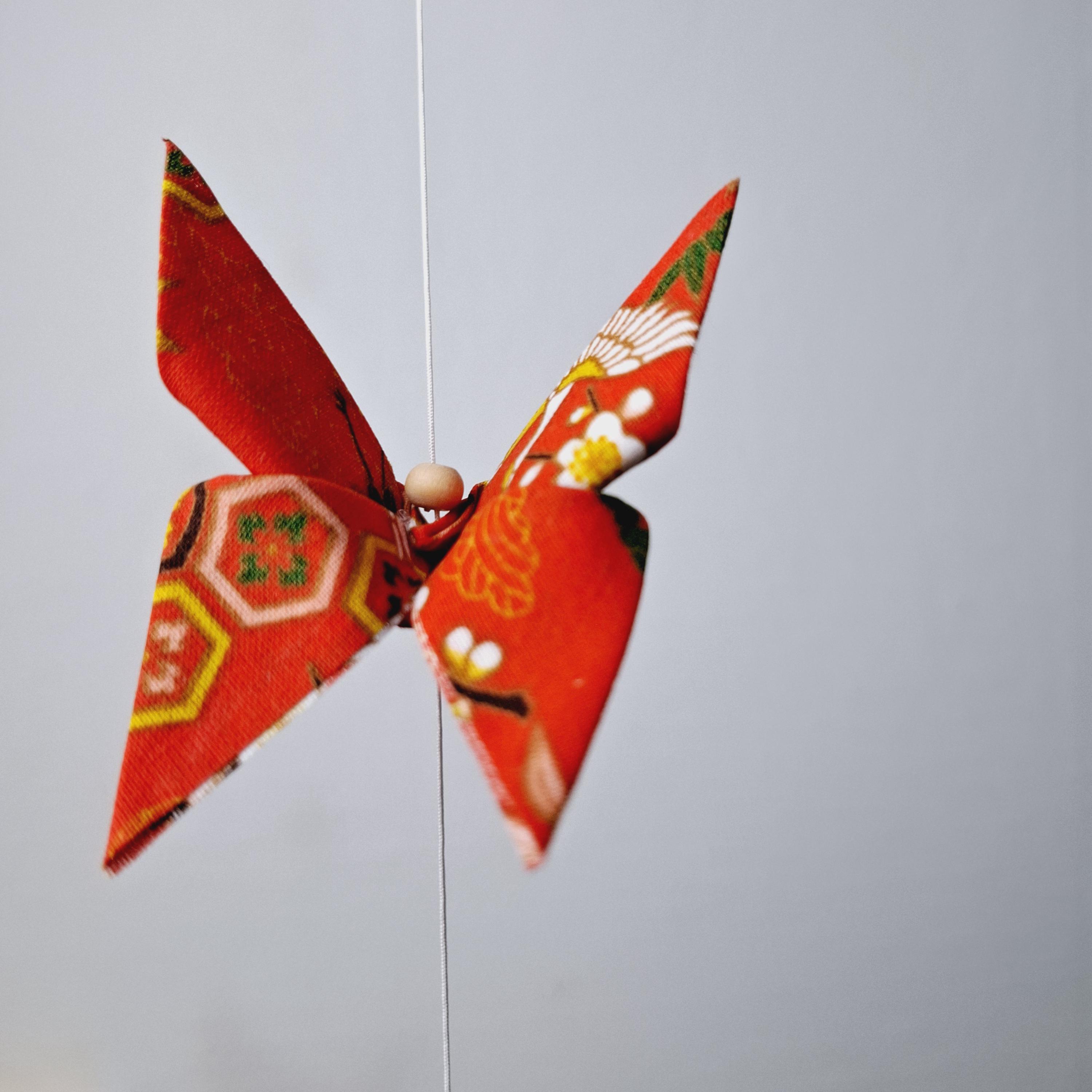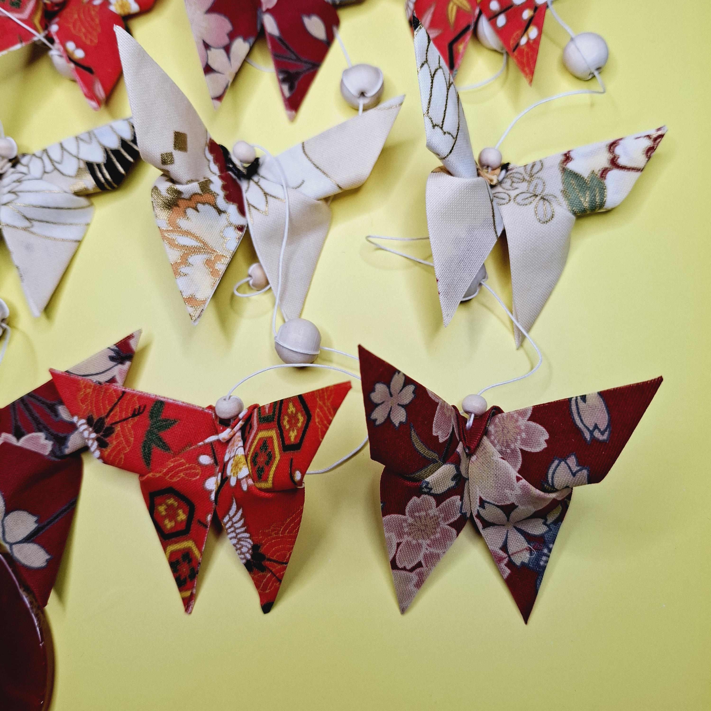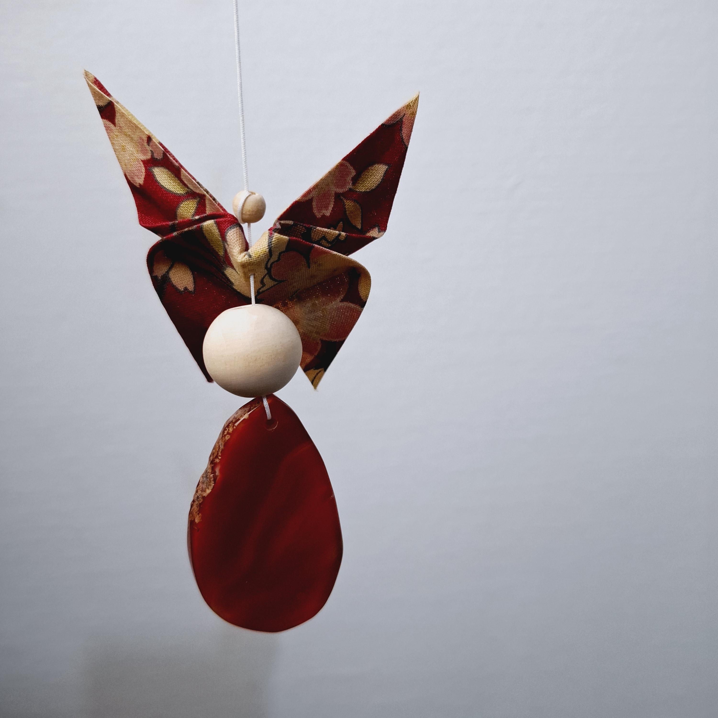 Let yourself be enchanted by this delicate origami fabric pendant, adorned with nine butterflies in shimmering colors.