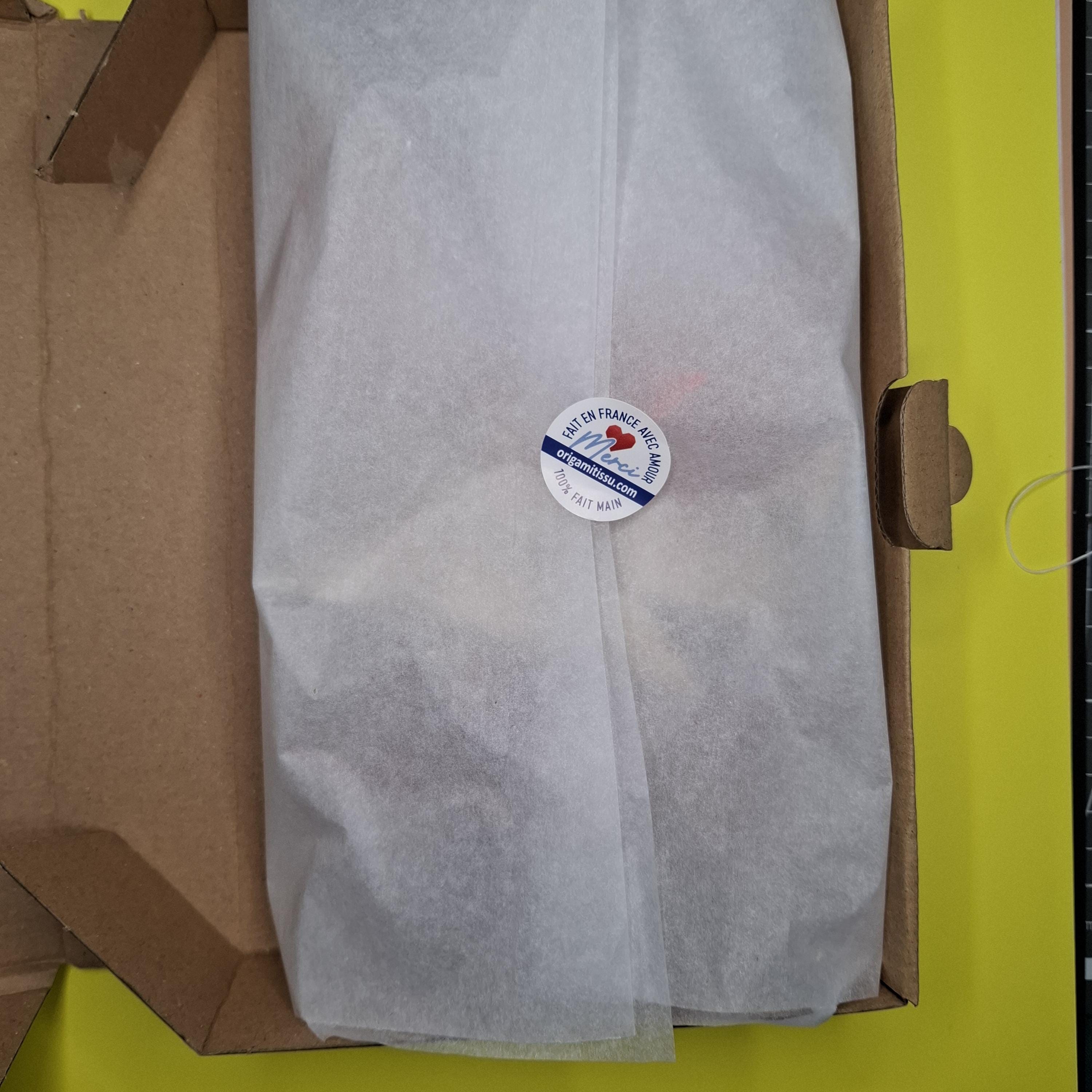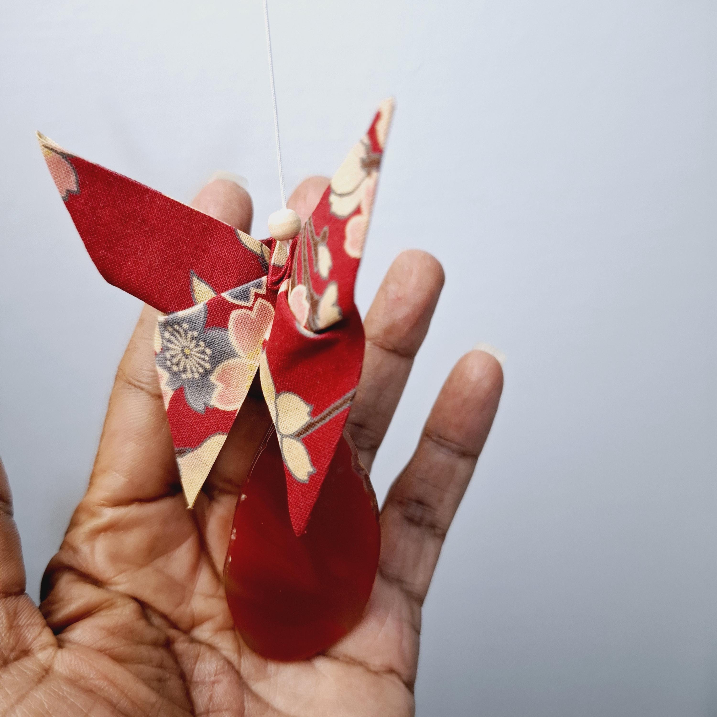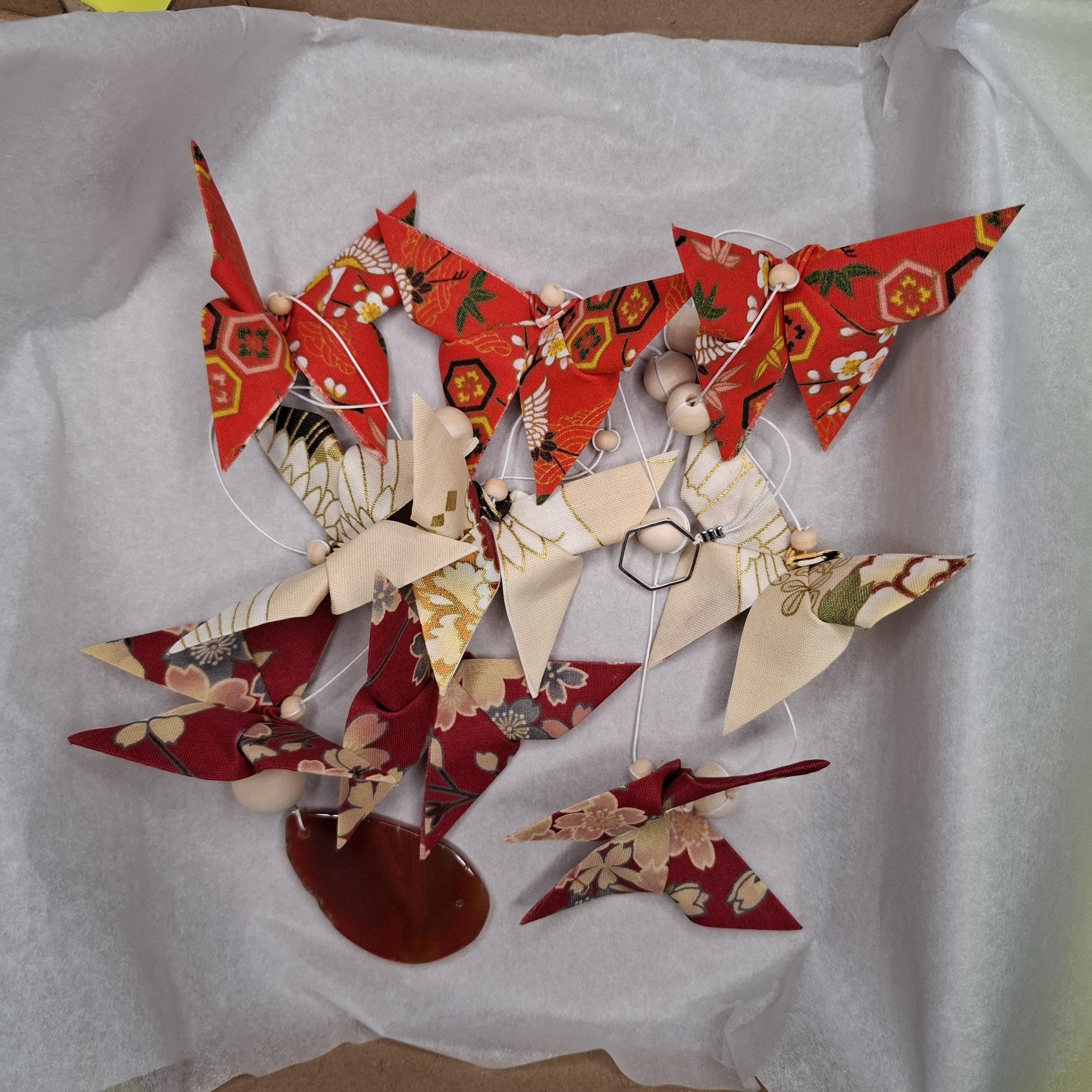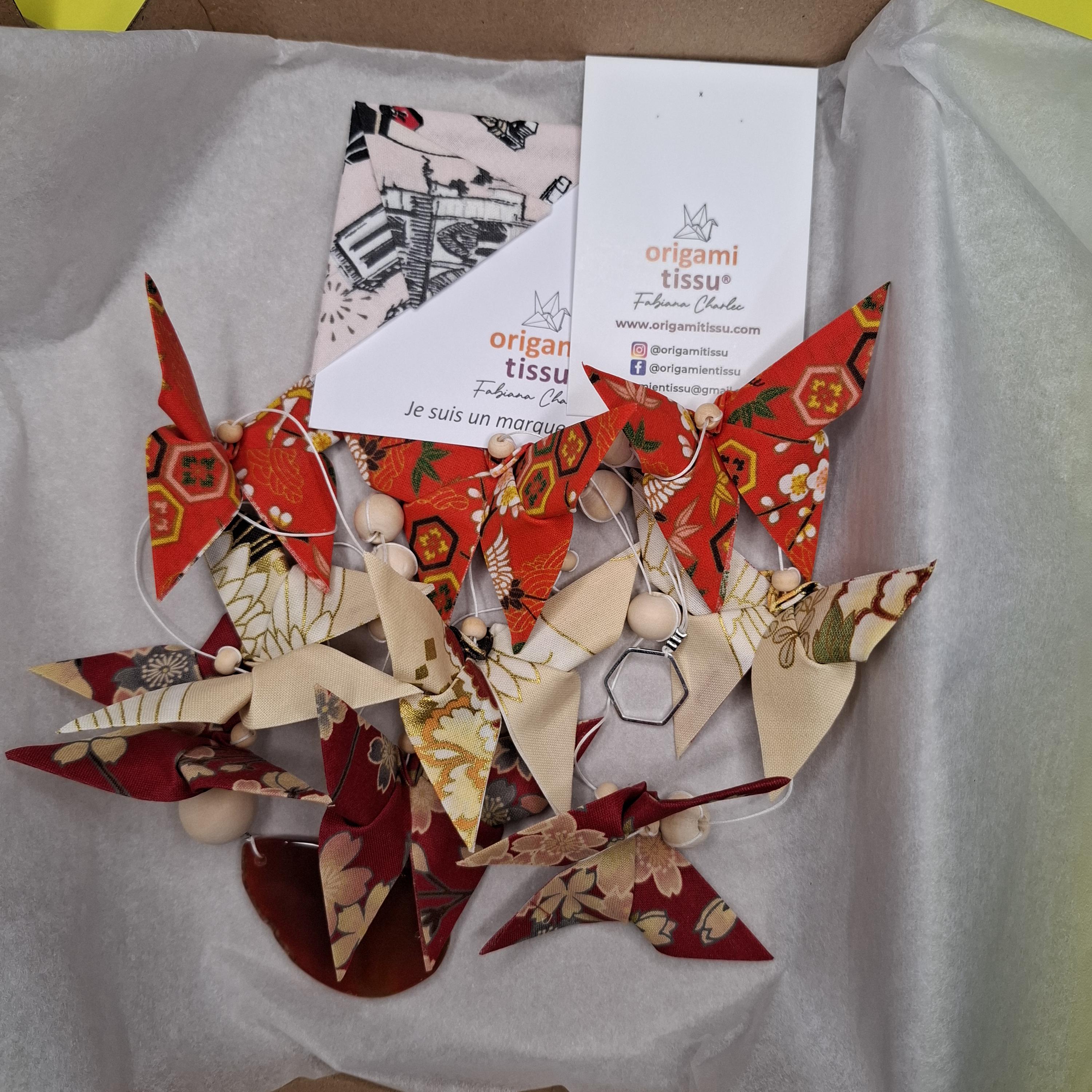 Let yourself be enchanted by this delicate origami fabric pendant, adorned with nine butterflies in shimmering colors.