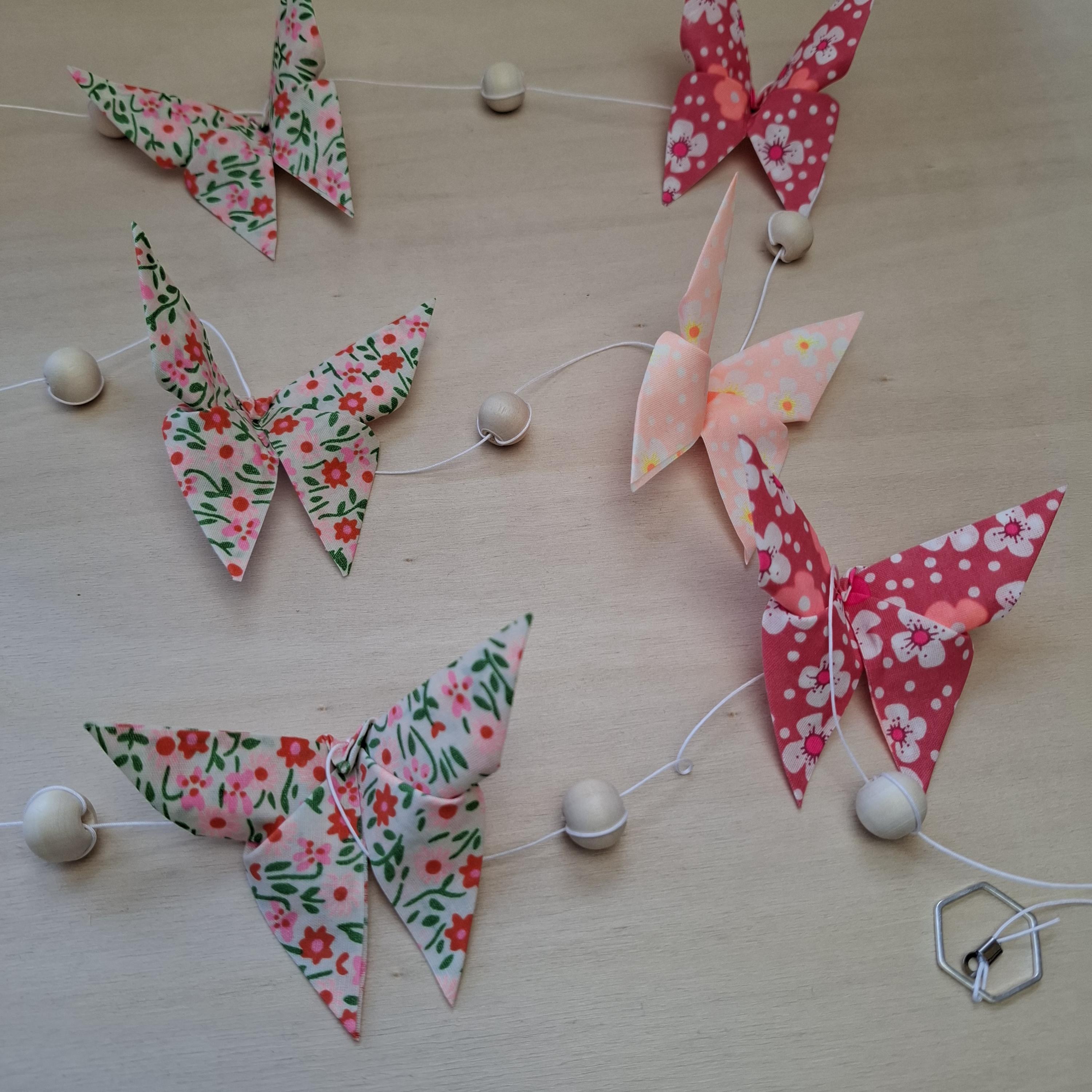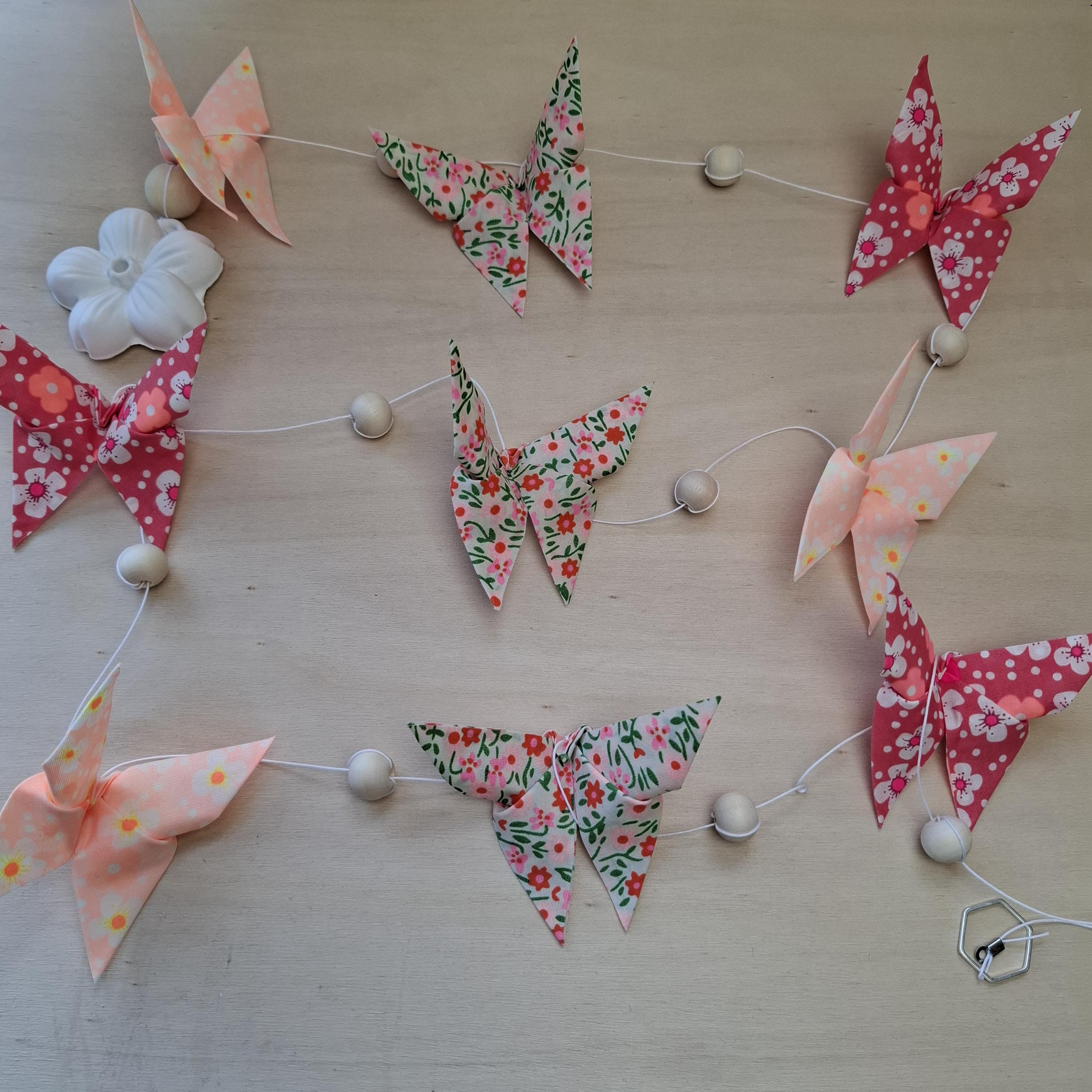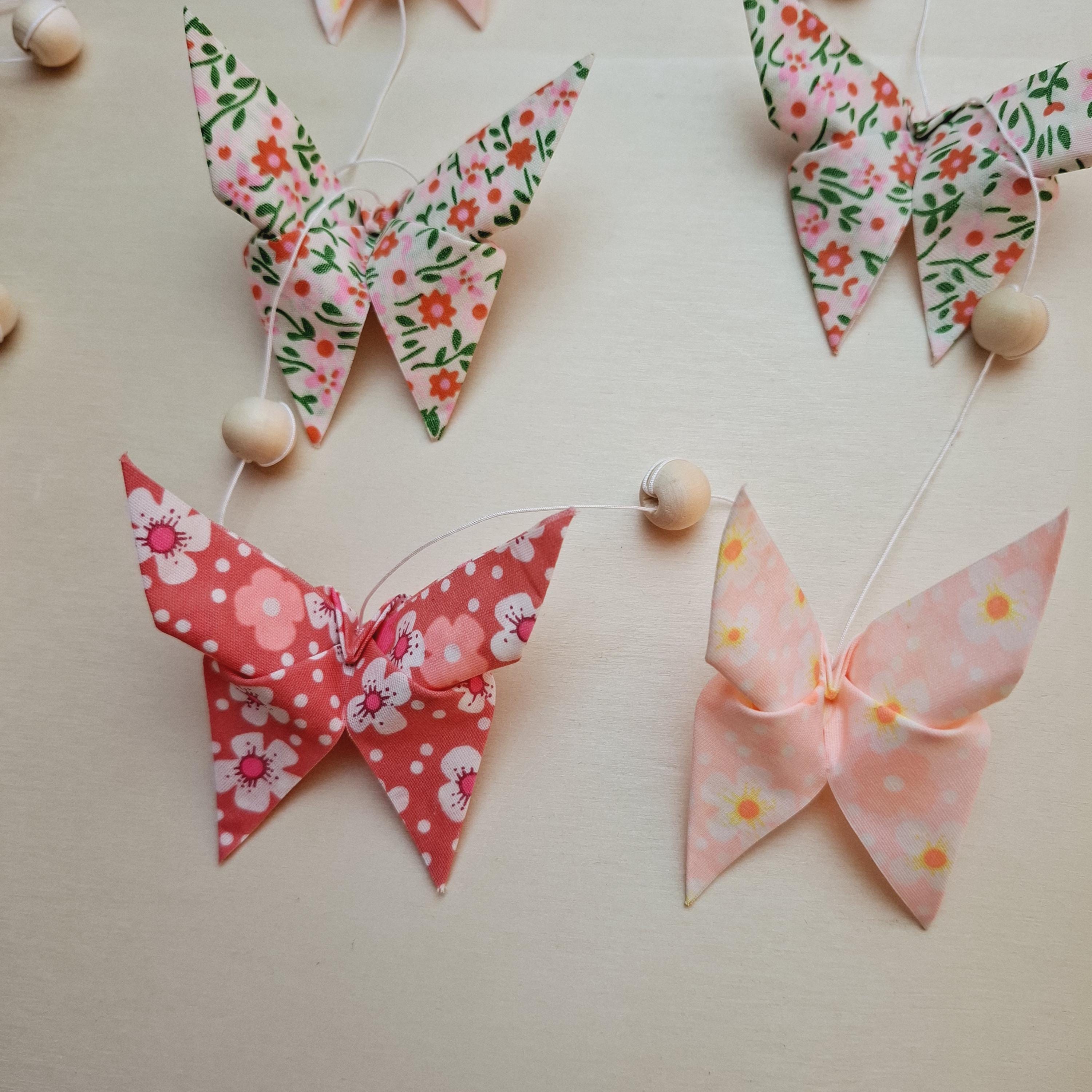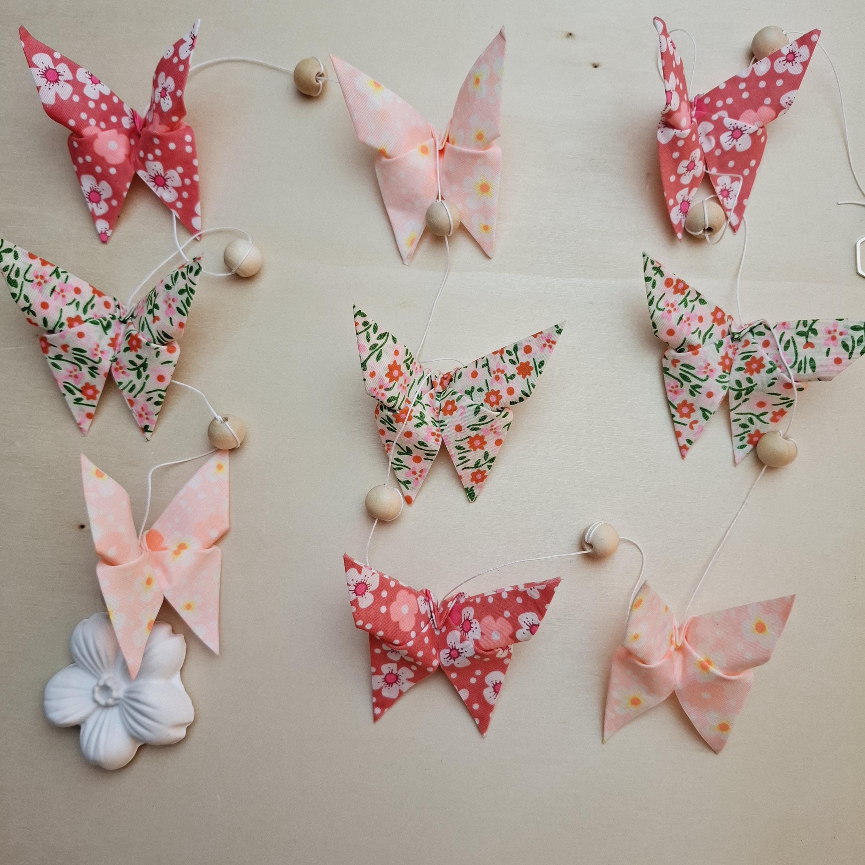 Let yourself be enchanted by this delicate origami fabric pendant, adorned with nine butterflies in shimmering colors.