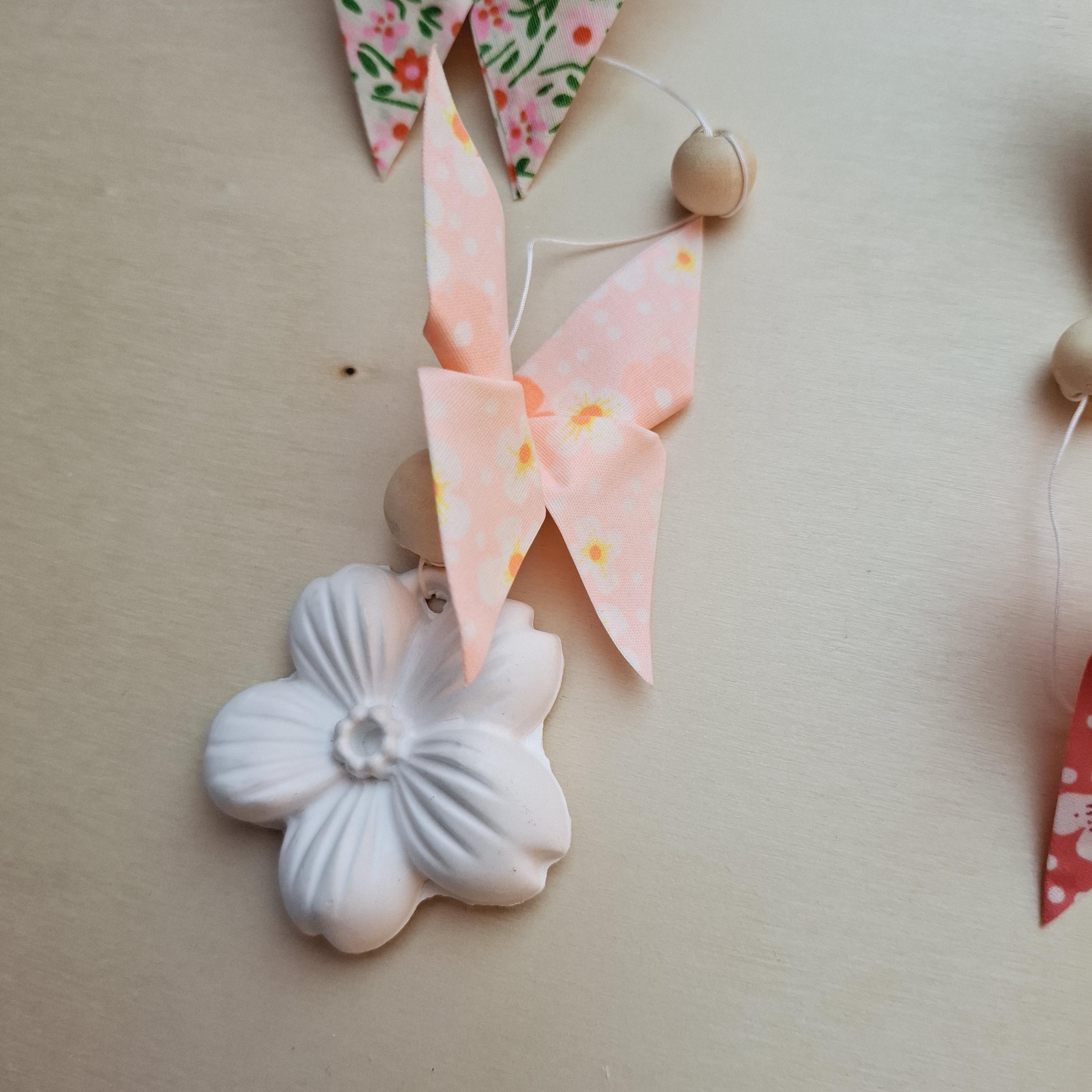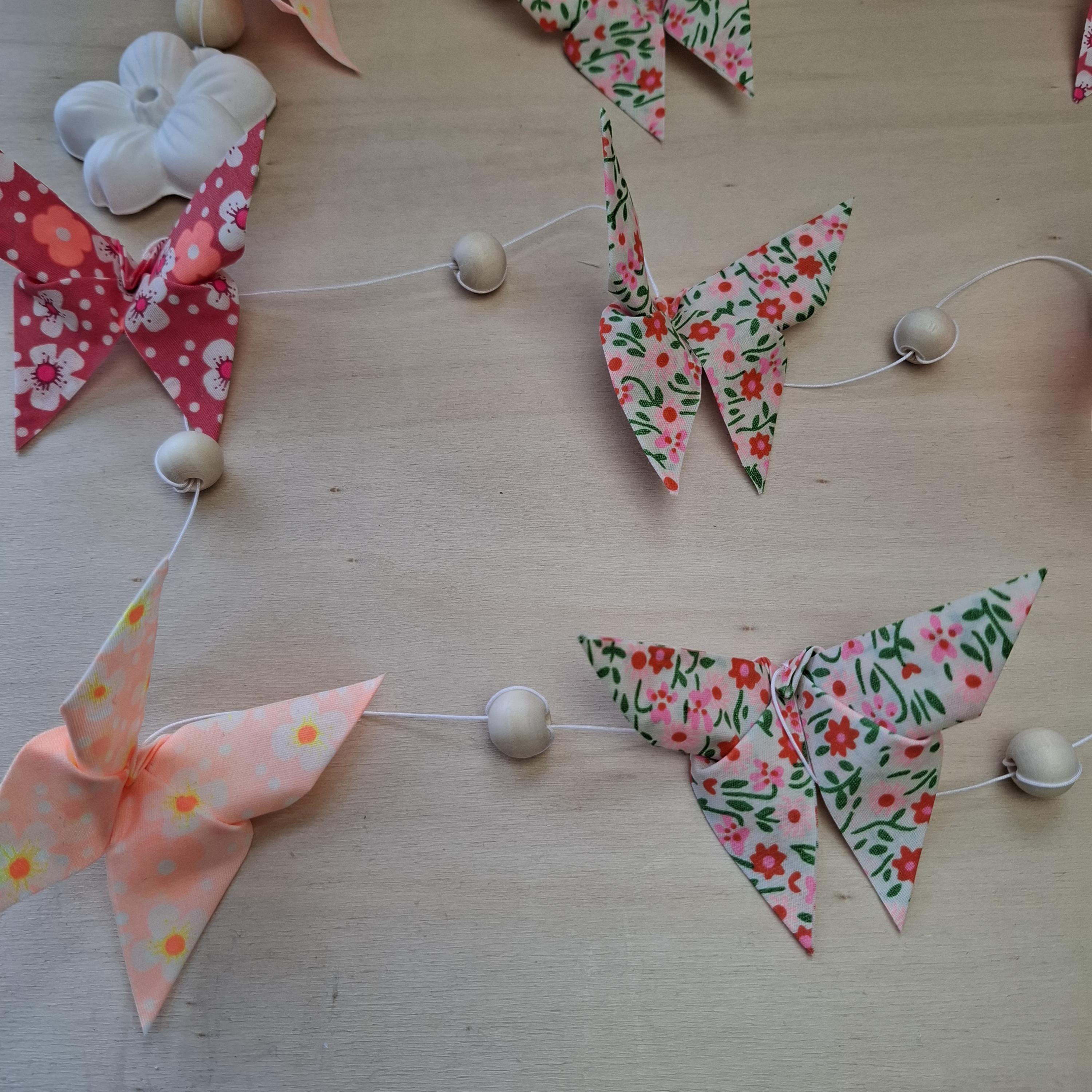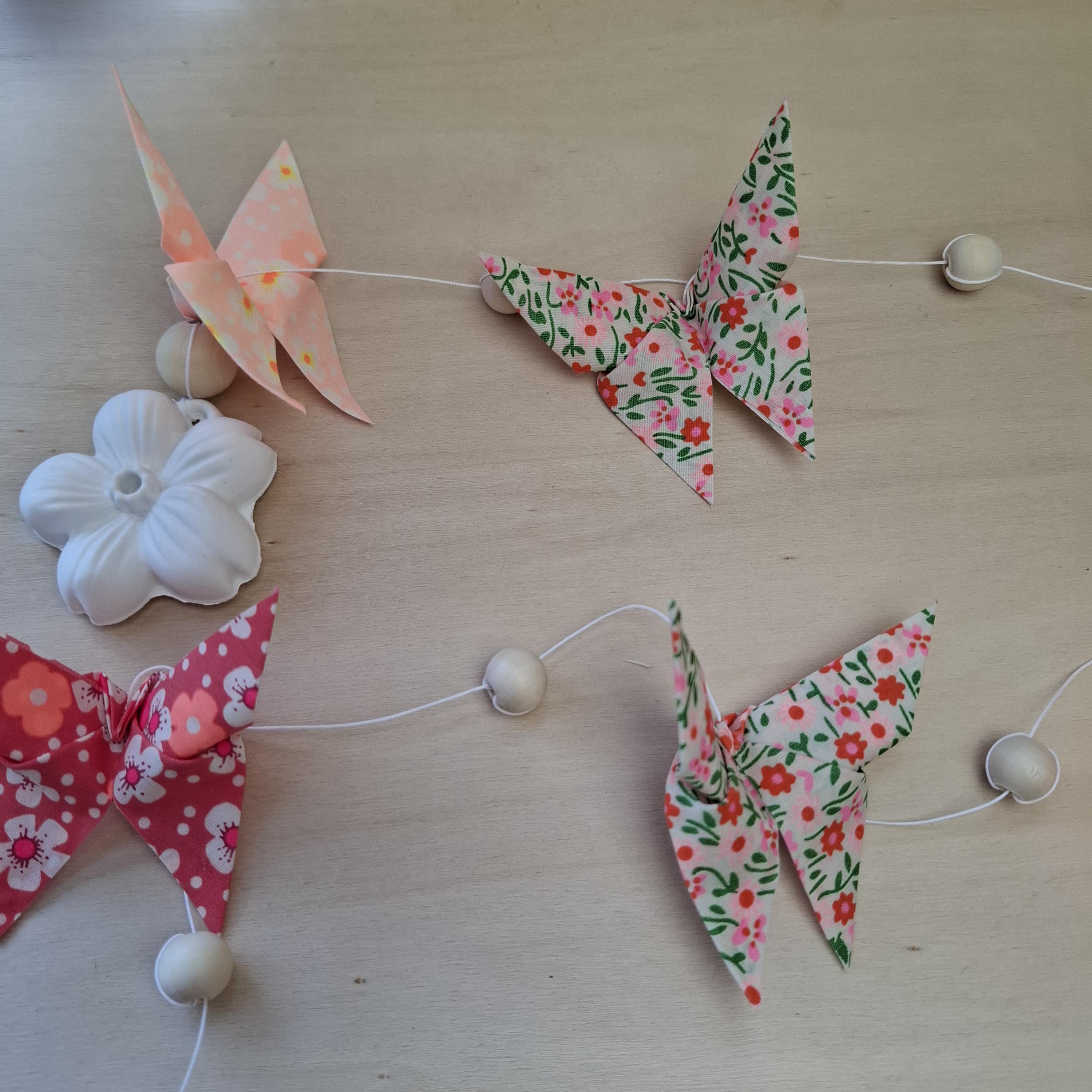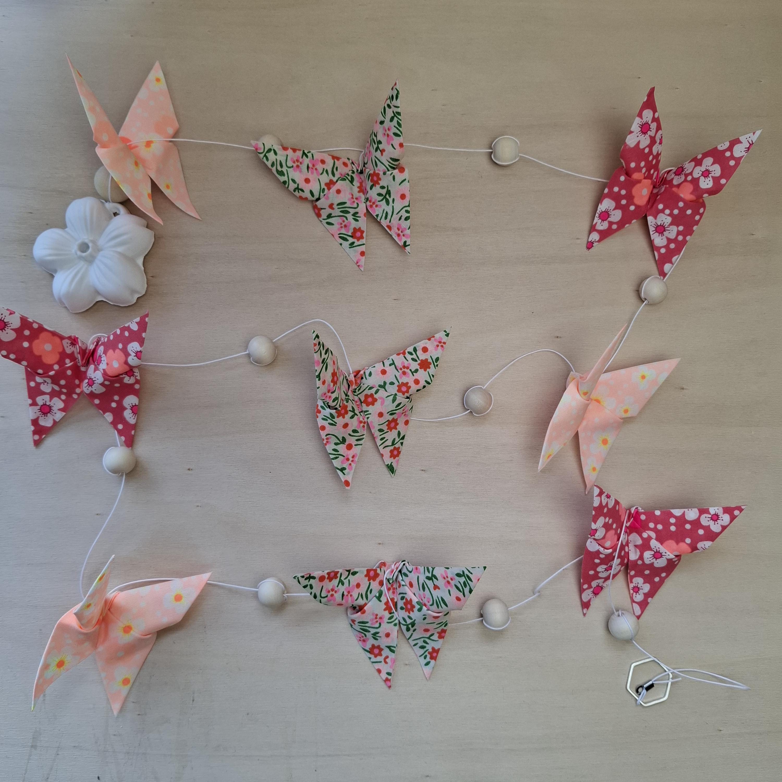 Let yourself be enchanted by this delicate origami fabric pendant, adorned with nine butterflies in shimmering colors.