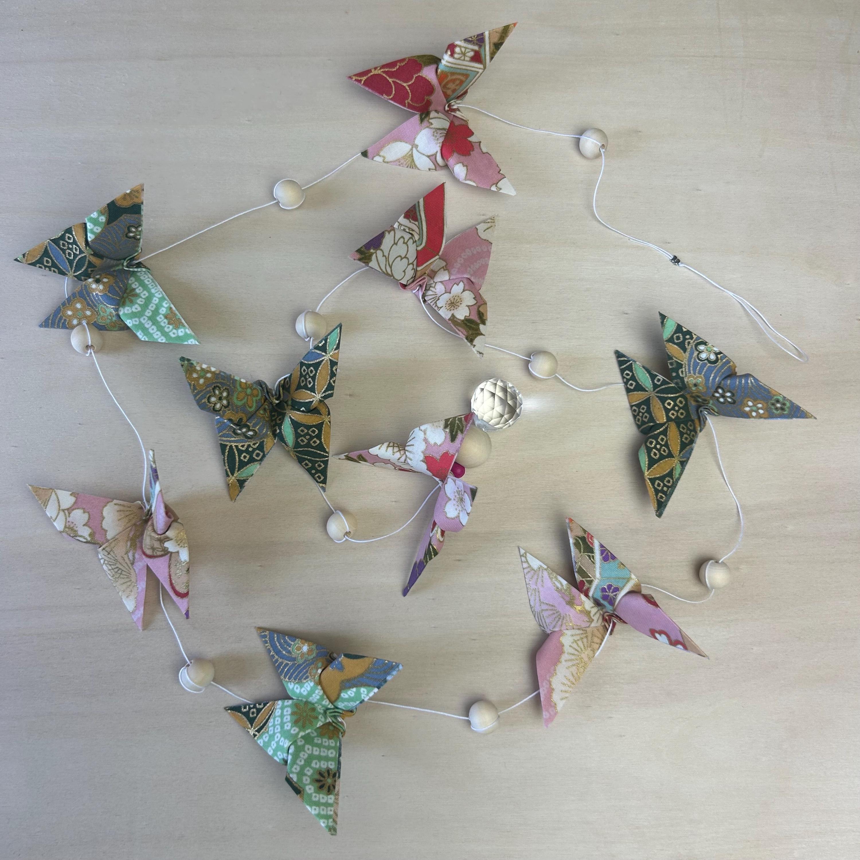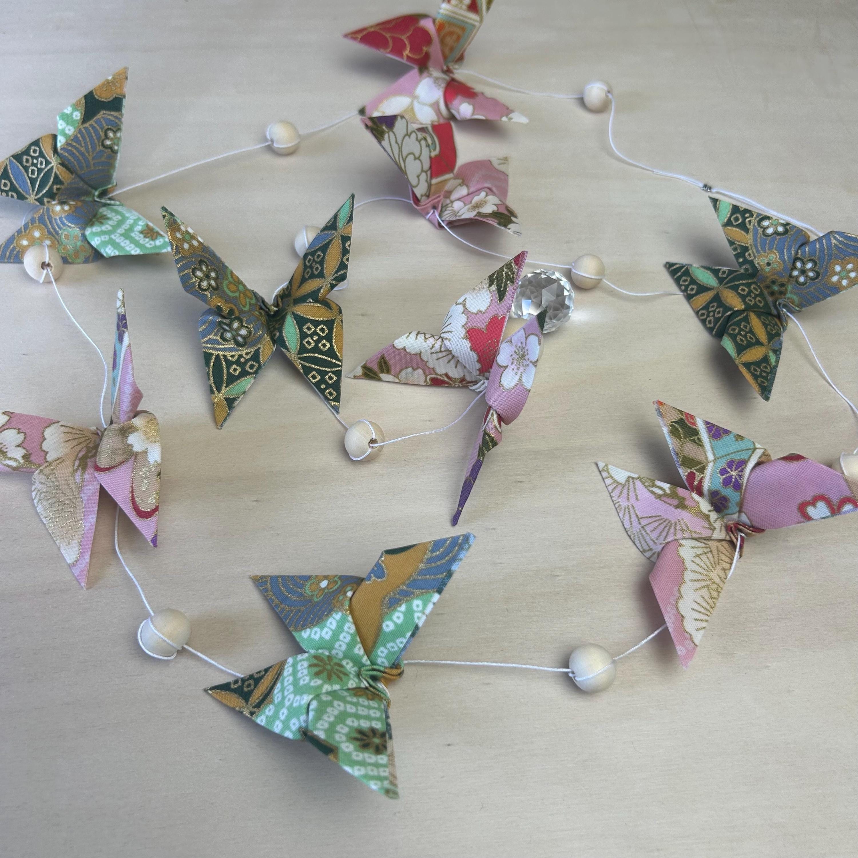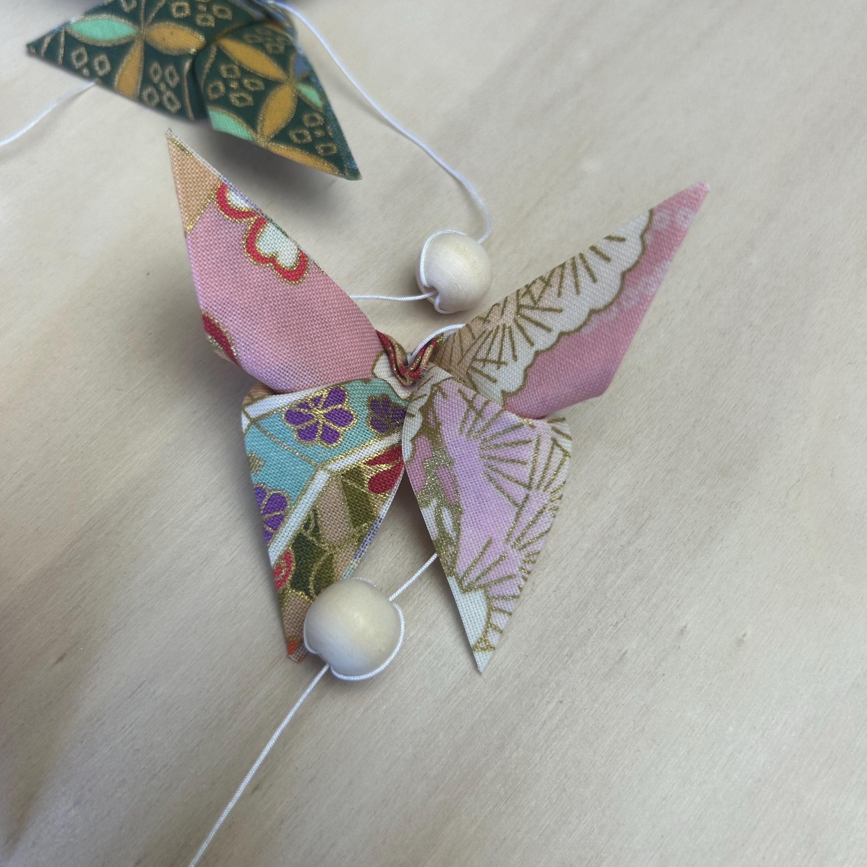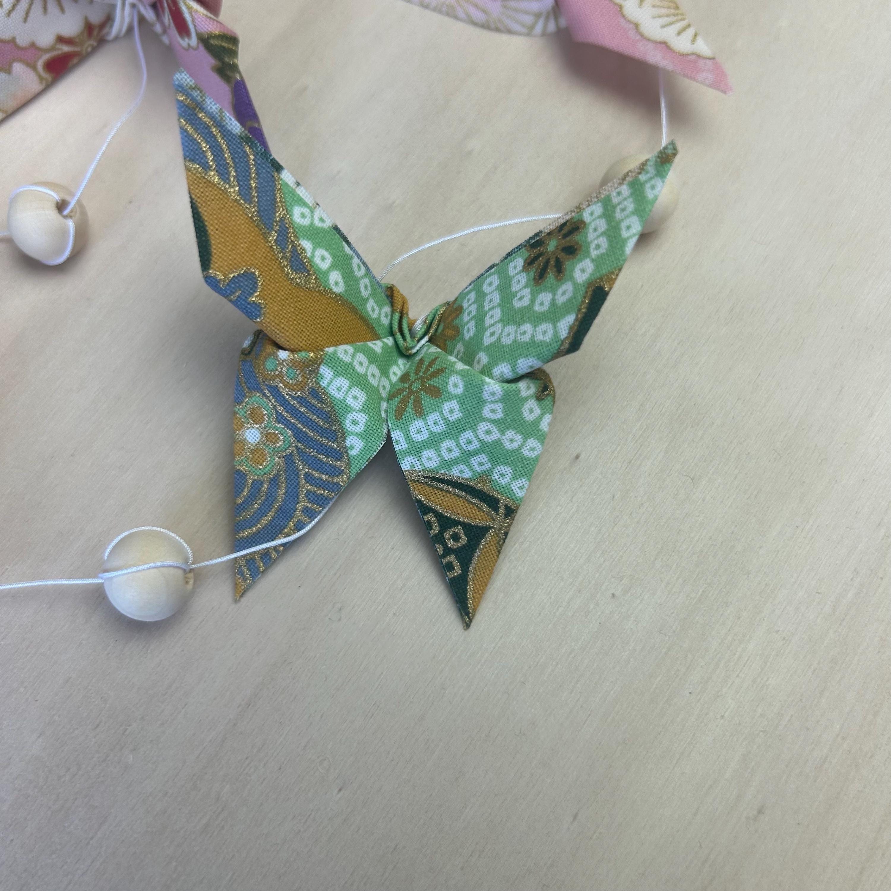 Let yourself be enchanted by this delicate origami fabric pendant, adorned with nine butterflies in shimmering colors.