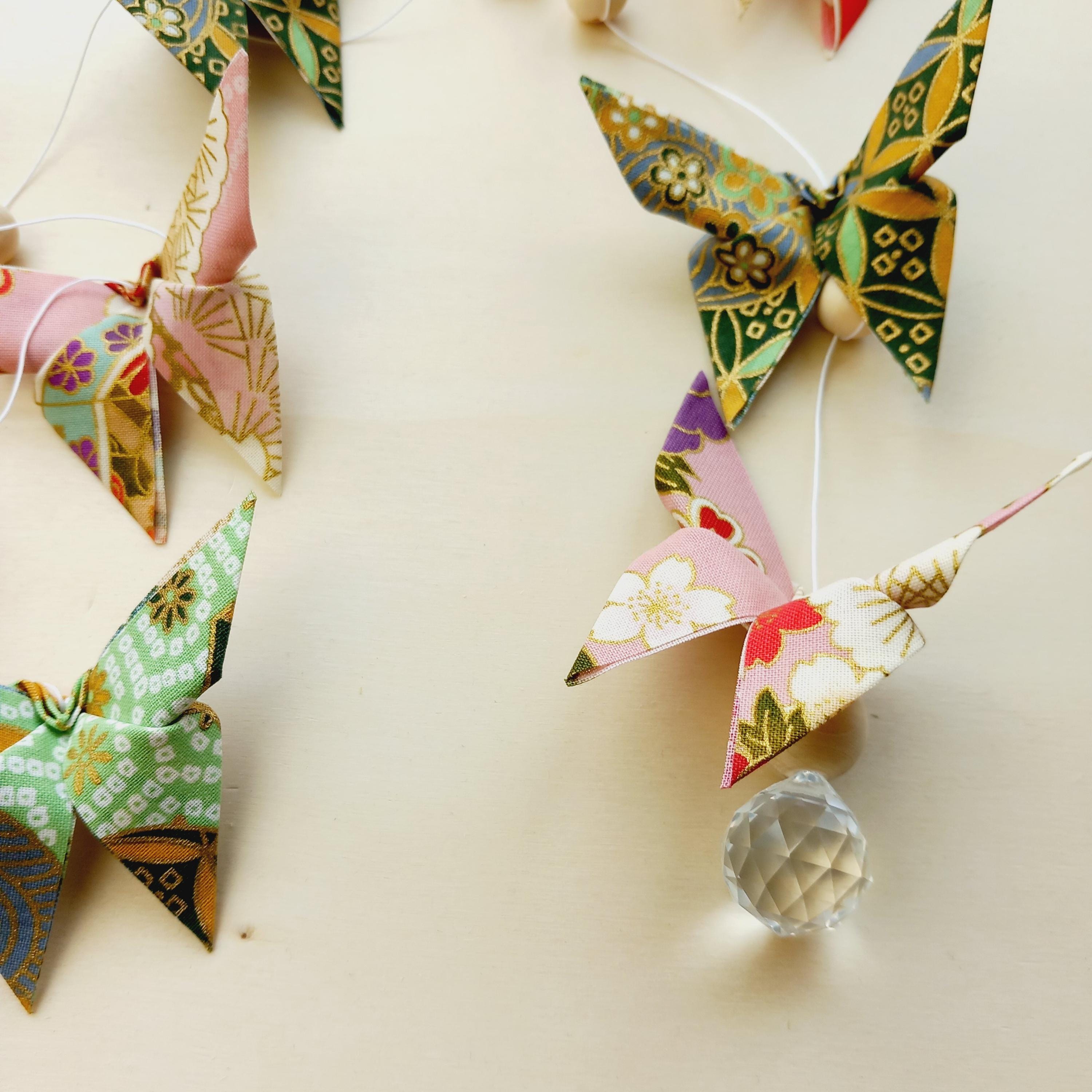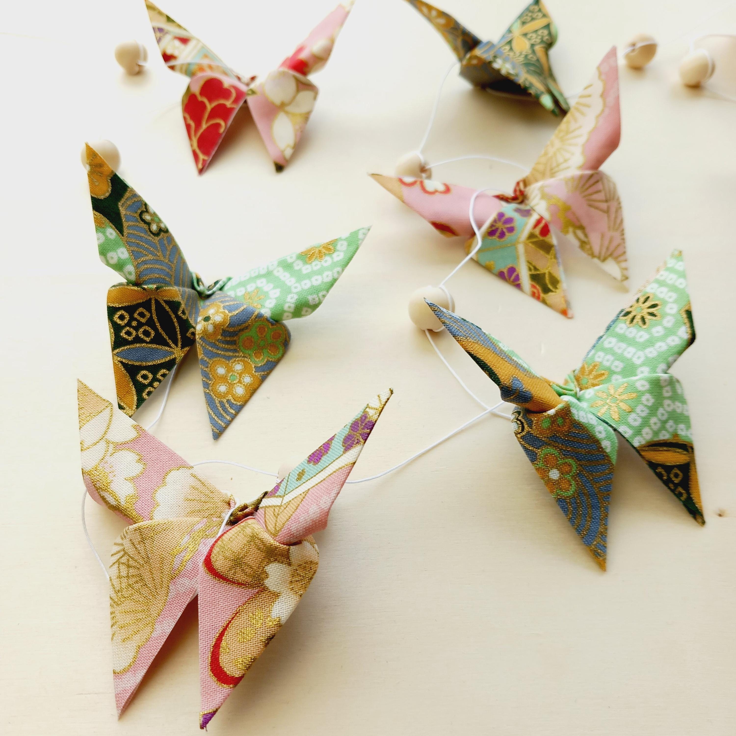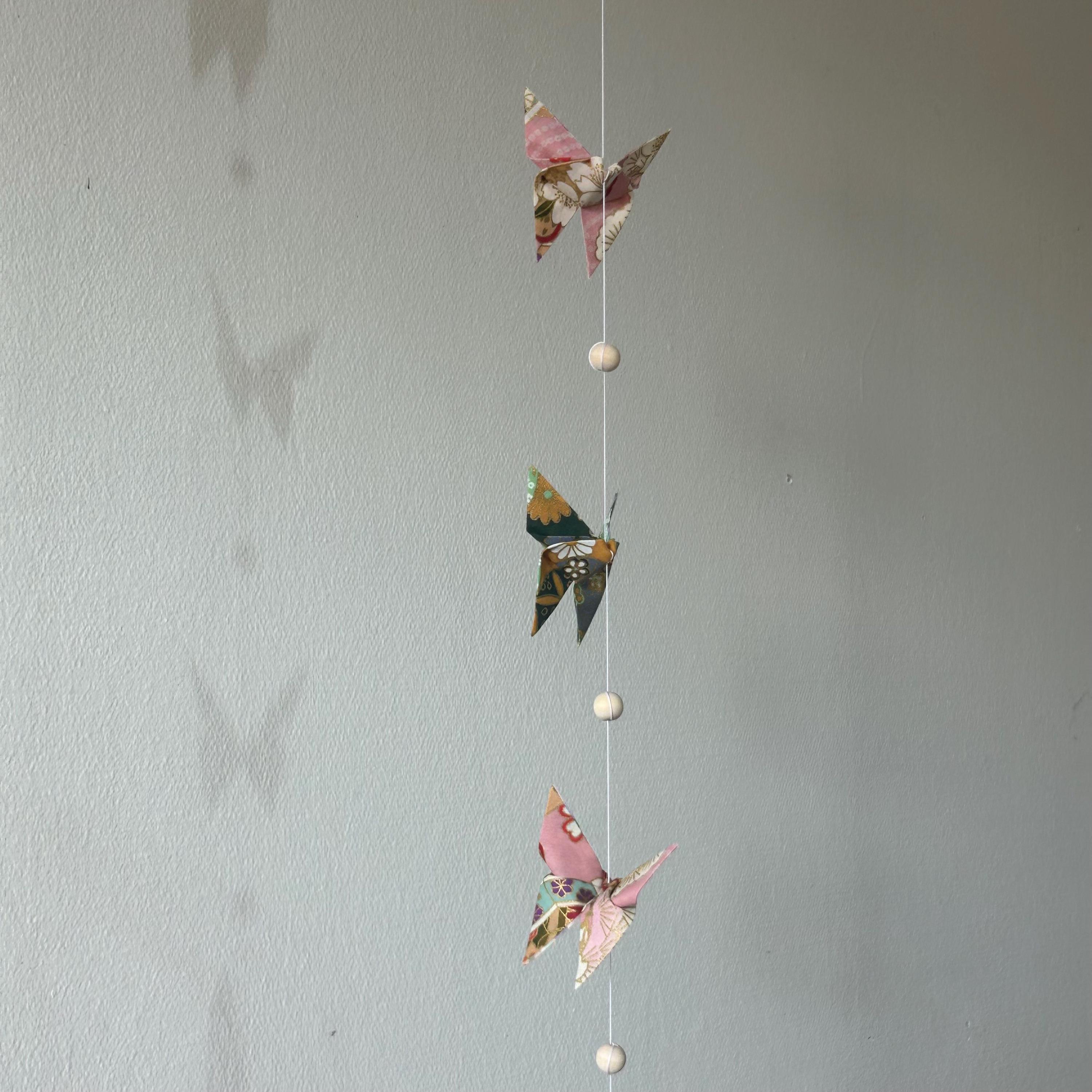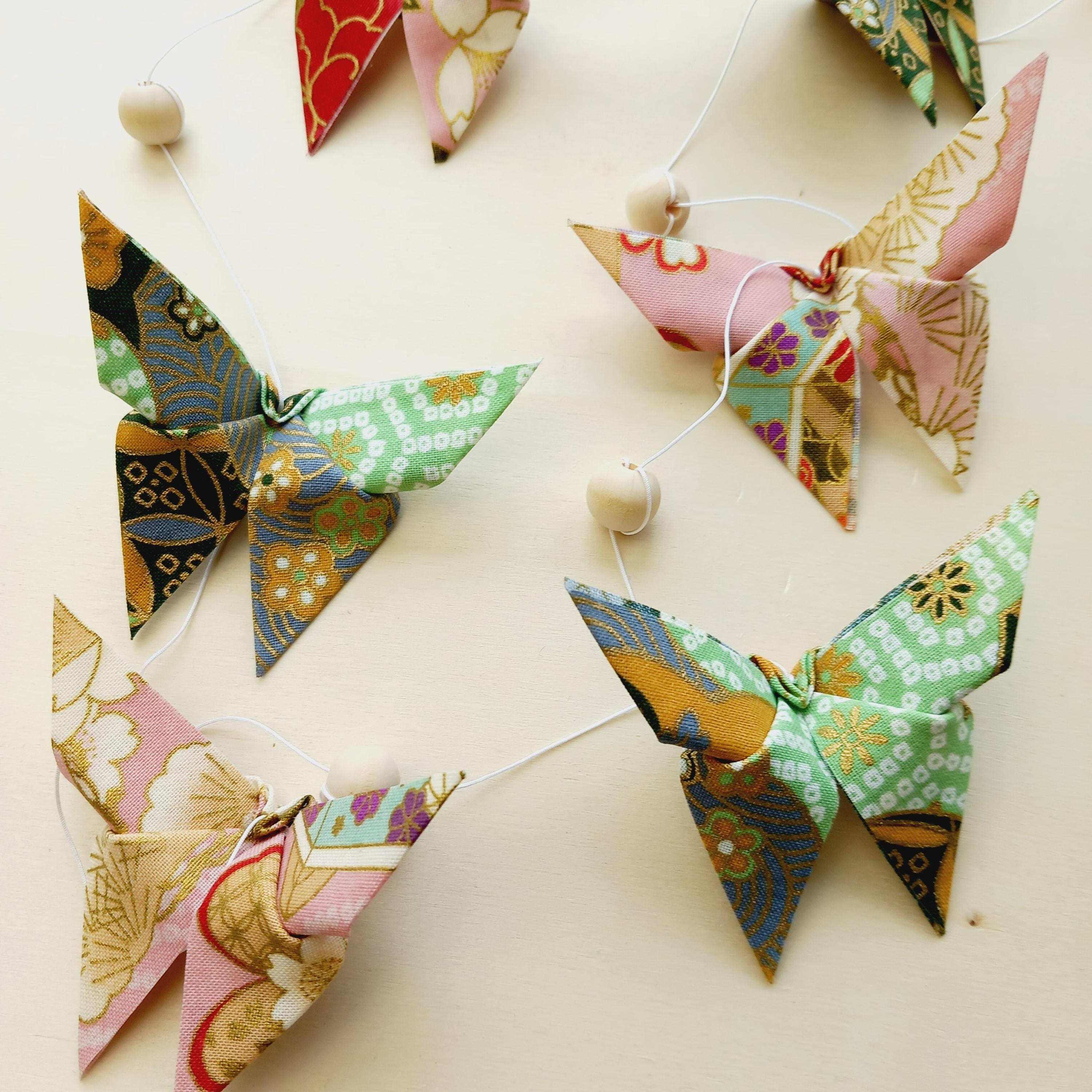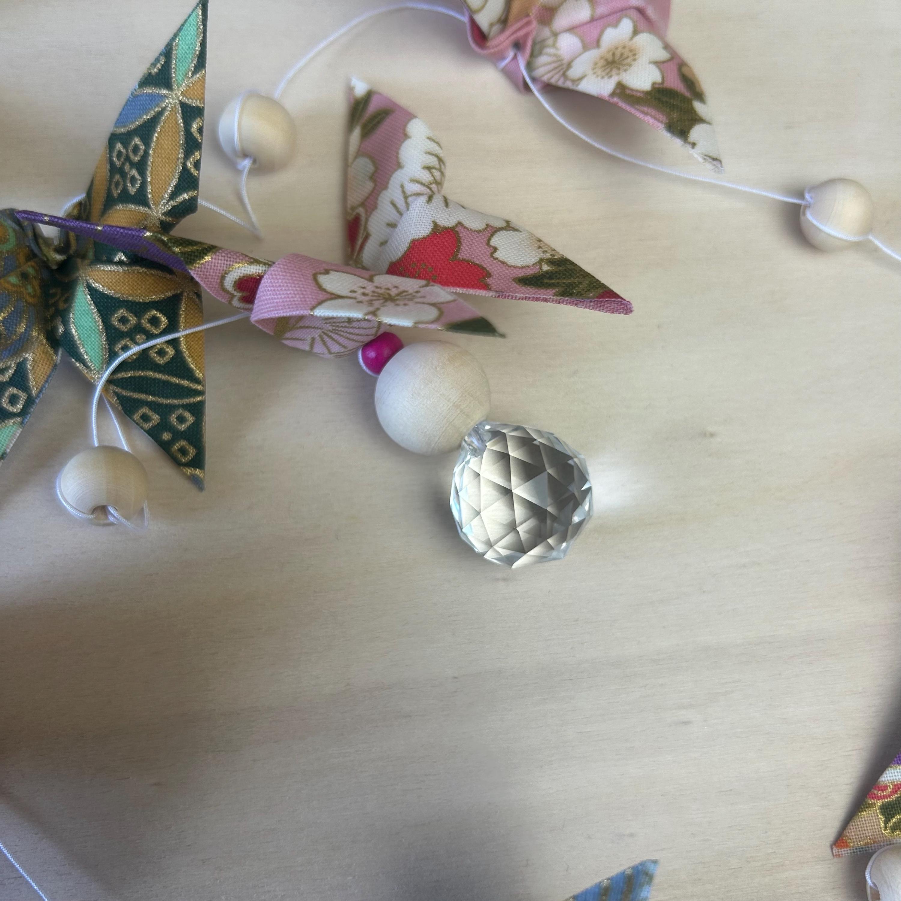 Let yourself be enchanted by this delicate origami fabric pendant, adorned with nine butterflies in shimmering colors.