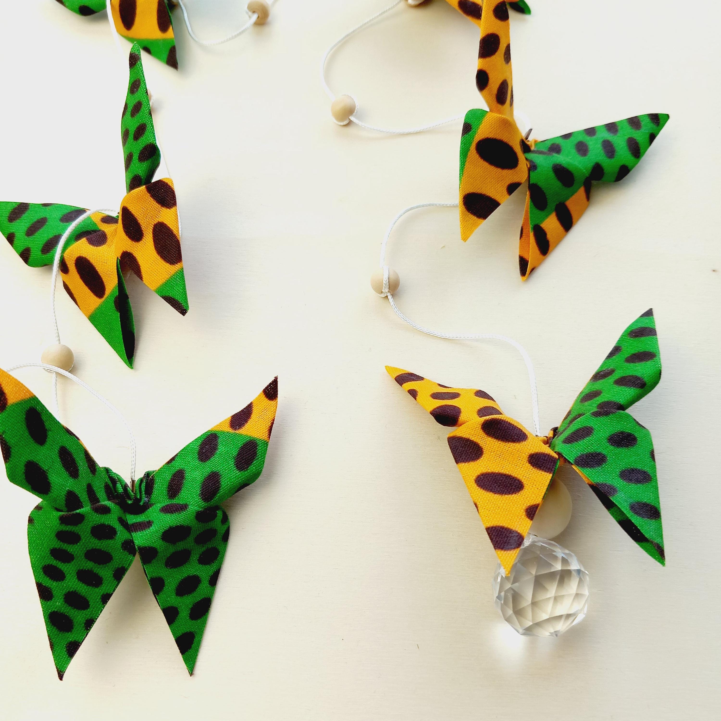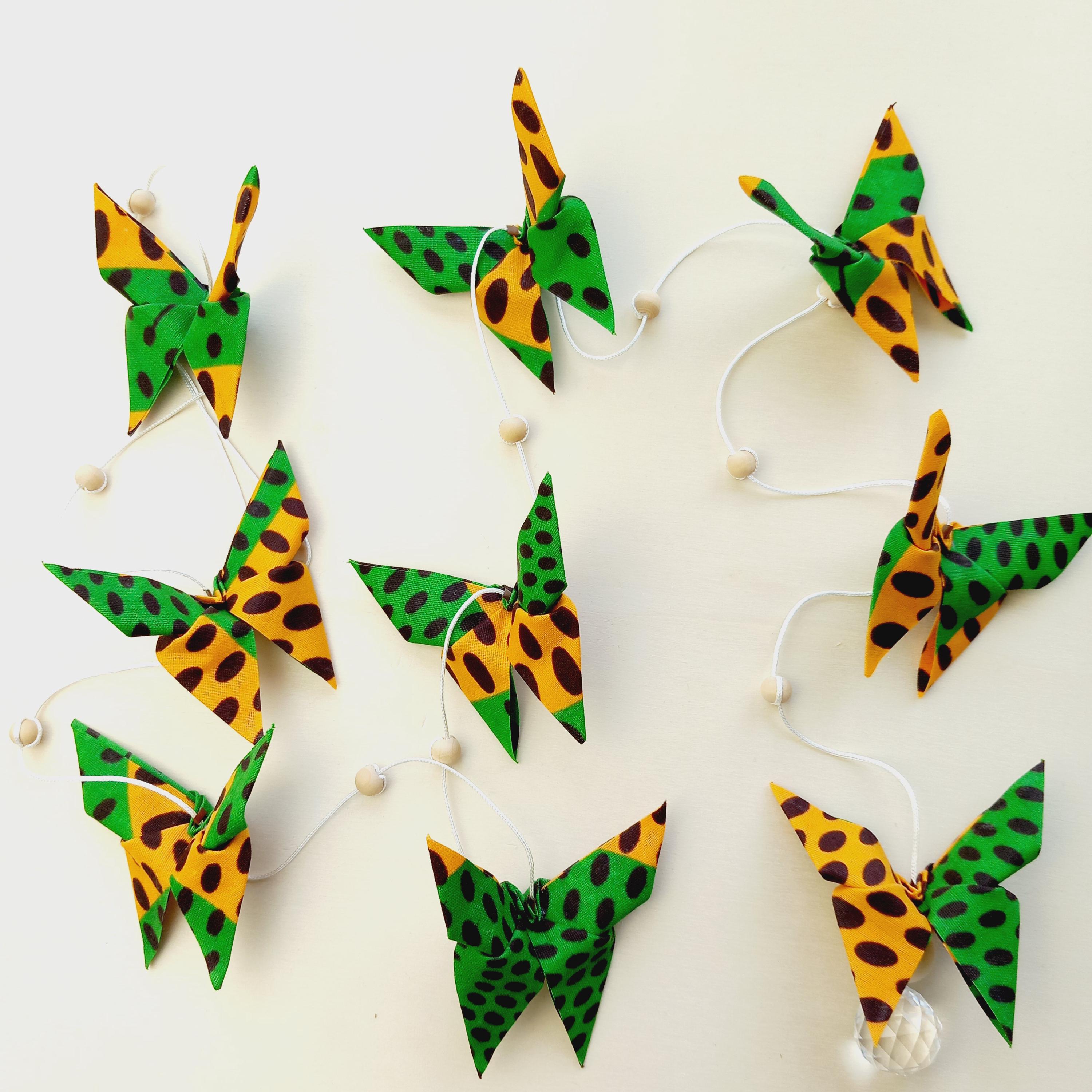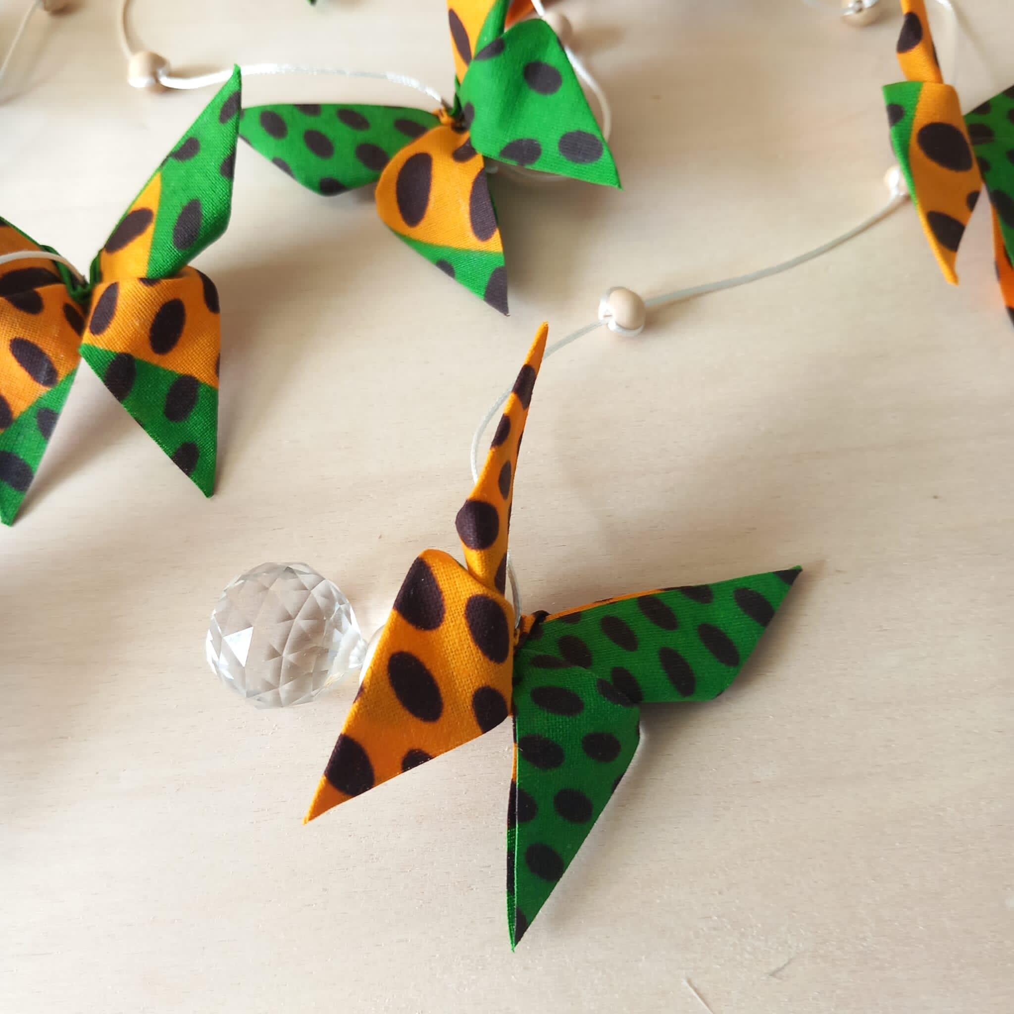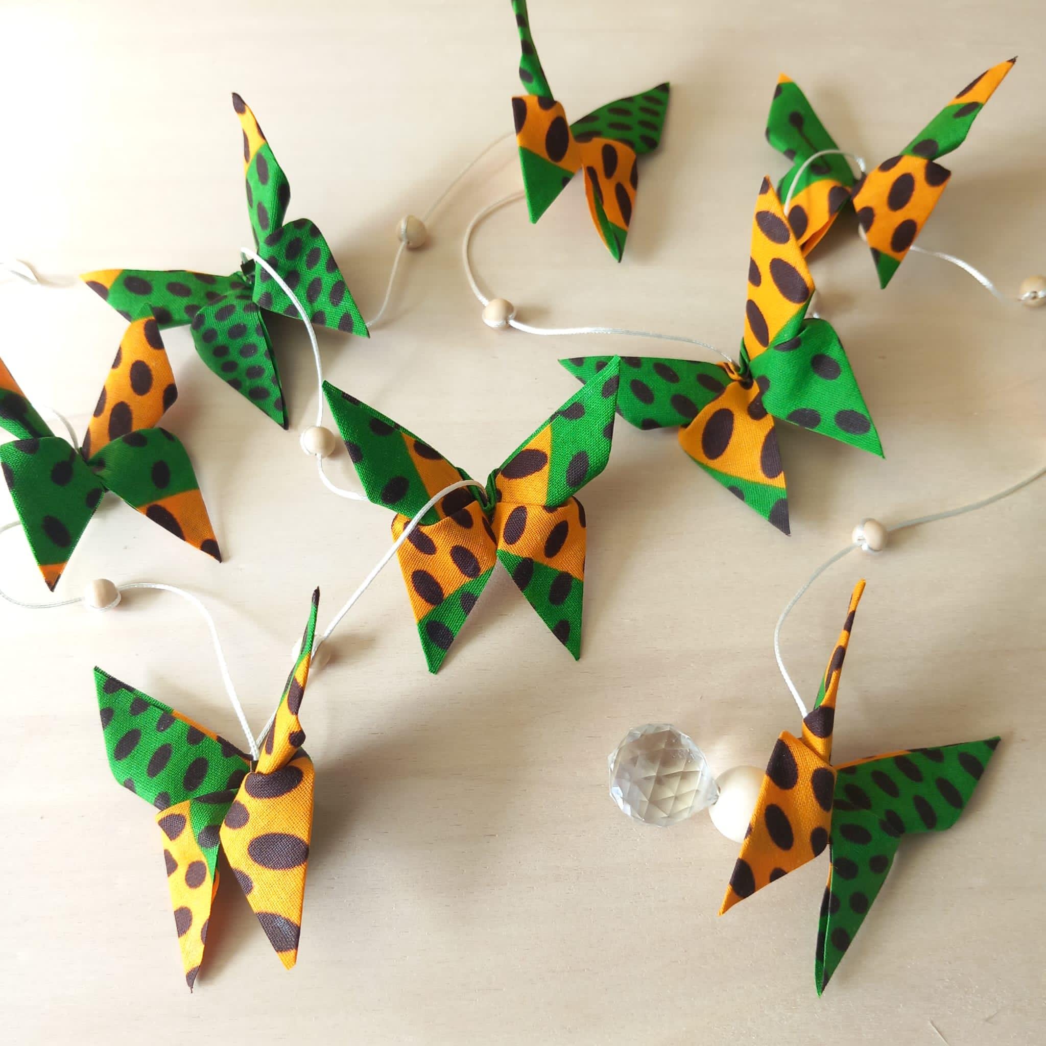 Let yourself be enchanted by this delicate origami fabric pendant, adorned with nine butterflies in shimmering colors.