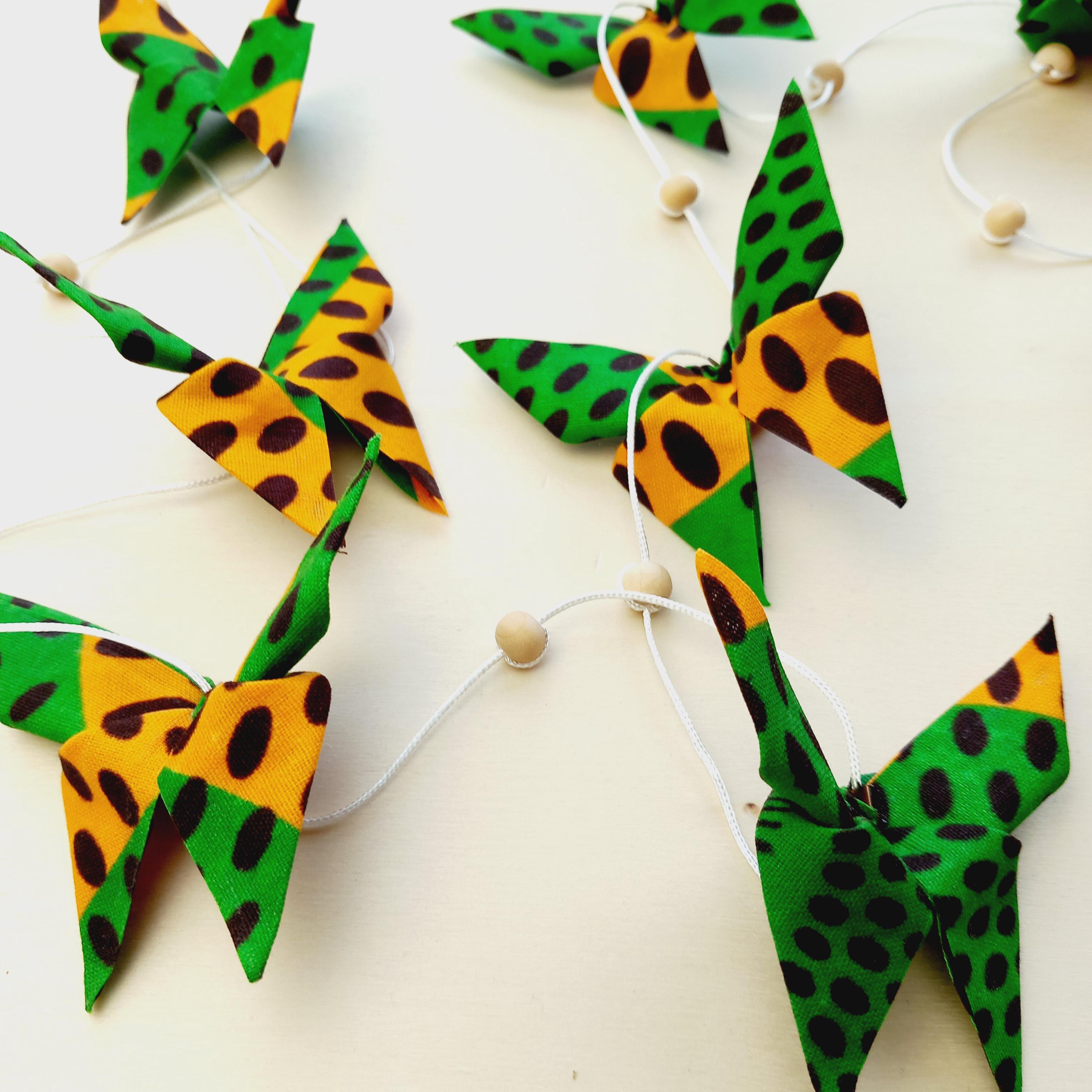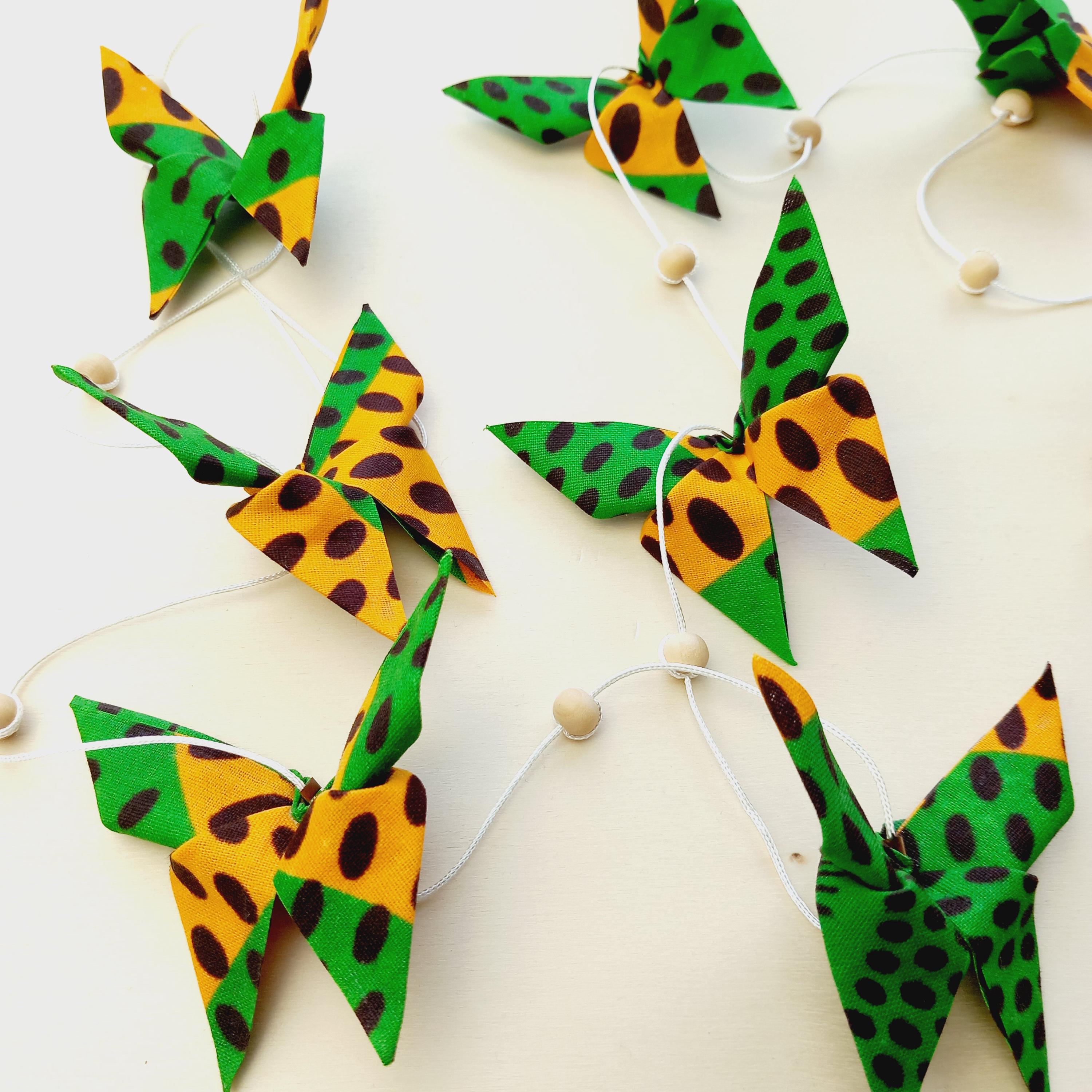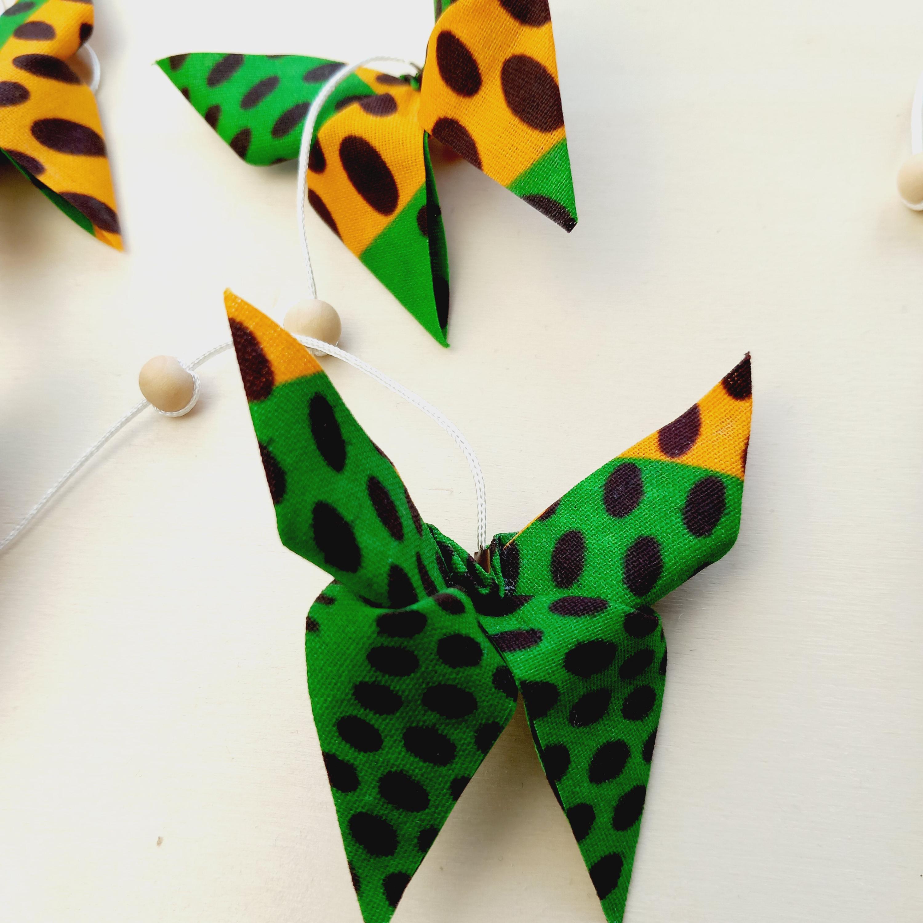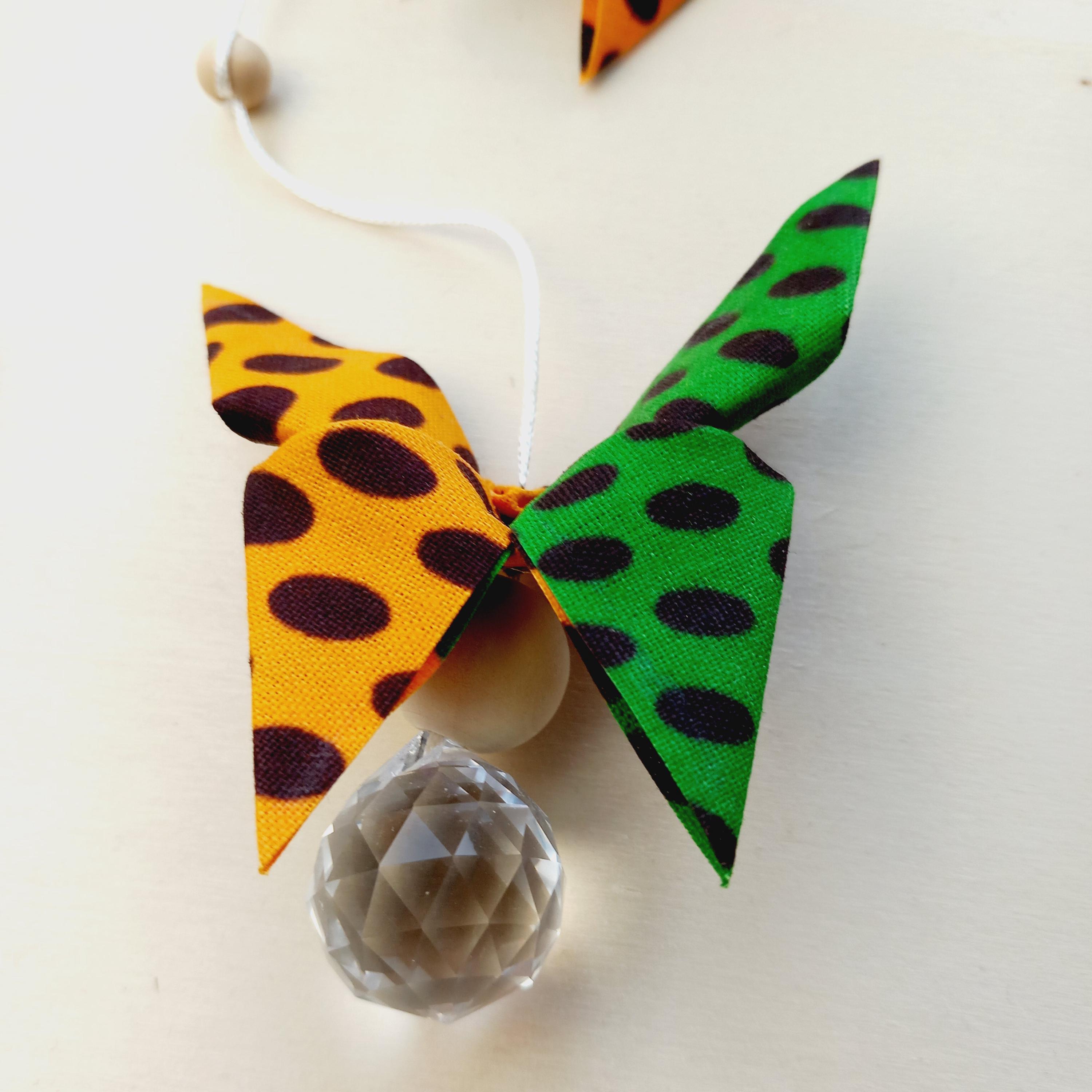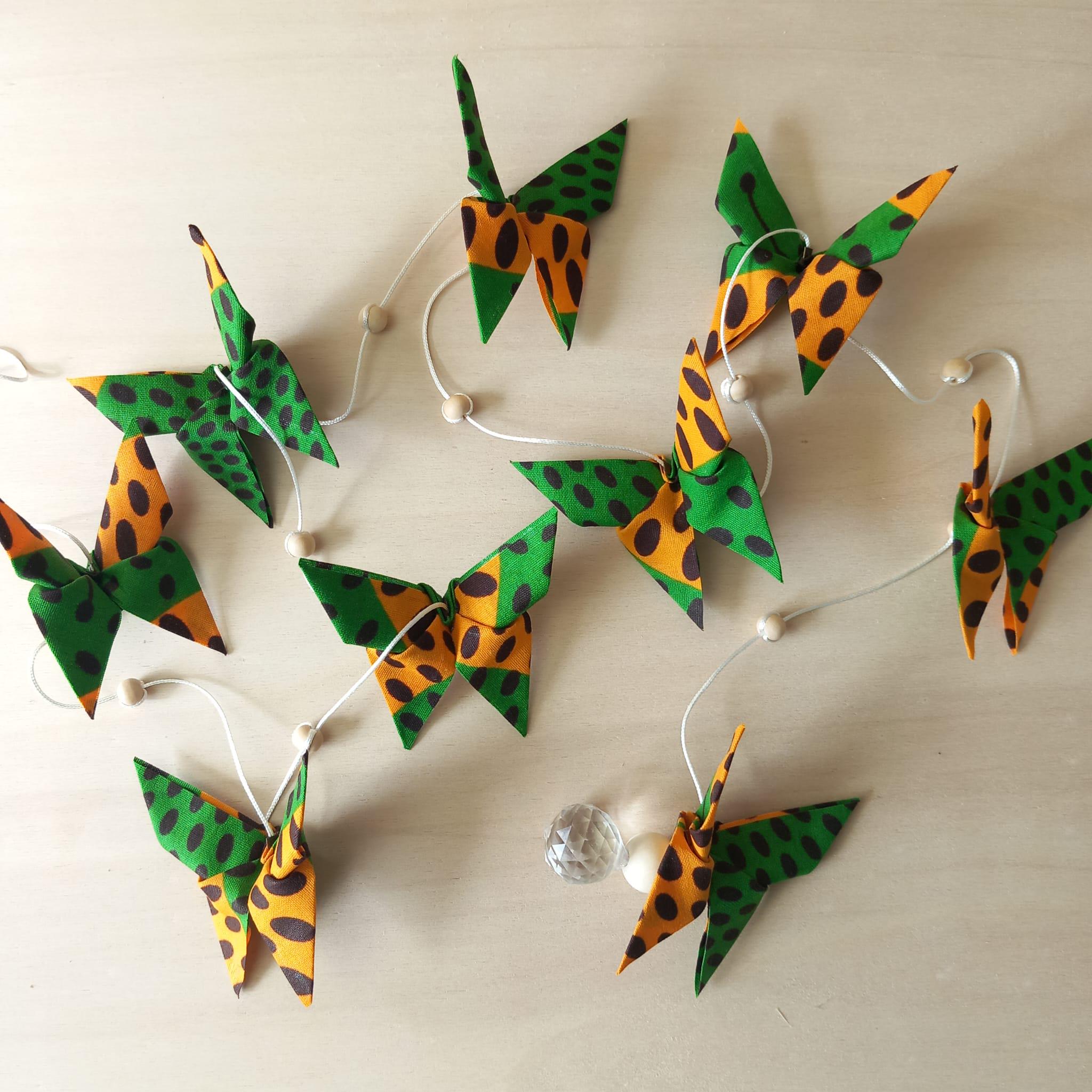 Let yourself be enchanted by this delicate origami fabric pendant, adorned with nine butterflies in shimmering colors.