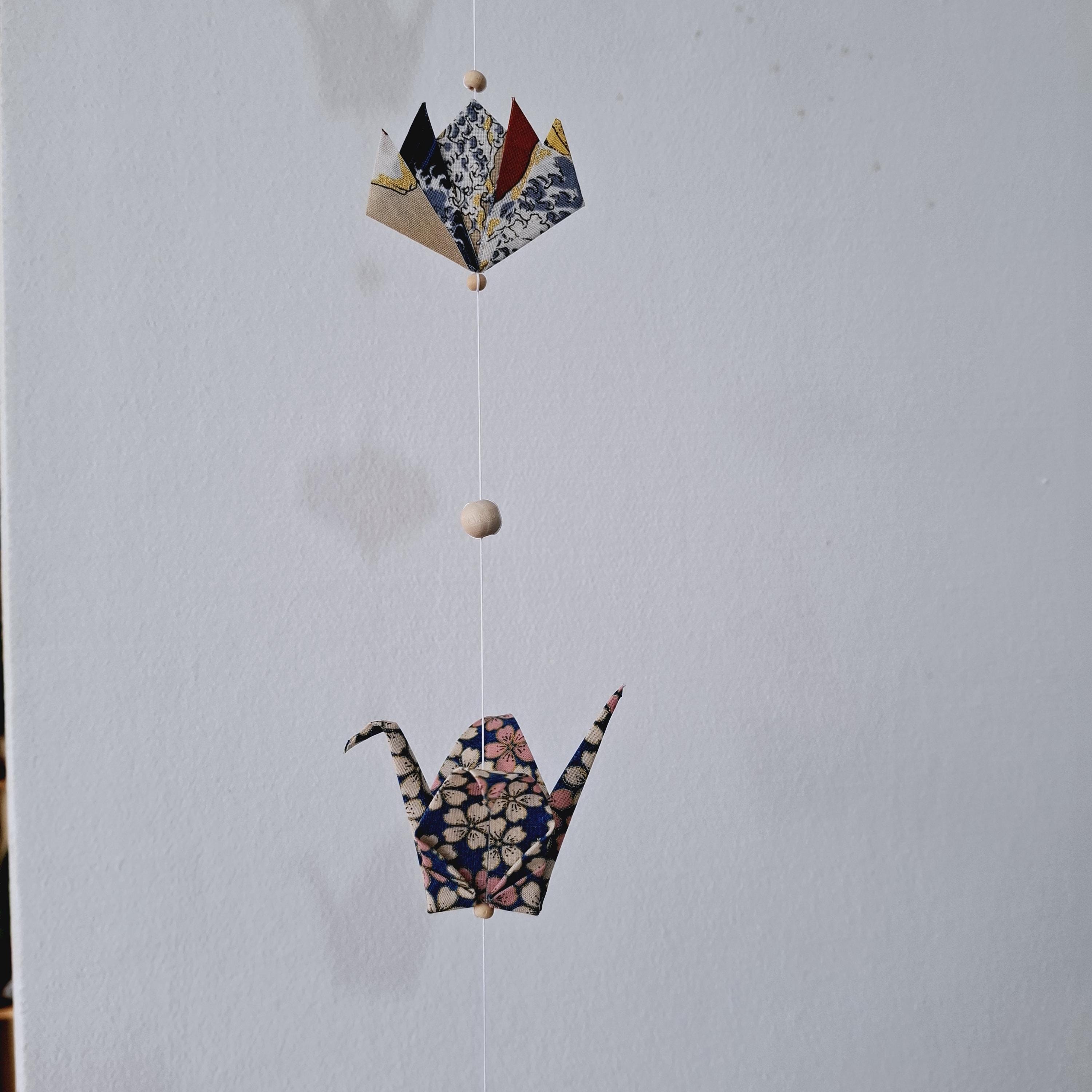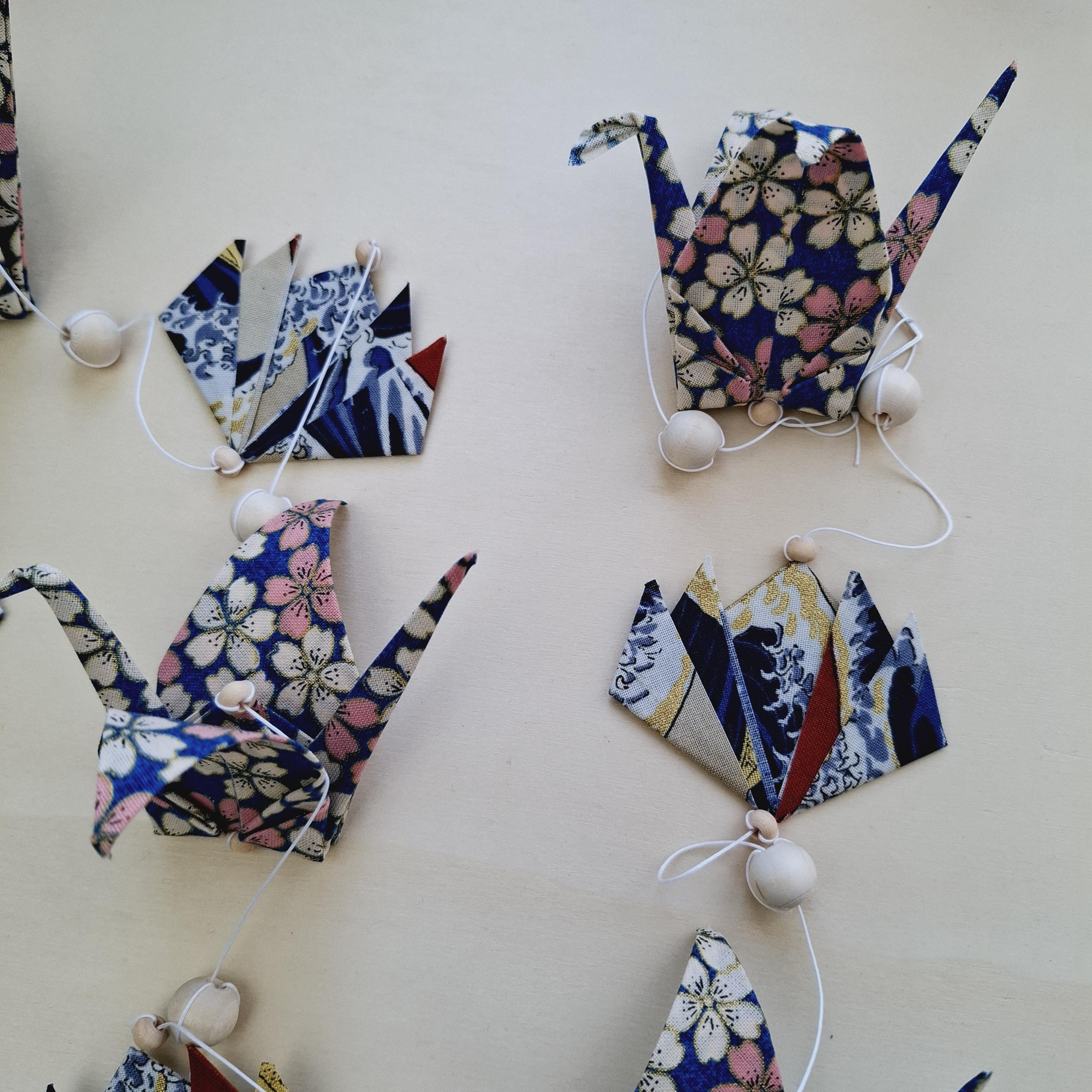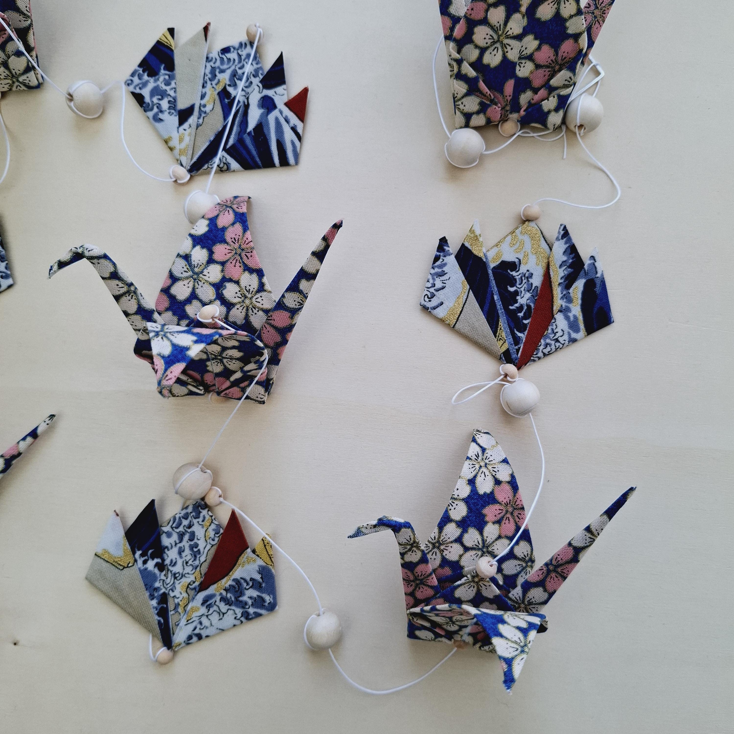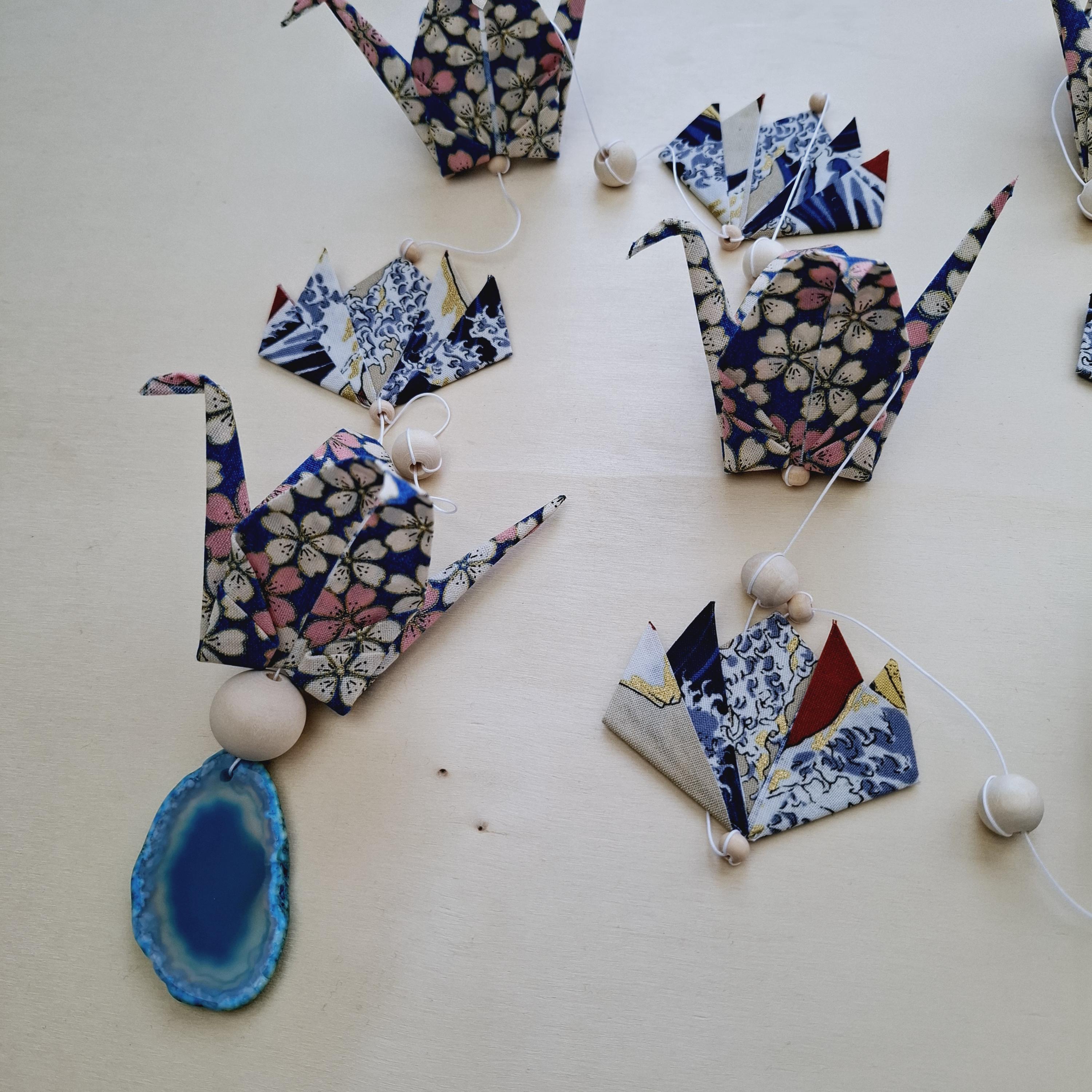 Let yourself be captivated by this delicate origami fabric hanging decoration, adorned with five cranes and four lotus flowers in shimmering colors.