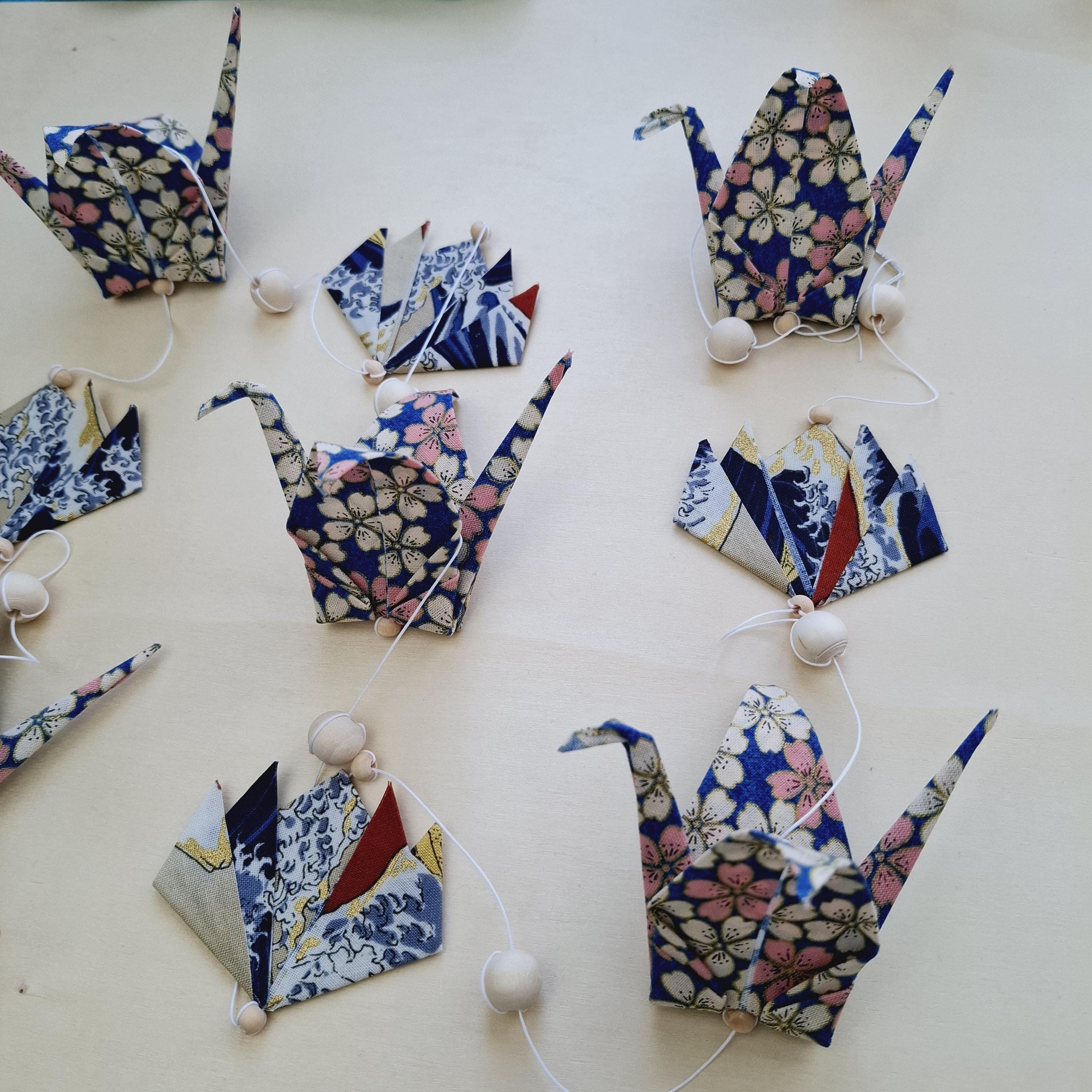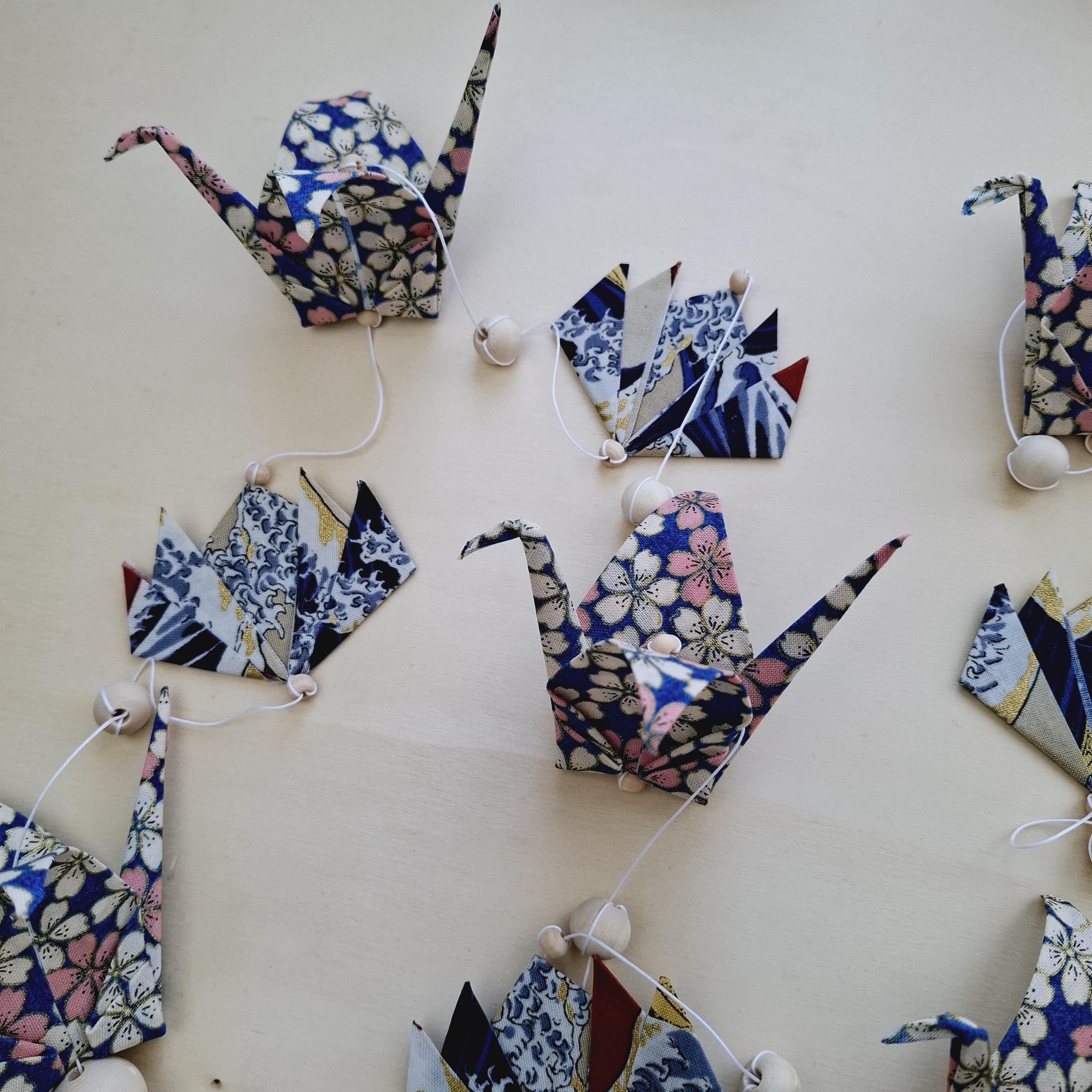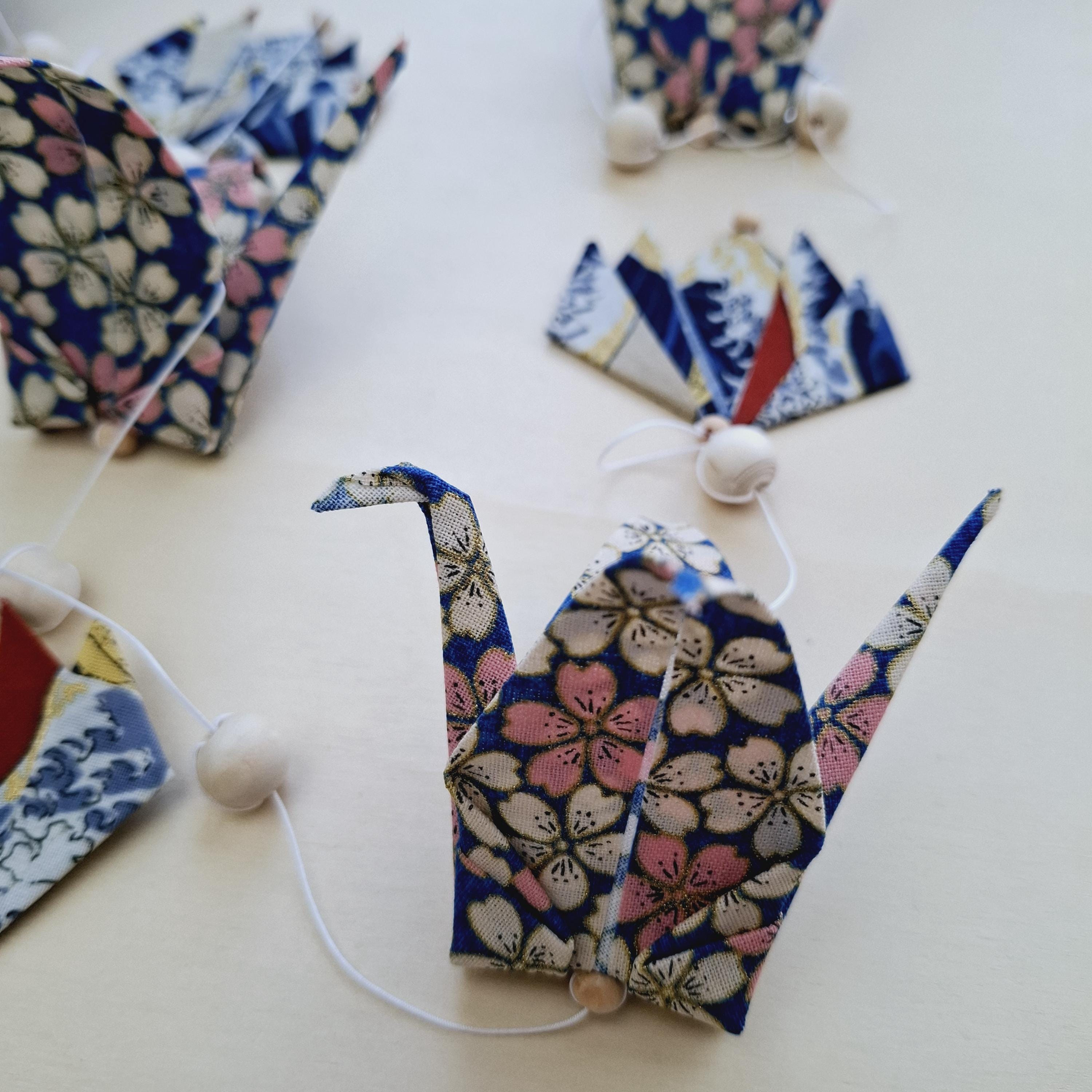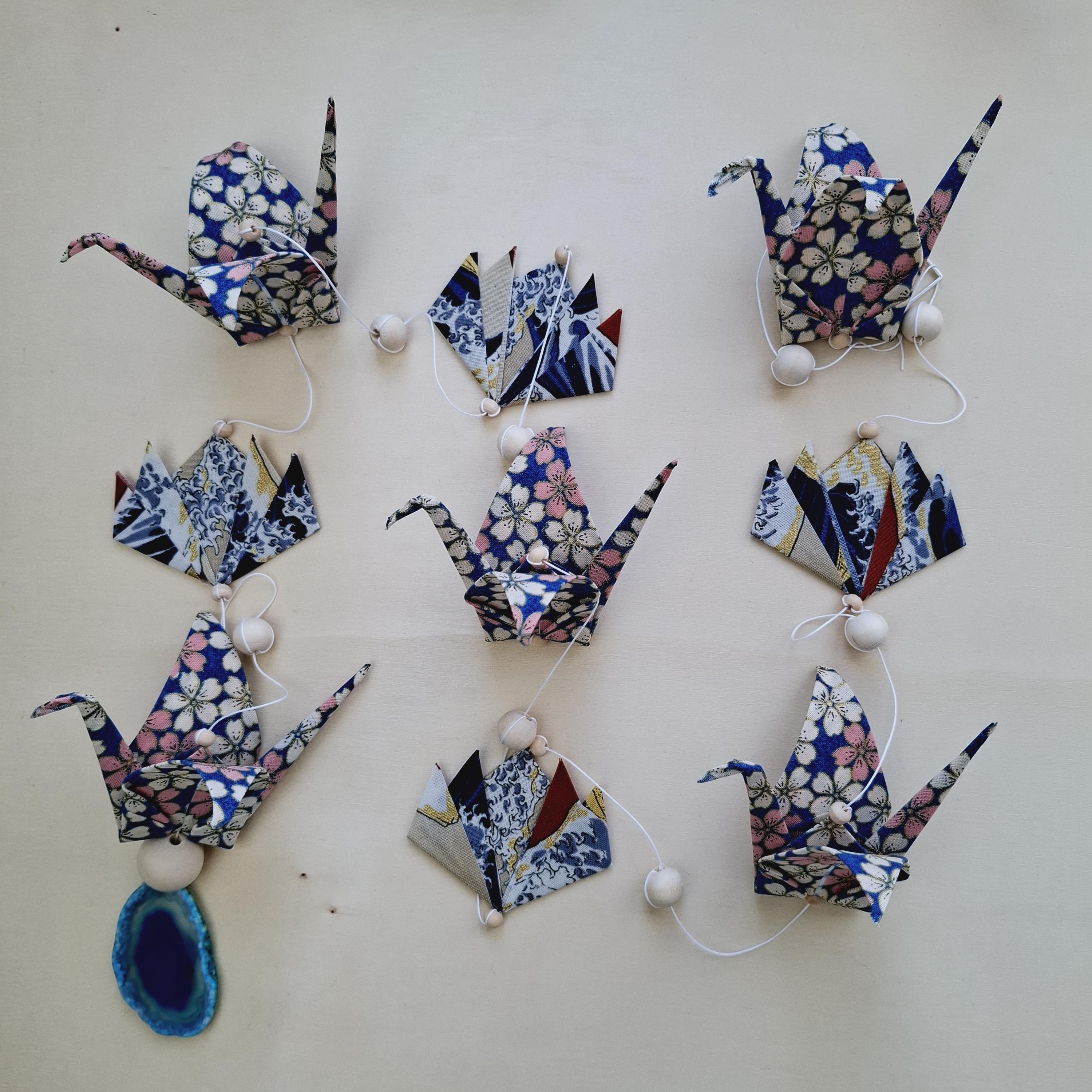 Let yourself be captivated by this delicate origami fabric hanging decoration, adorned with five cranes and four lotus flowers in shimmering colors.
