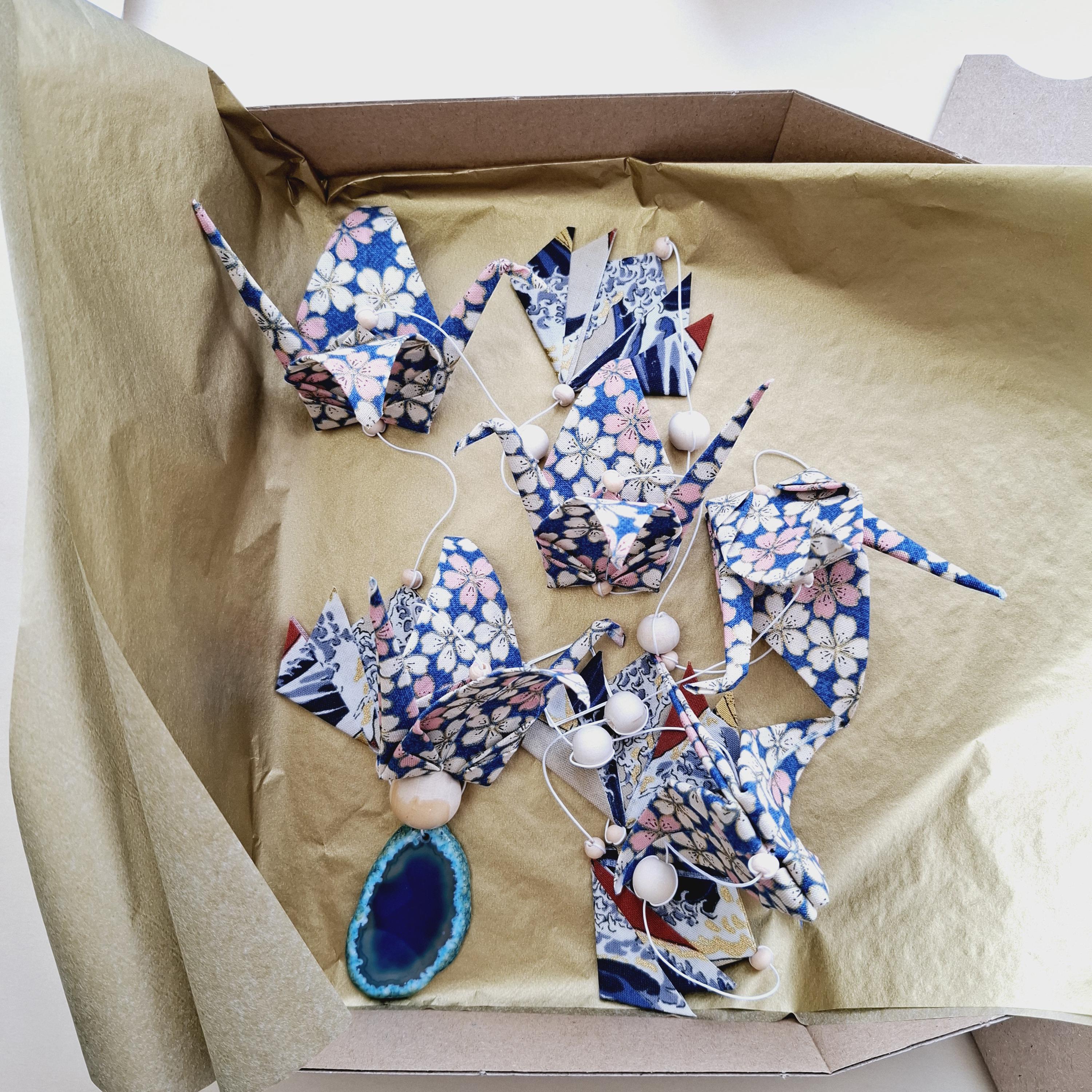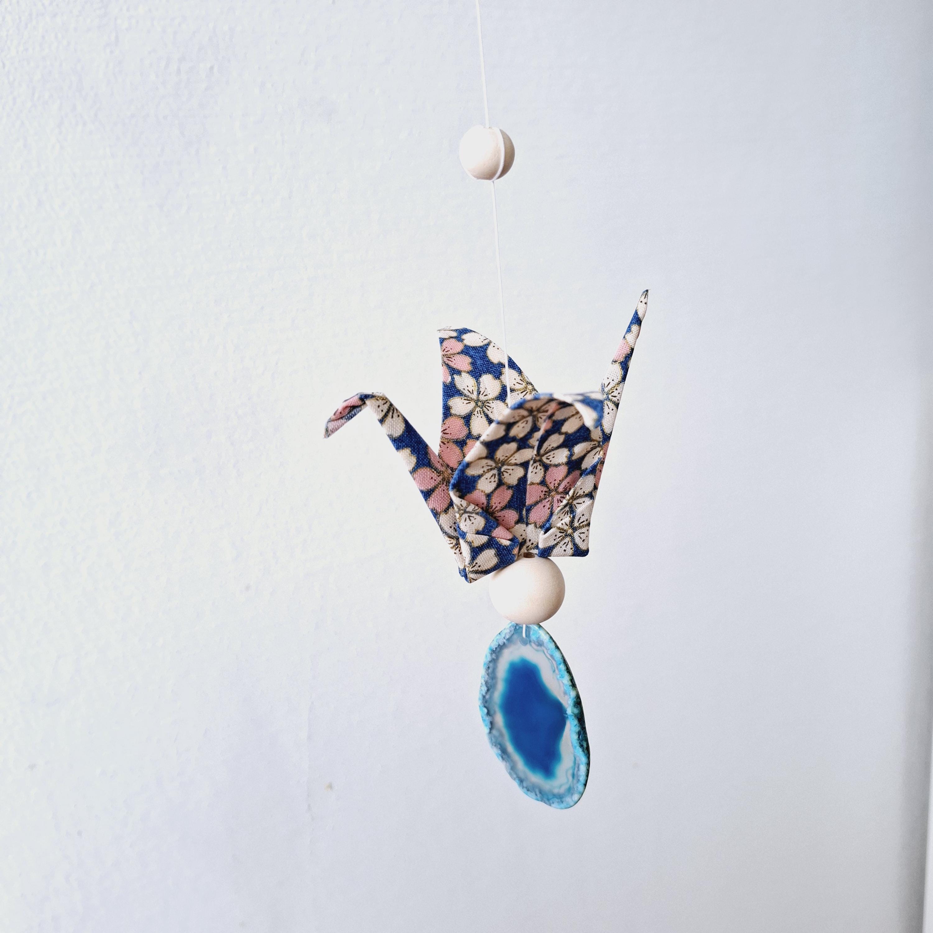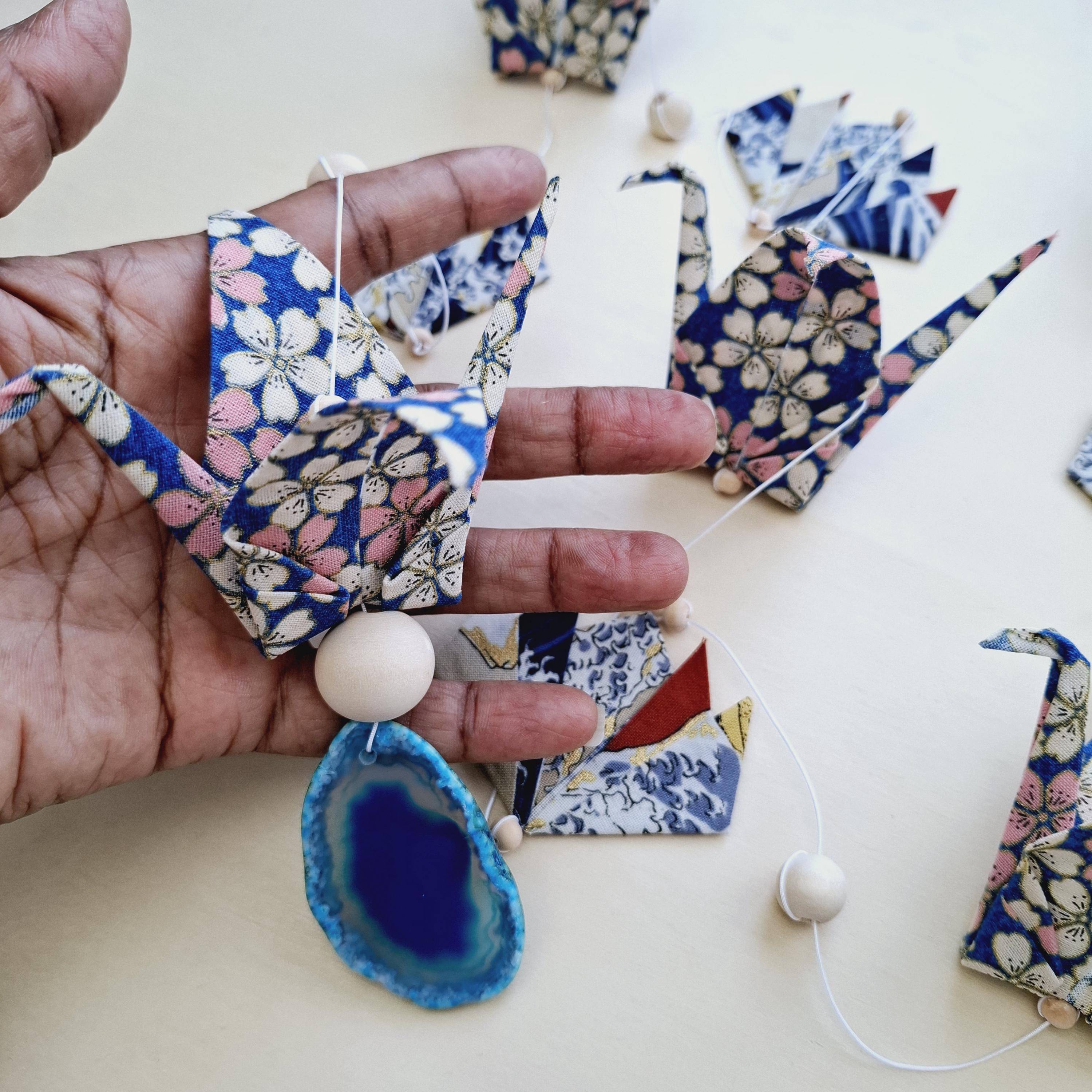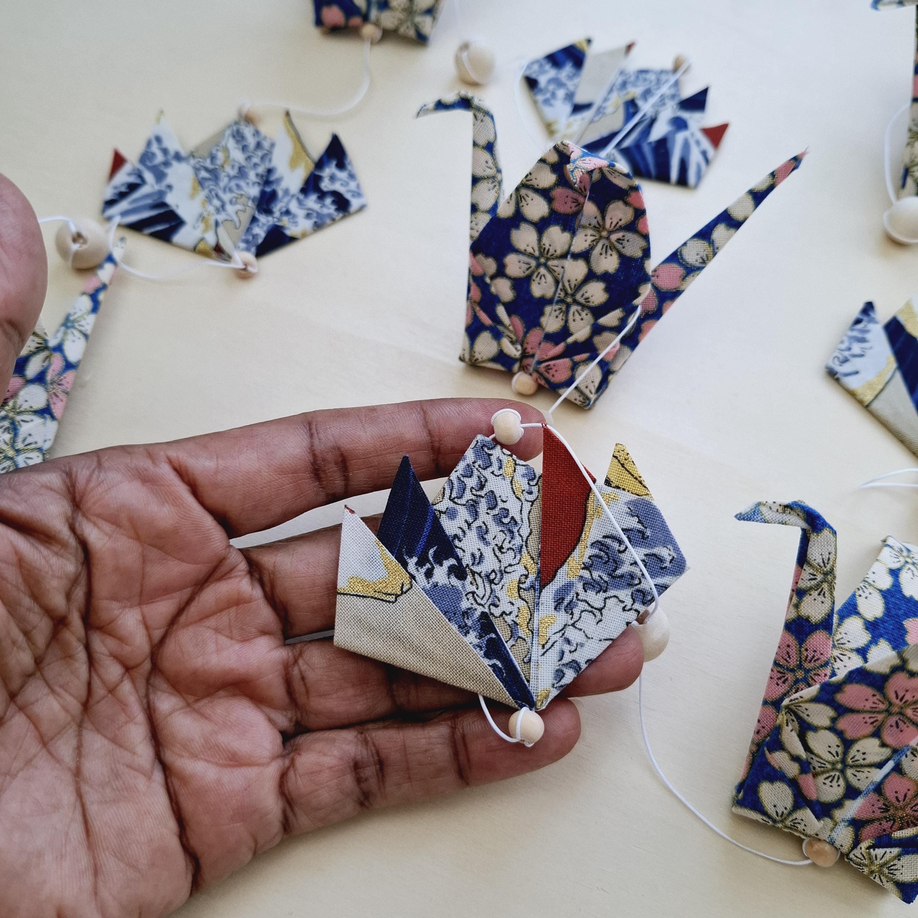 Let yourself be captivated by this delicate origami fabric hanging decoration, adorned with five cranes and four lotus flowers in shimmering colors.