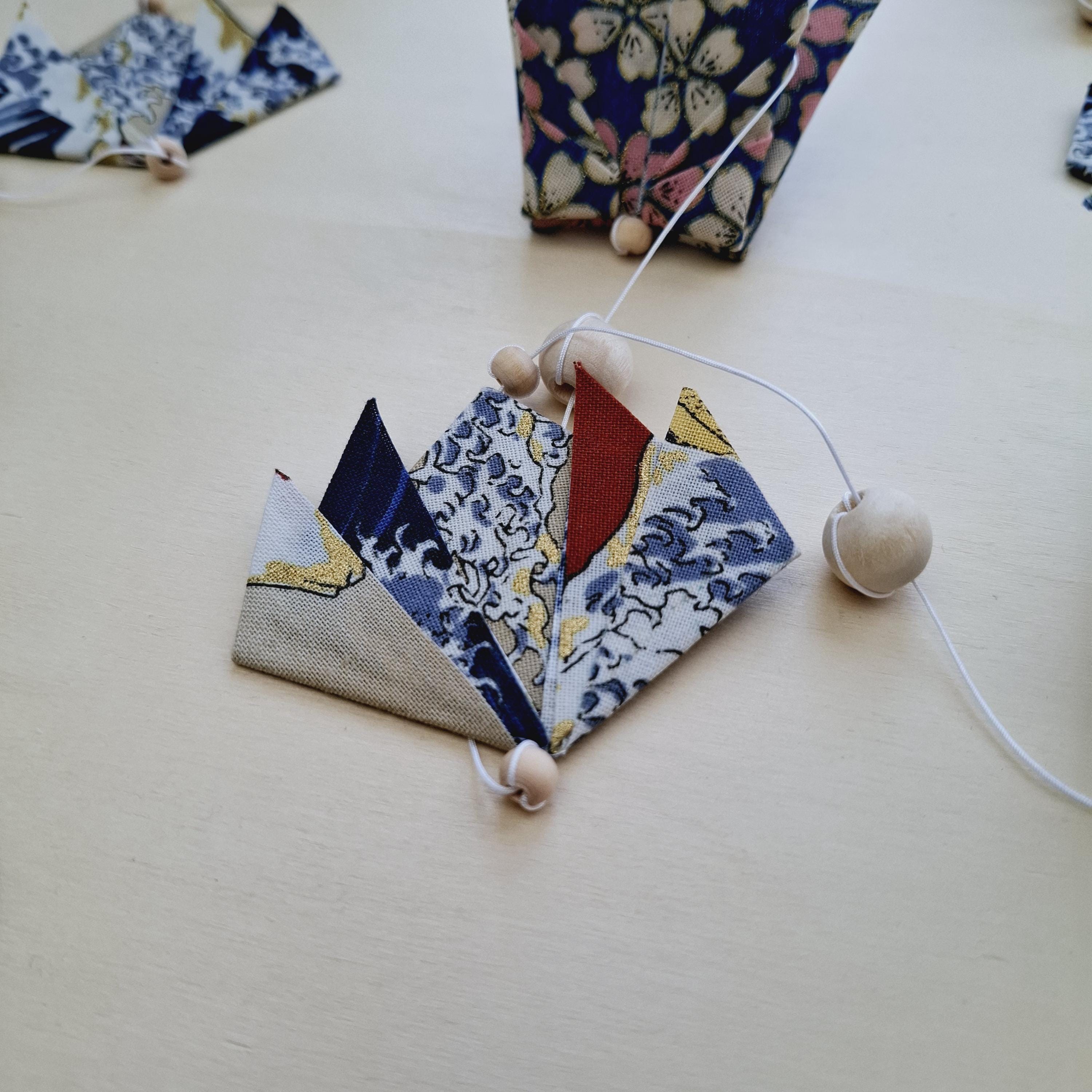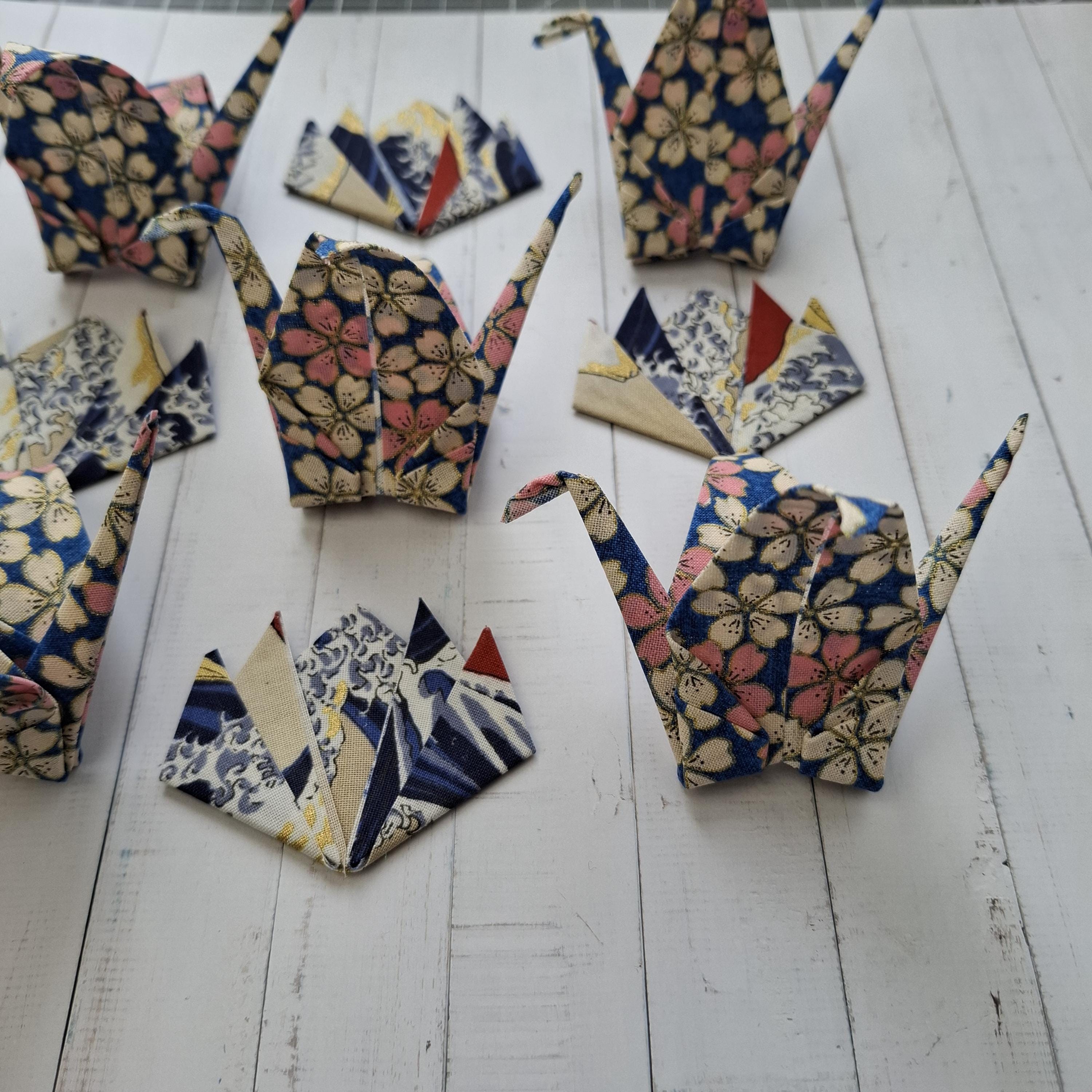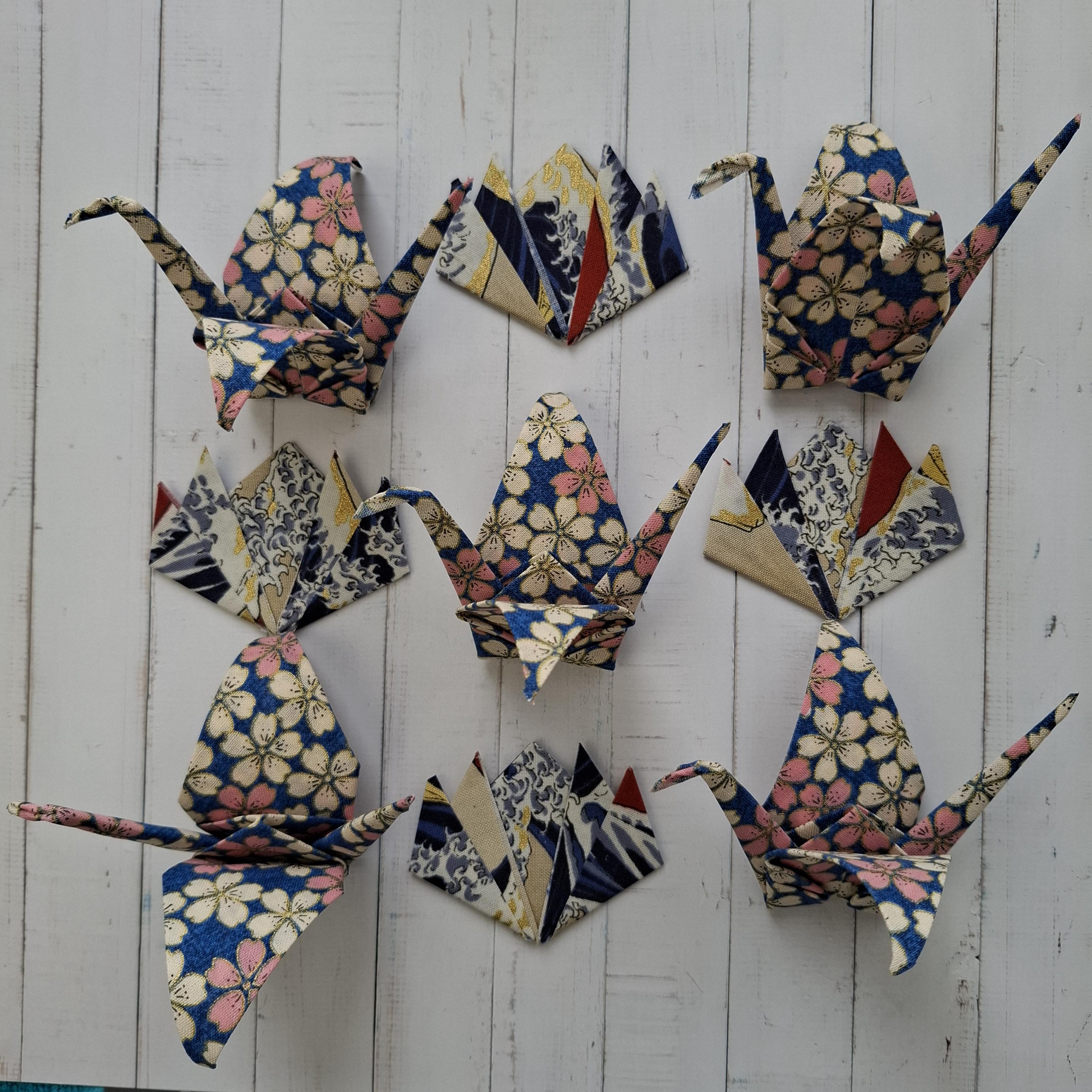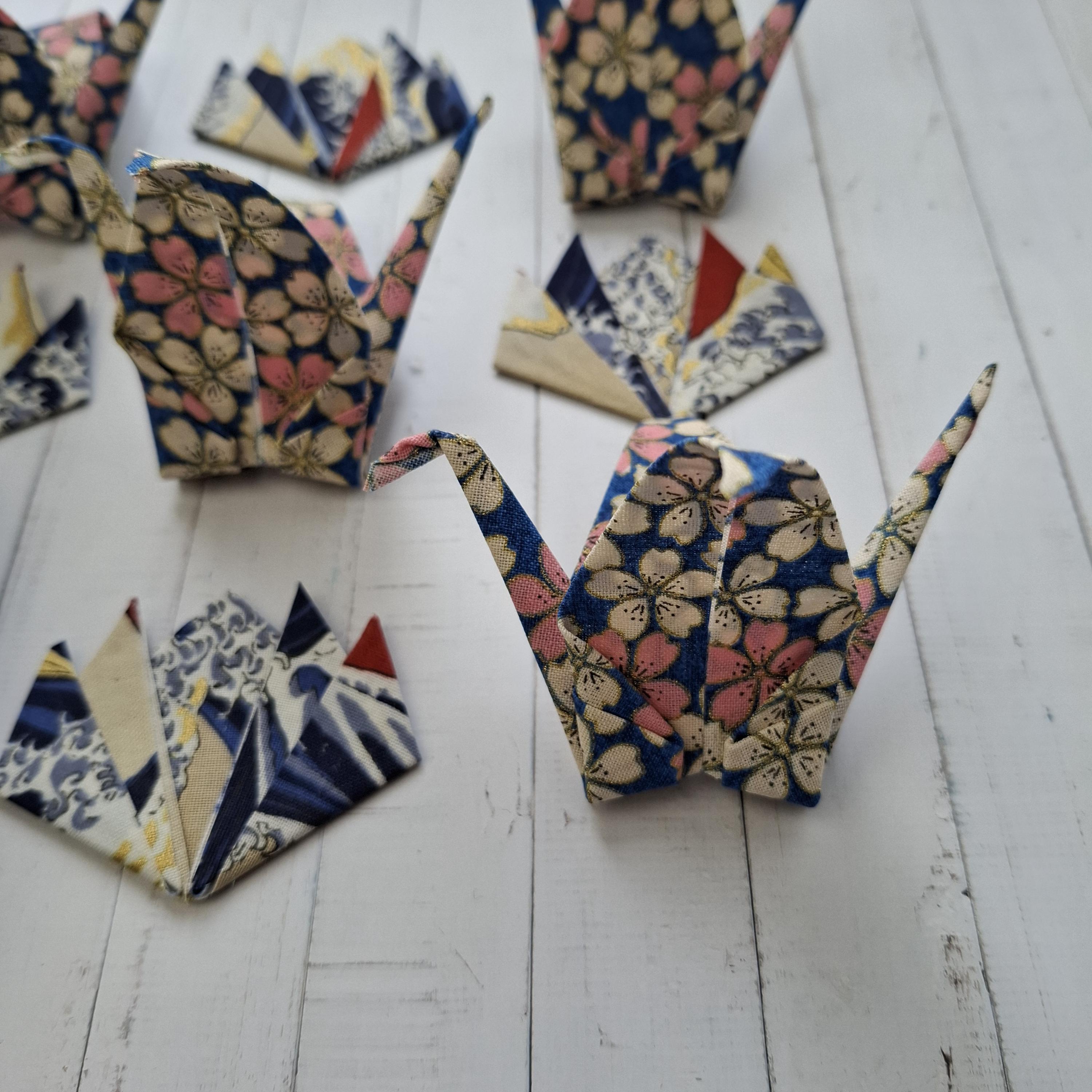 Let yourself be captivated by this delicate origami fabric hanging decoration, adorned with five cranes and four lotus flowers in shimmering colors.