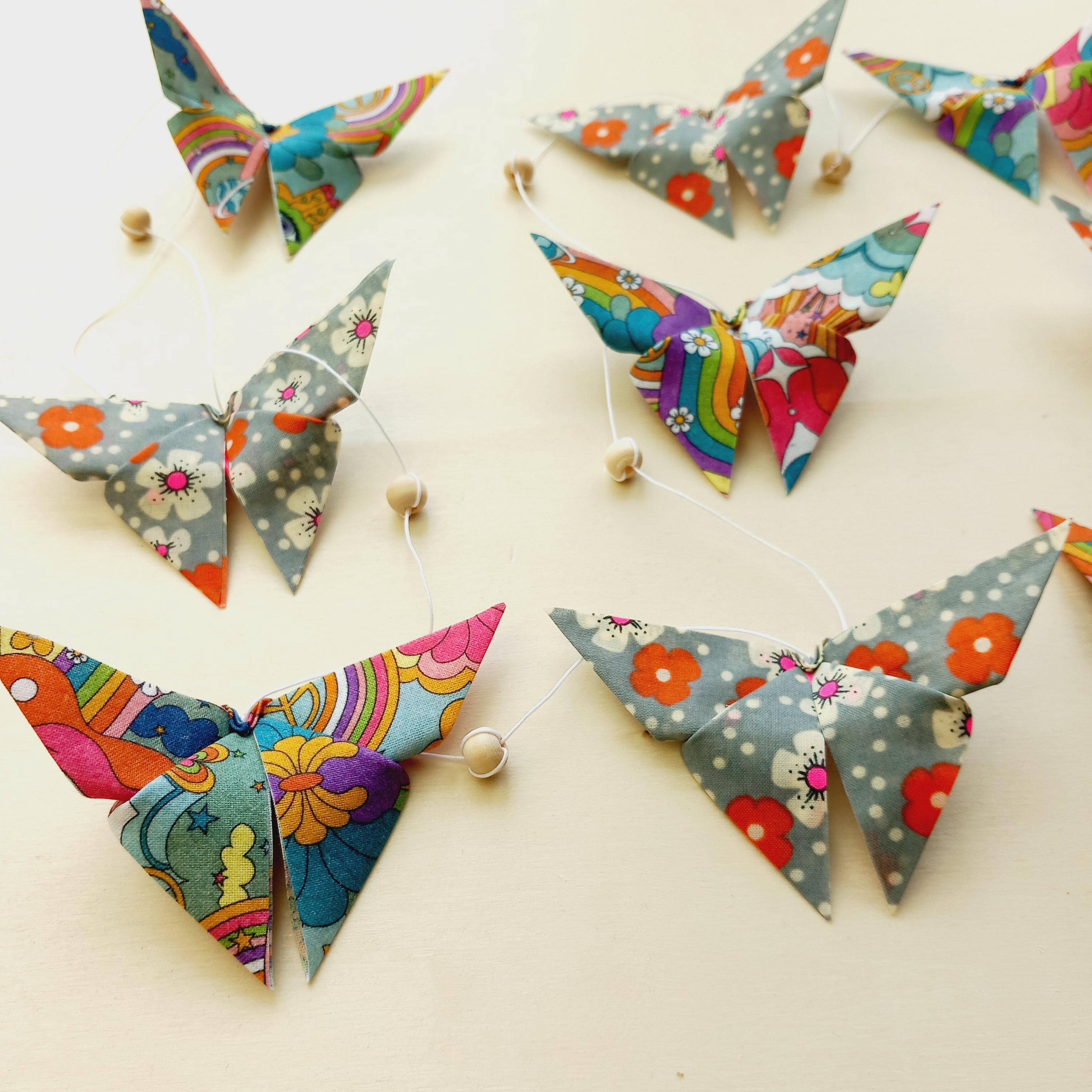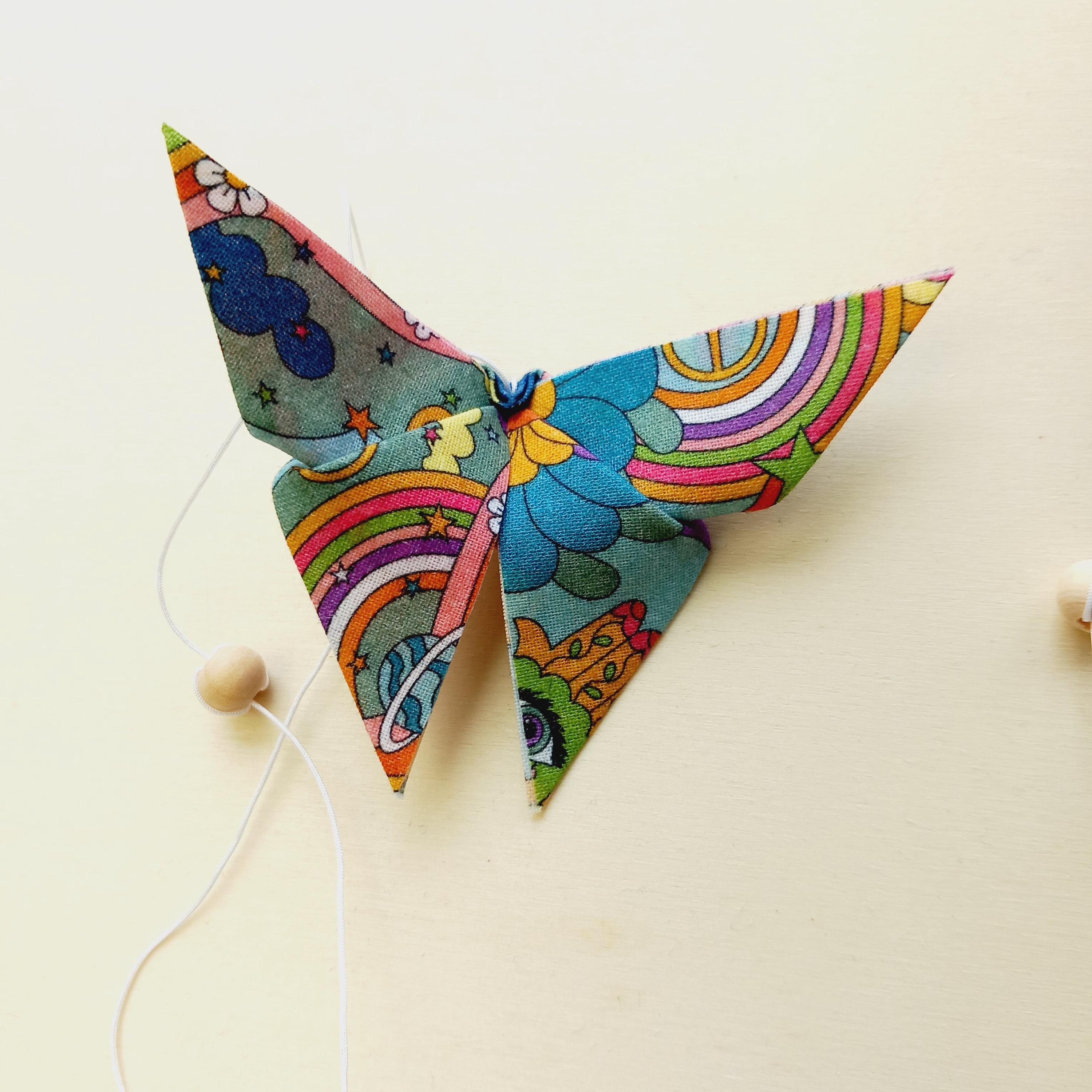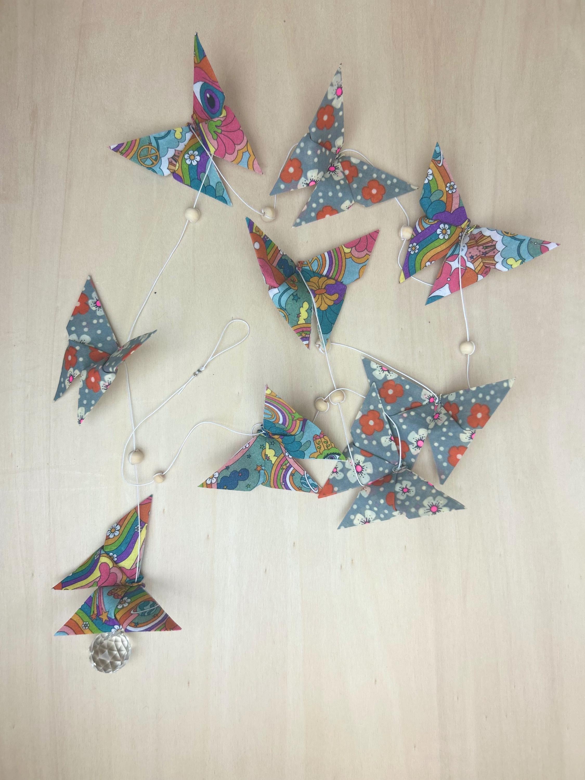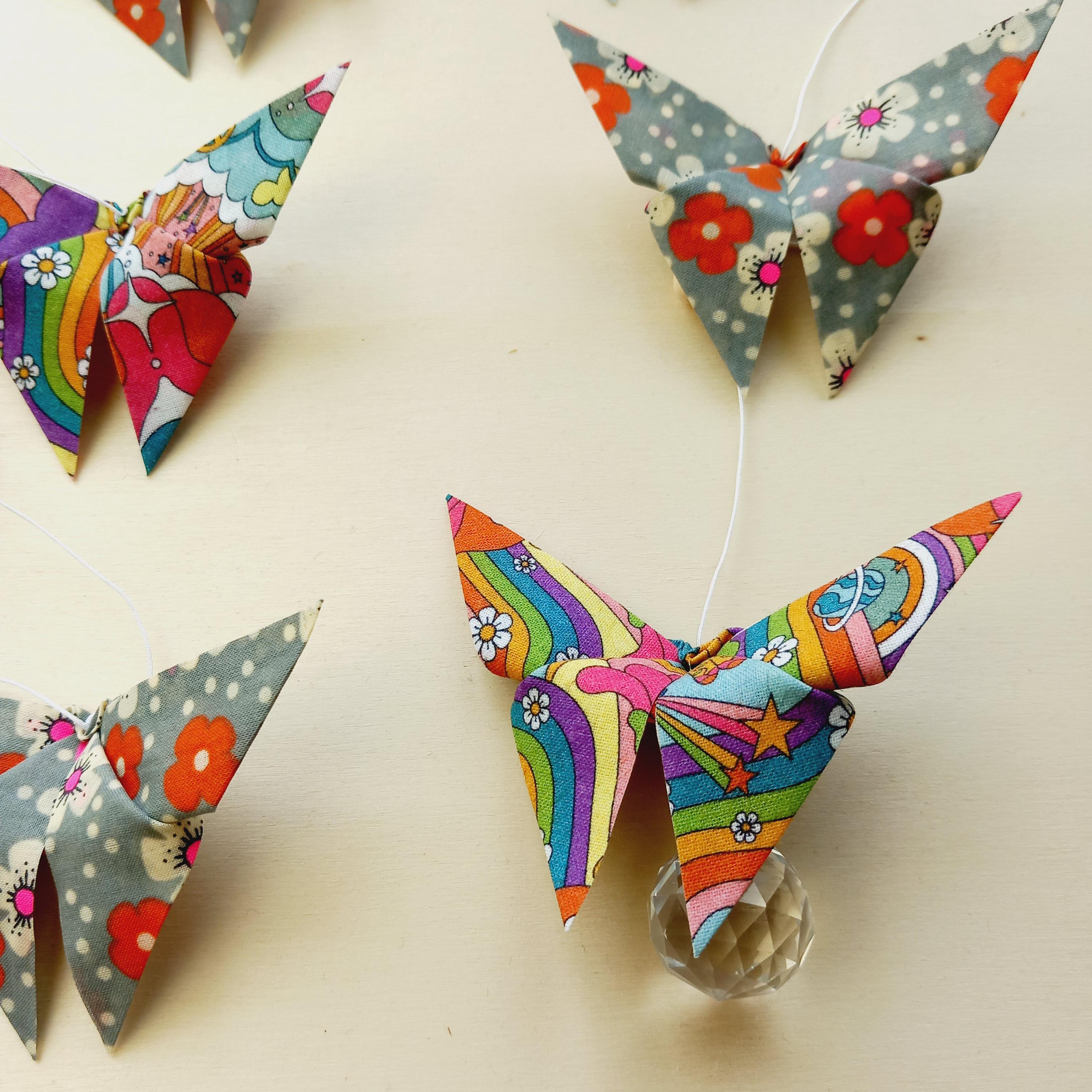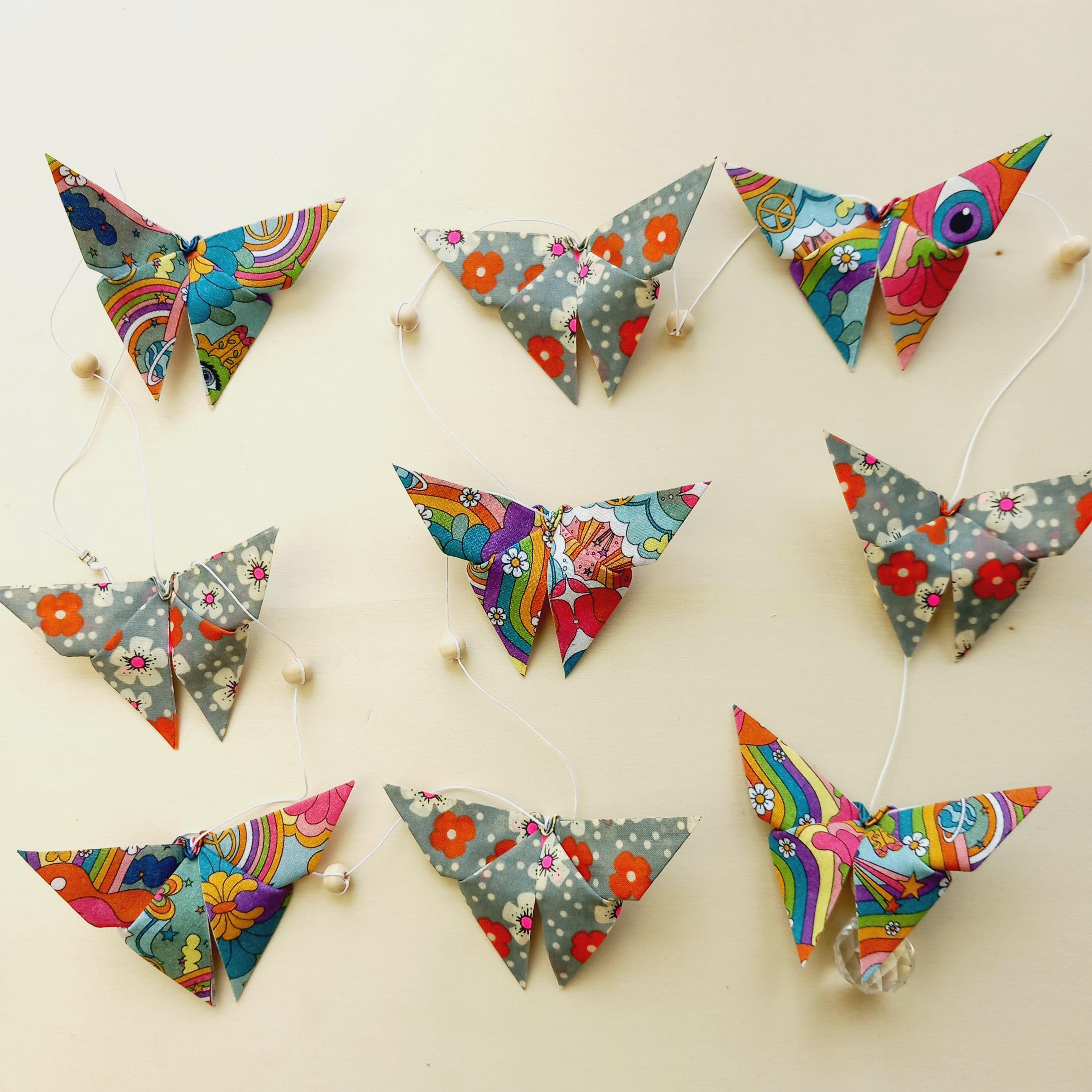 Let yourself be enchanted by this delicate origami fabric pendant, adorned with nine butterflies in shimmering colors.