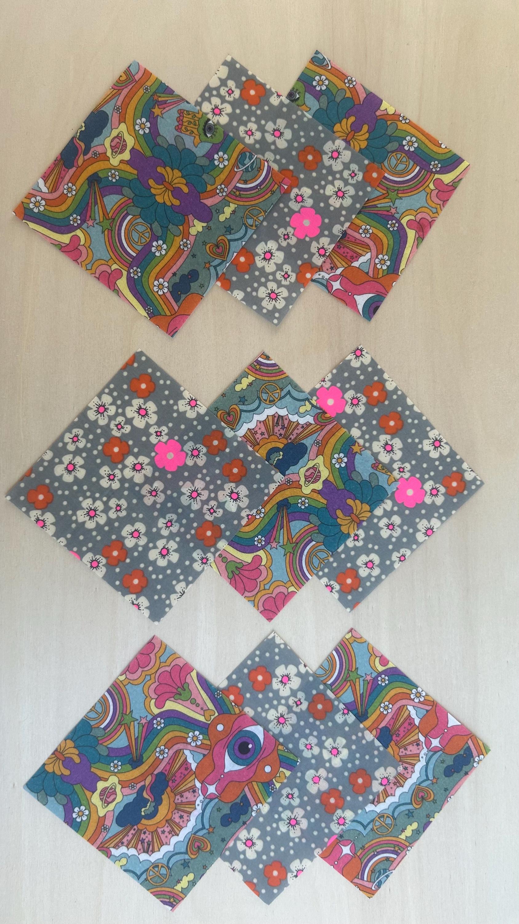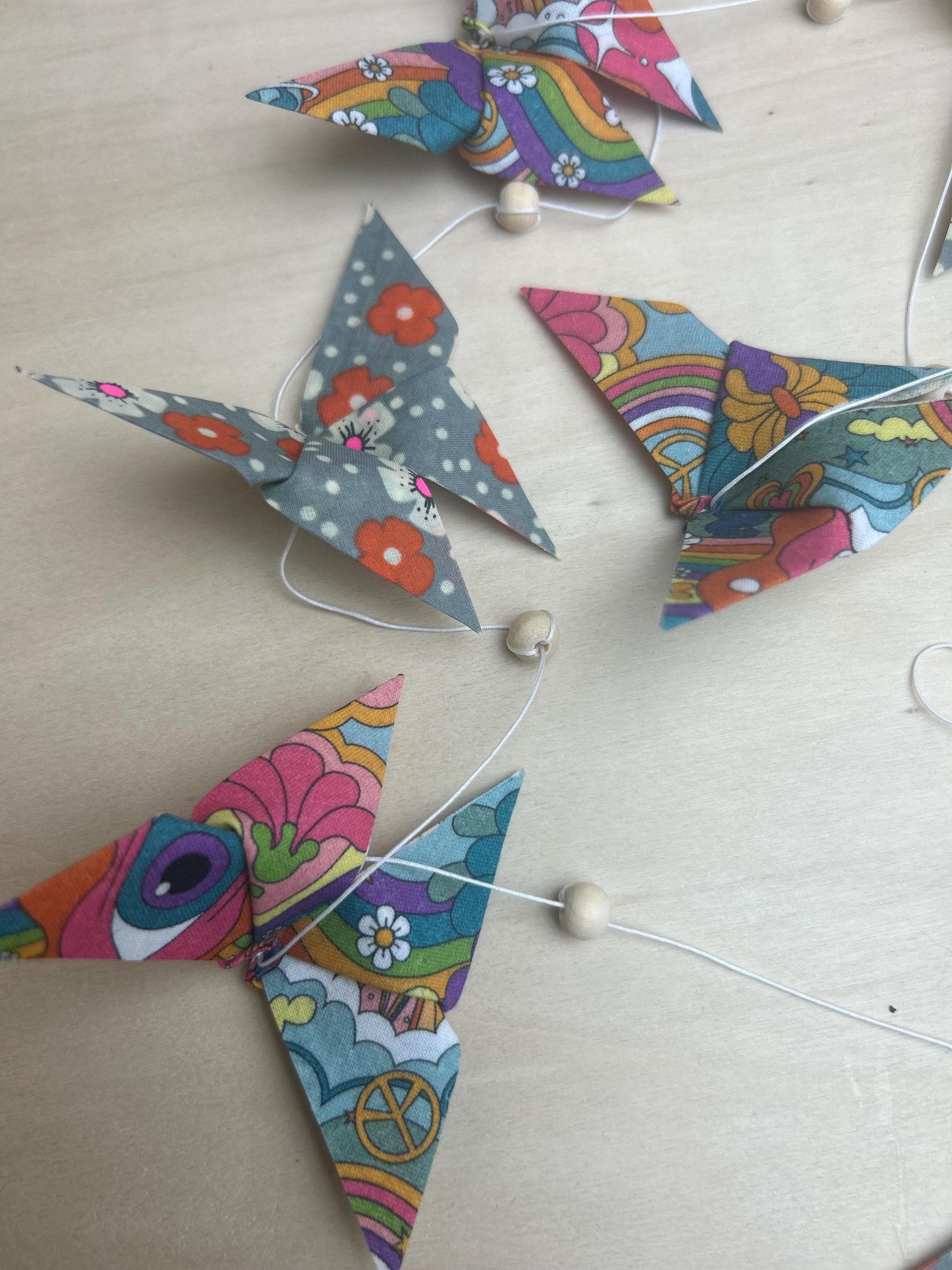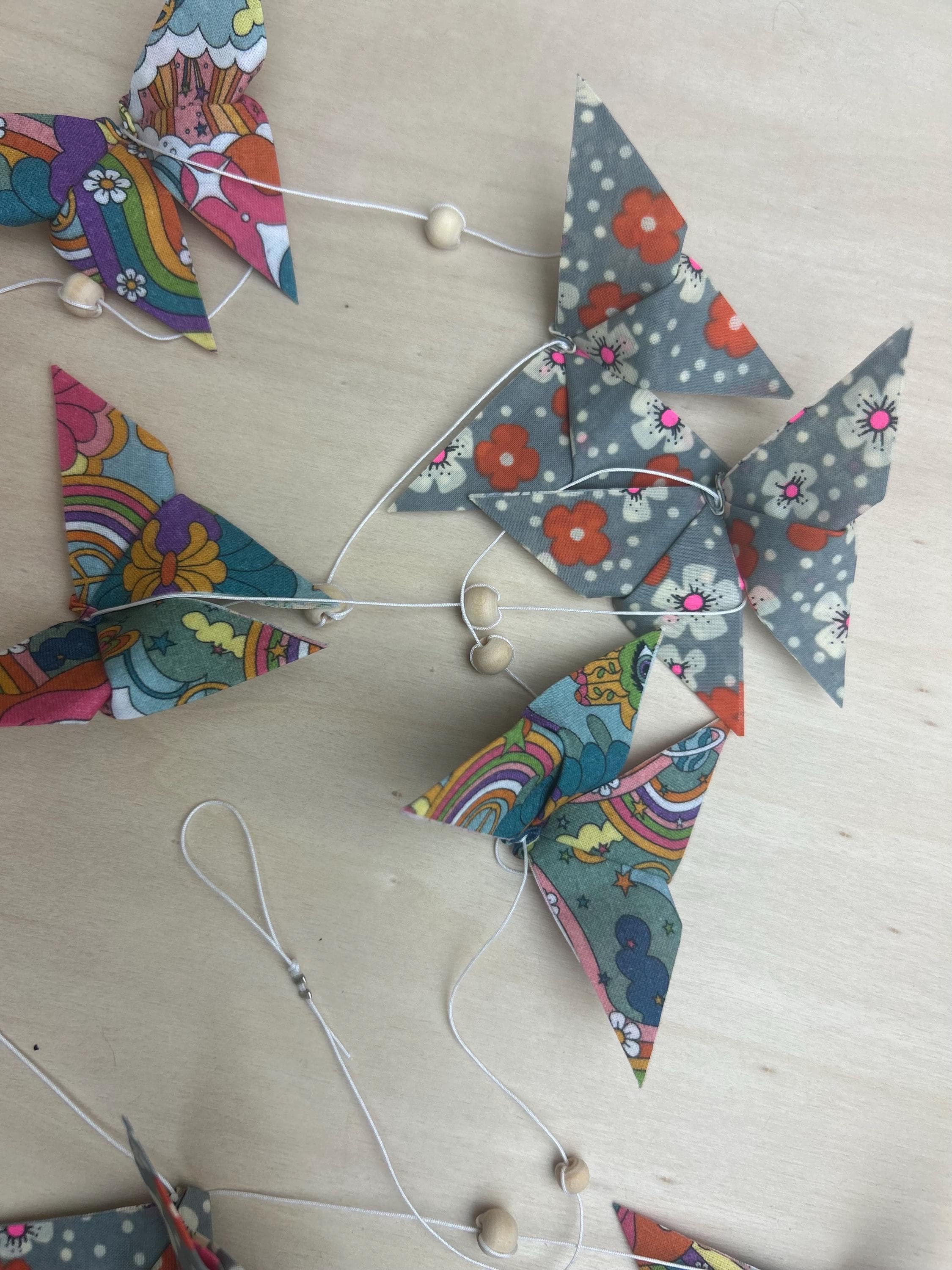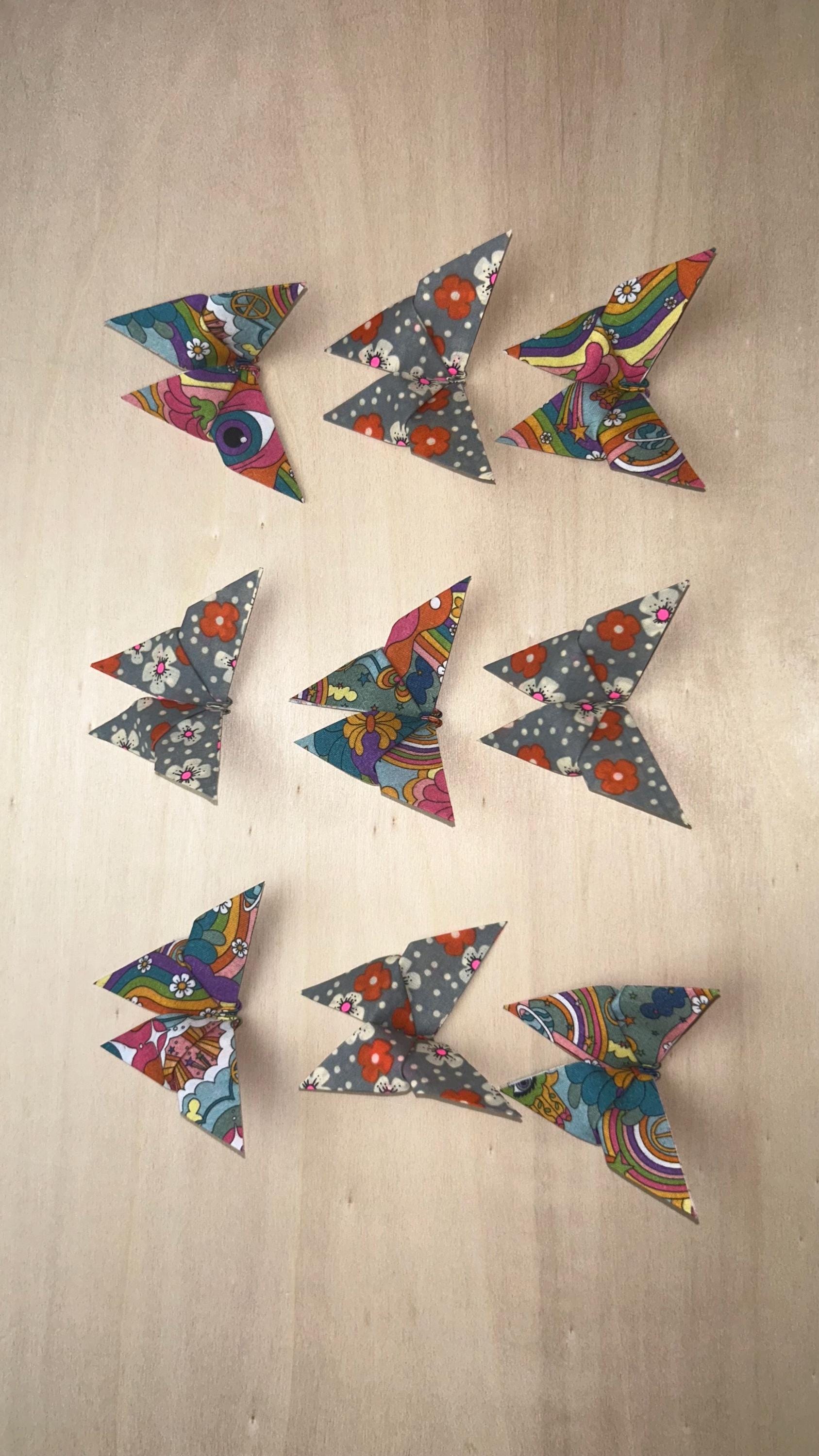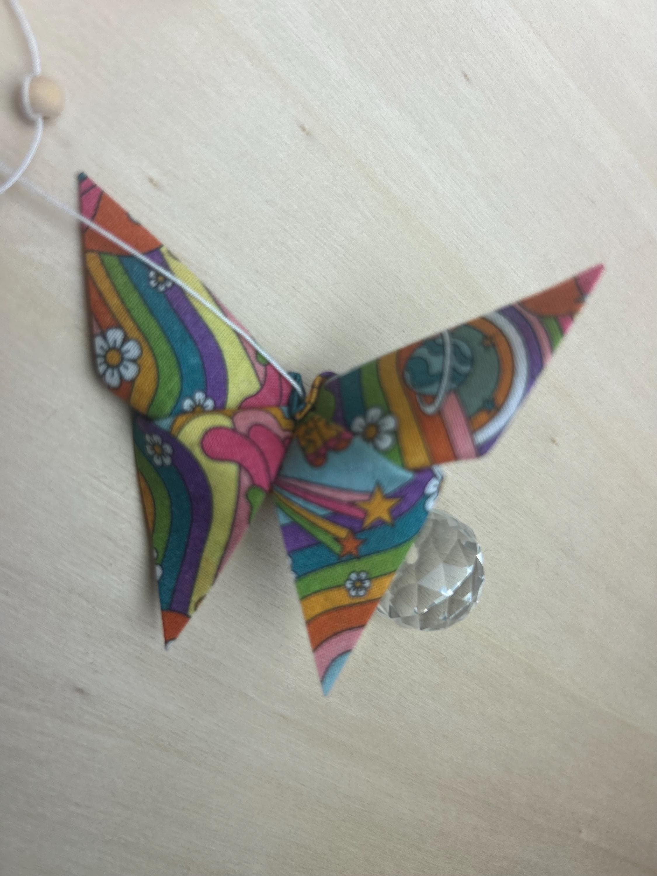 Let yourself be enchanted by this delicate origami fabric pendant, adorned with nine butterflies in shimmering colors.