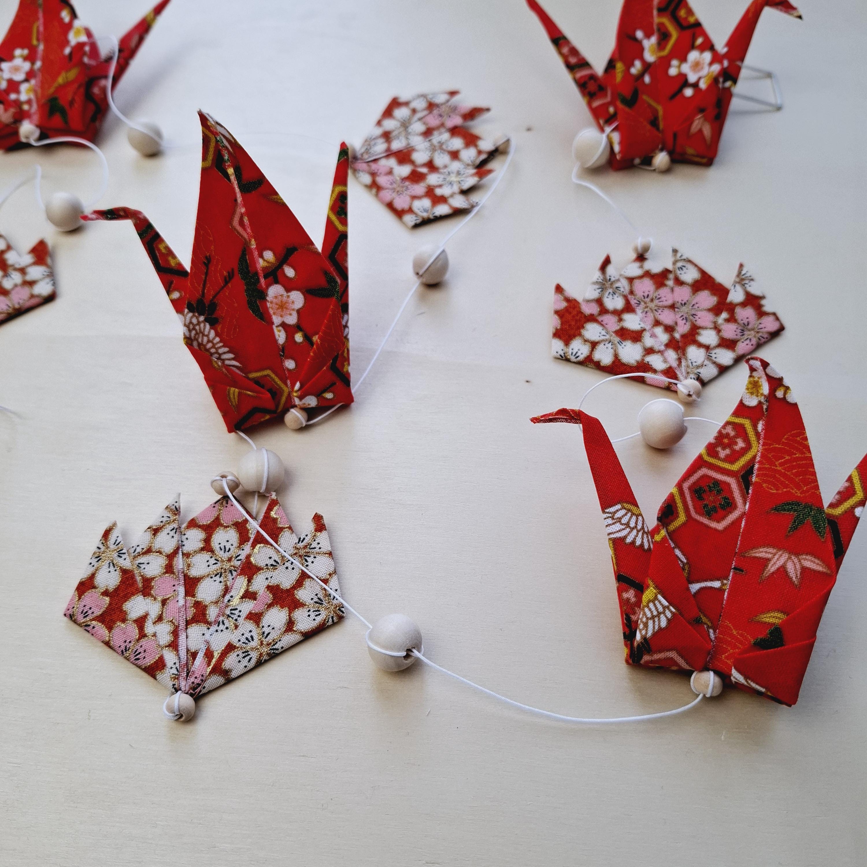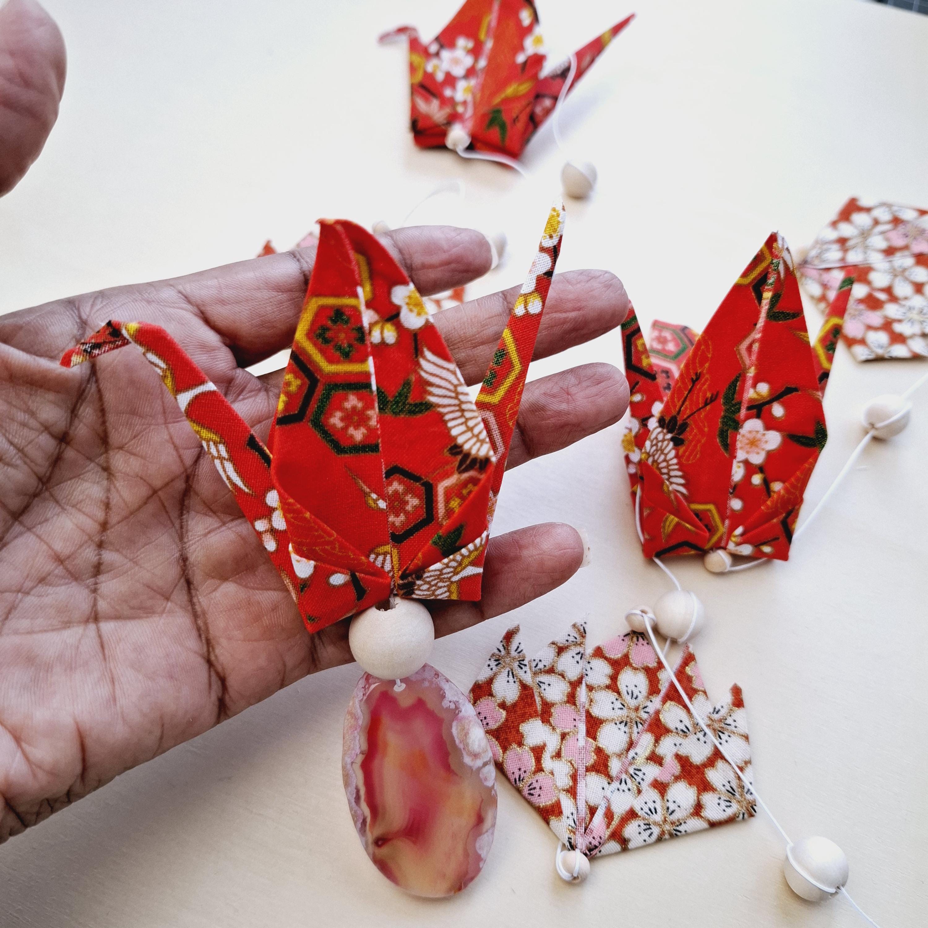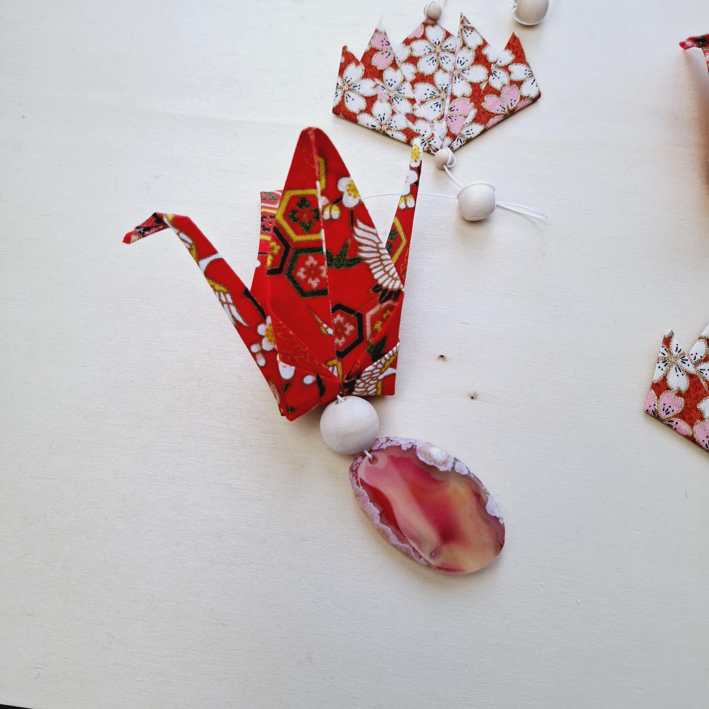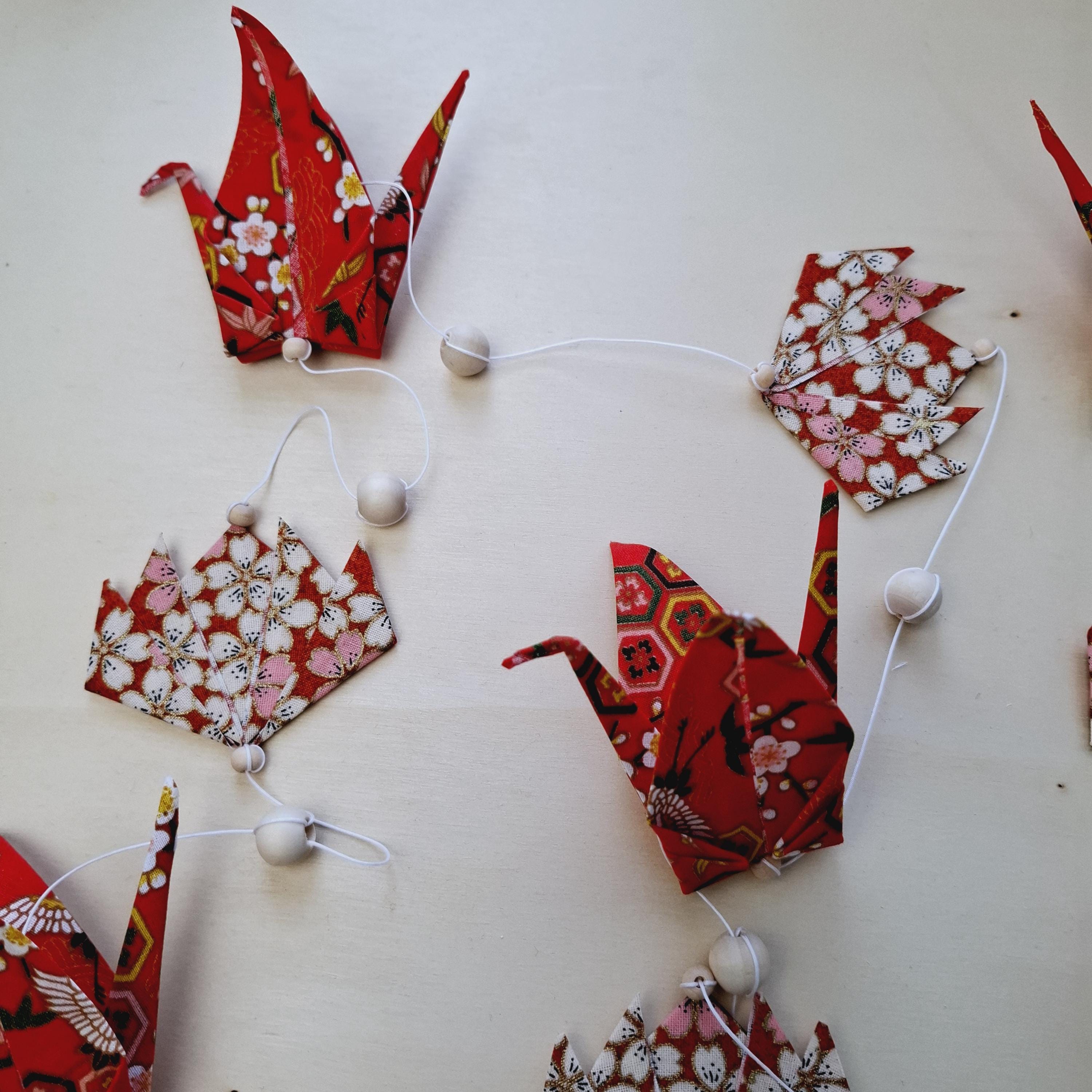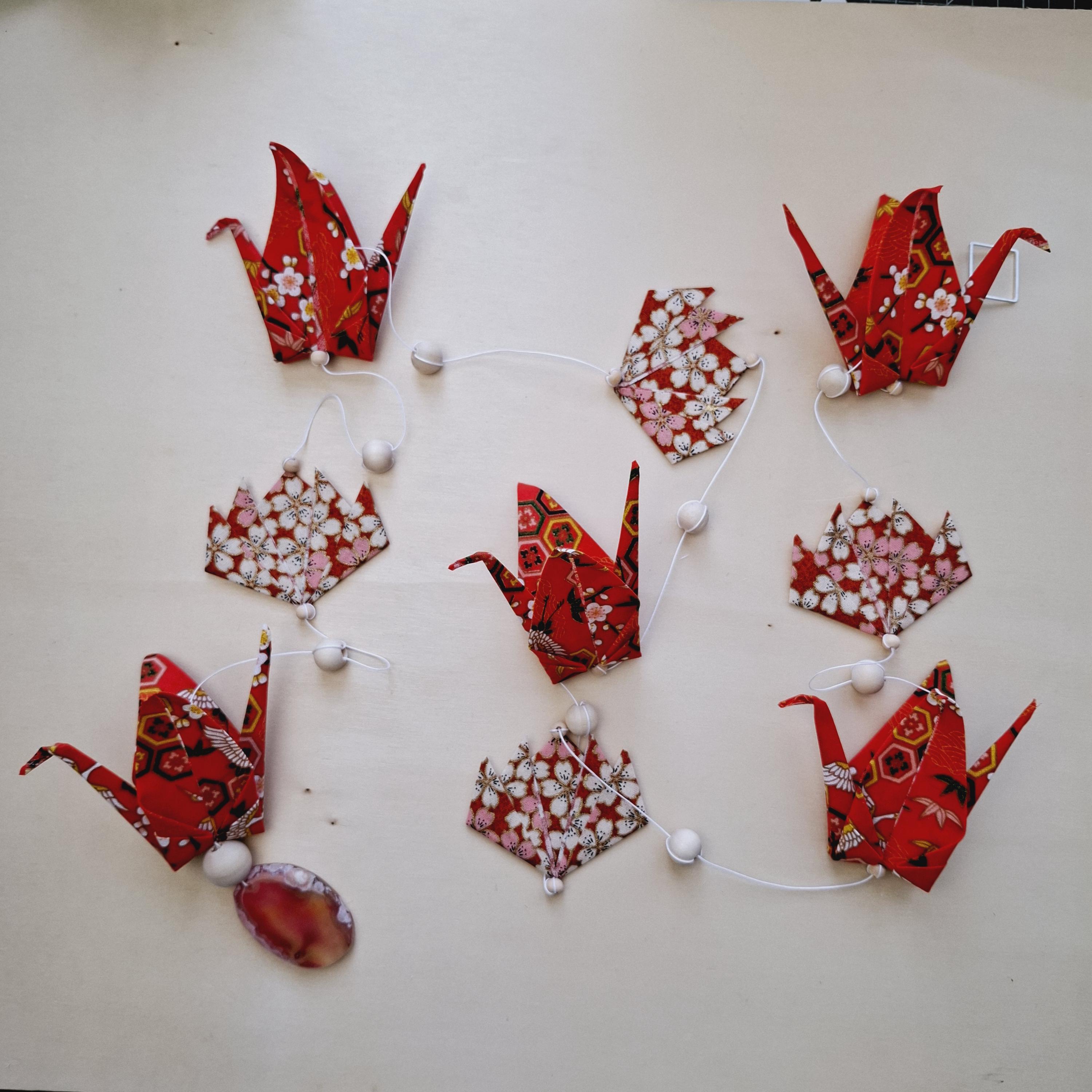 Let yourself be captivated by this delicate origami fabric hanging decoration, adorned with five cranes and four lotus flowers in shimmering colors.