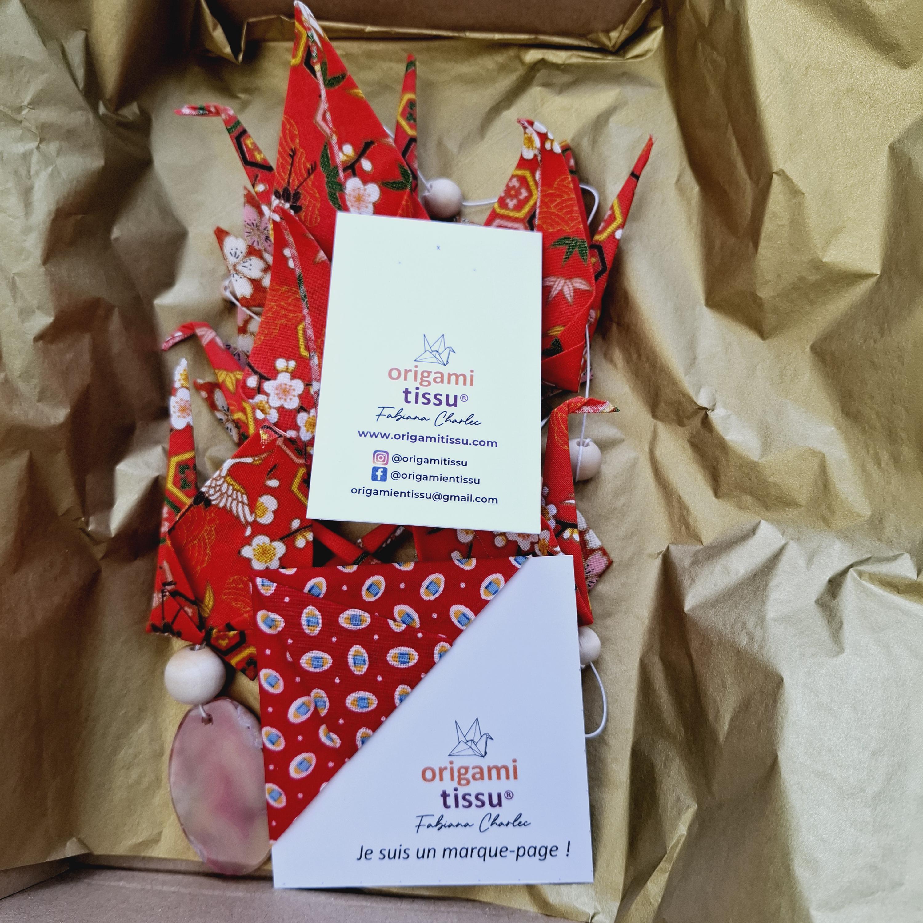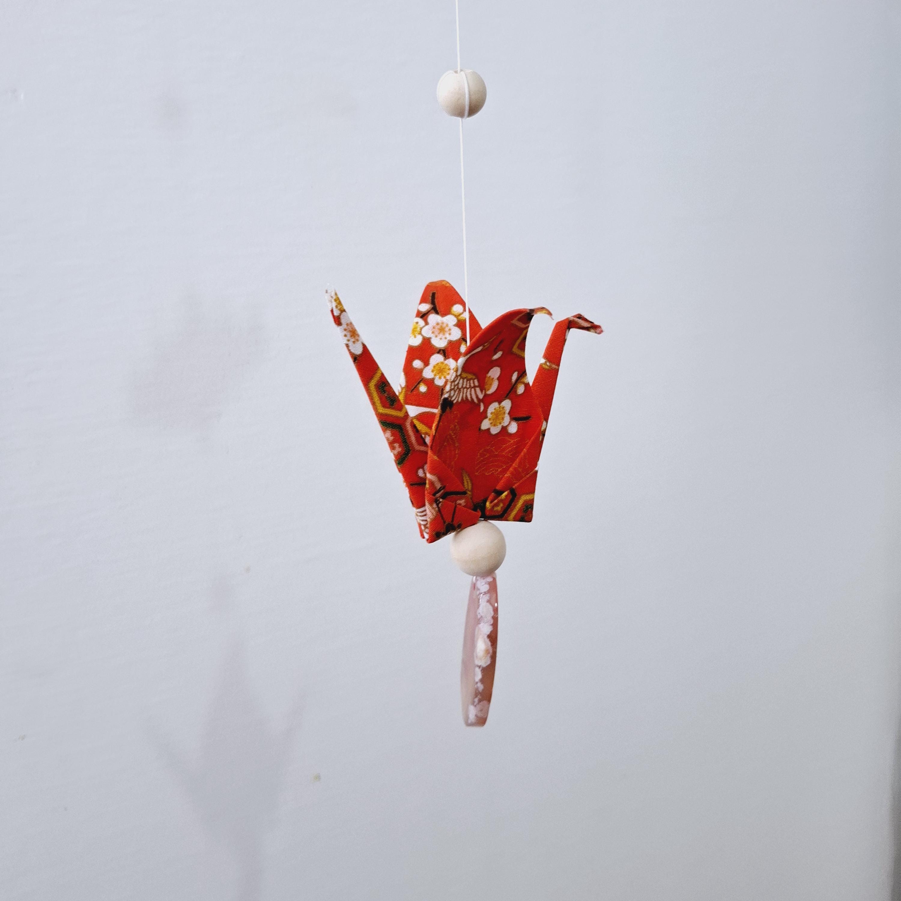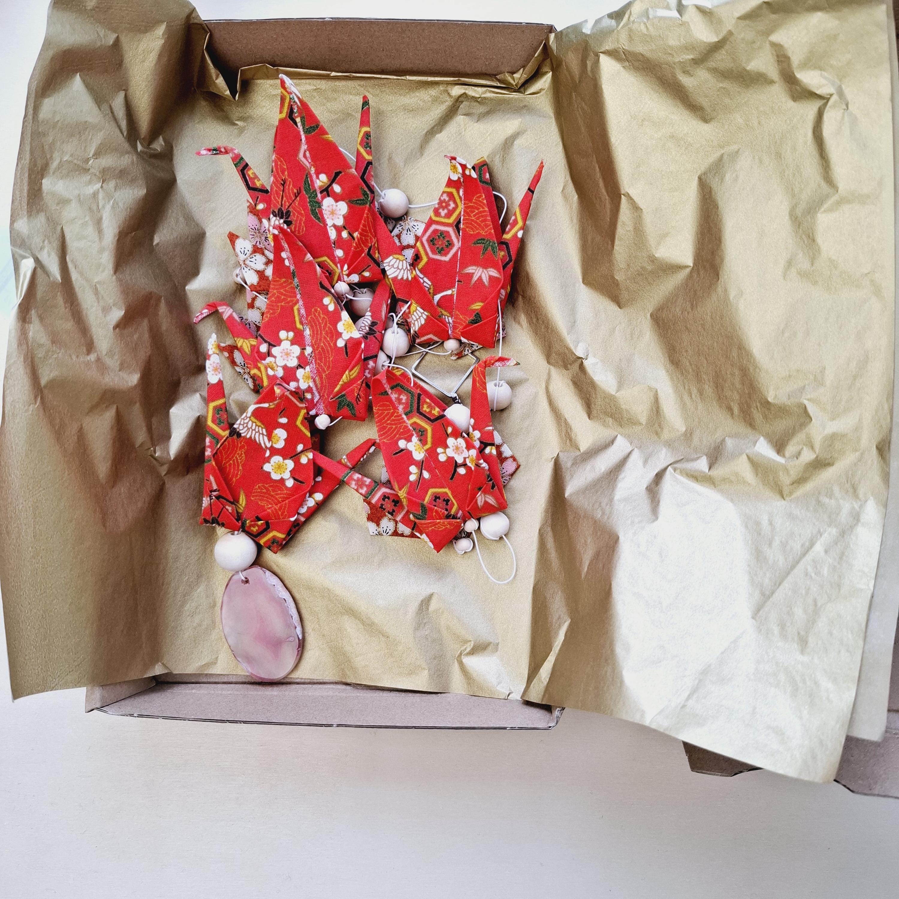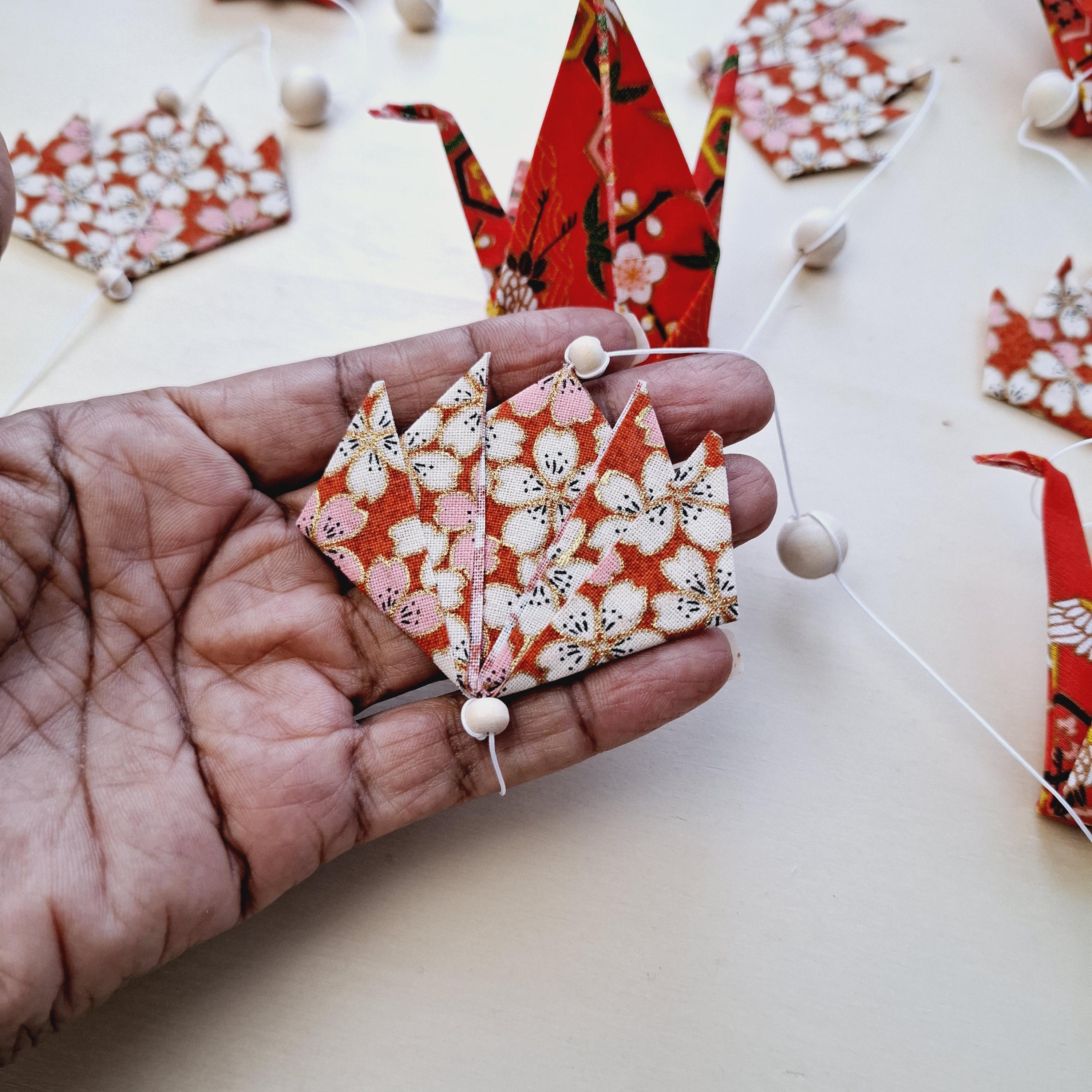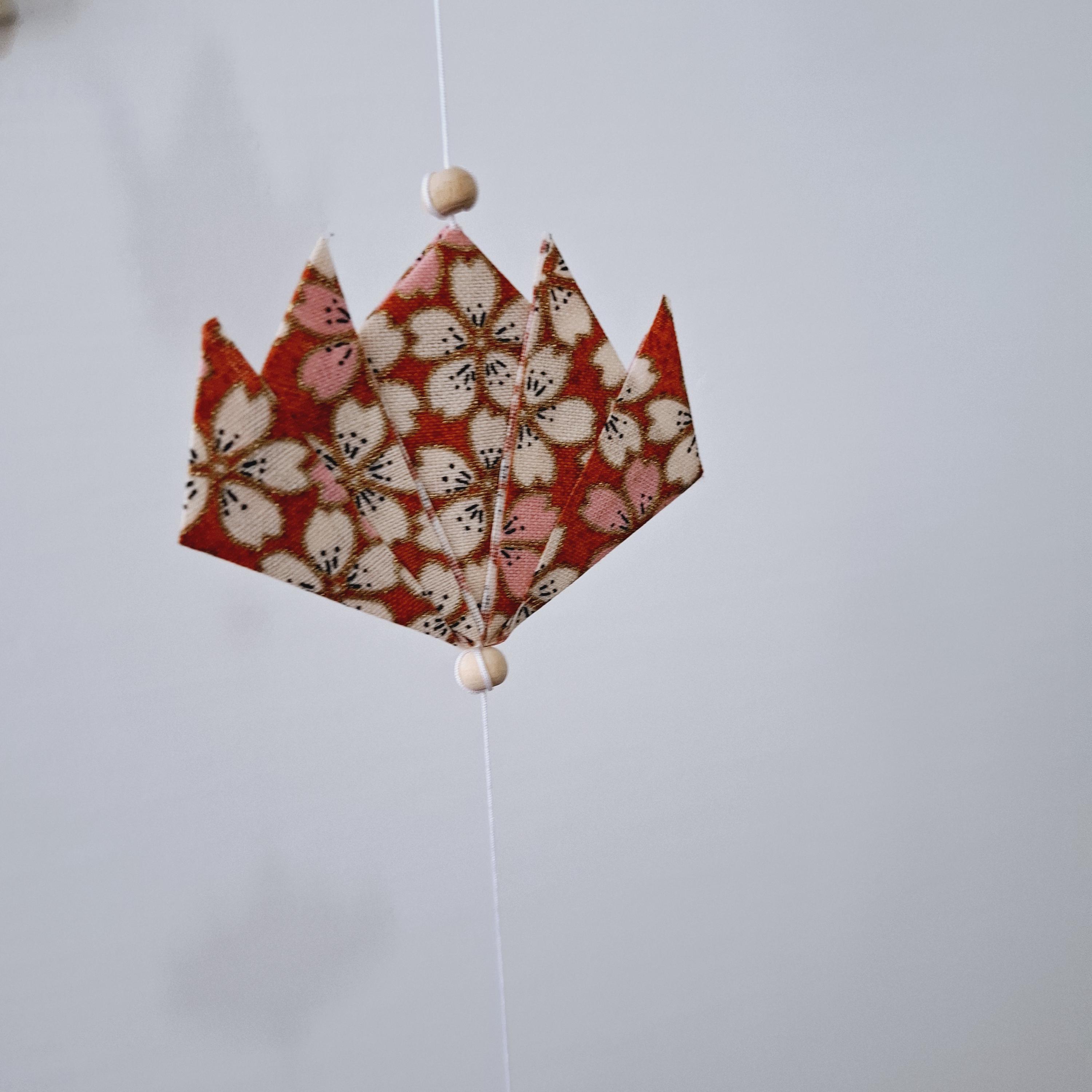 Let yourself be captivated by this delicate origami fabric hanging decoration, adorned with five cranes and four lotus flowers in shimmering colors.